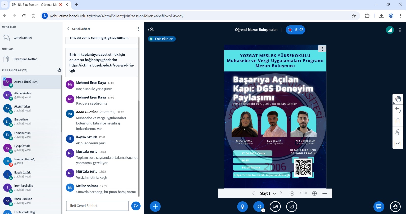 Yozgat Meslek Yüksekokulu Muhasebe ve Vergi Uygulamaları Programı tarafından düzenlenen “Başarıya Açılan Kapı: DGS Deneyim Paylaşımı” başlıklı mezun buluşması, öğrencilerimizin yoğun ilgisiyle gerçekleştirildi.