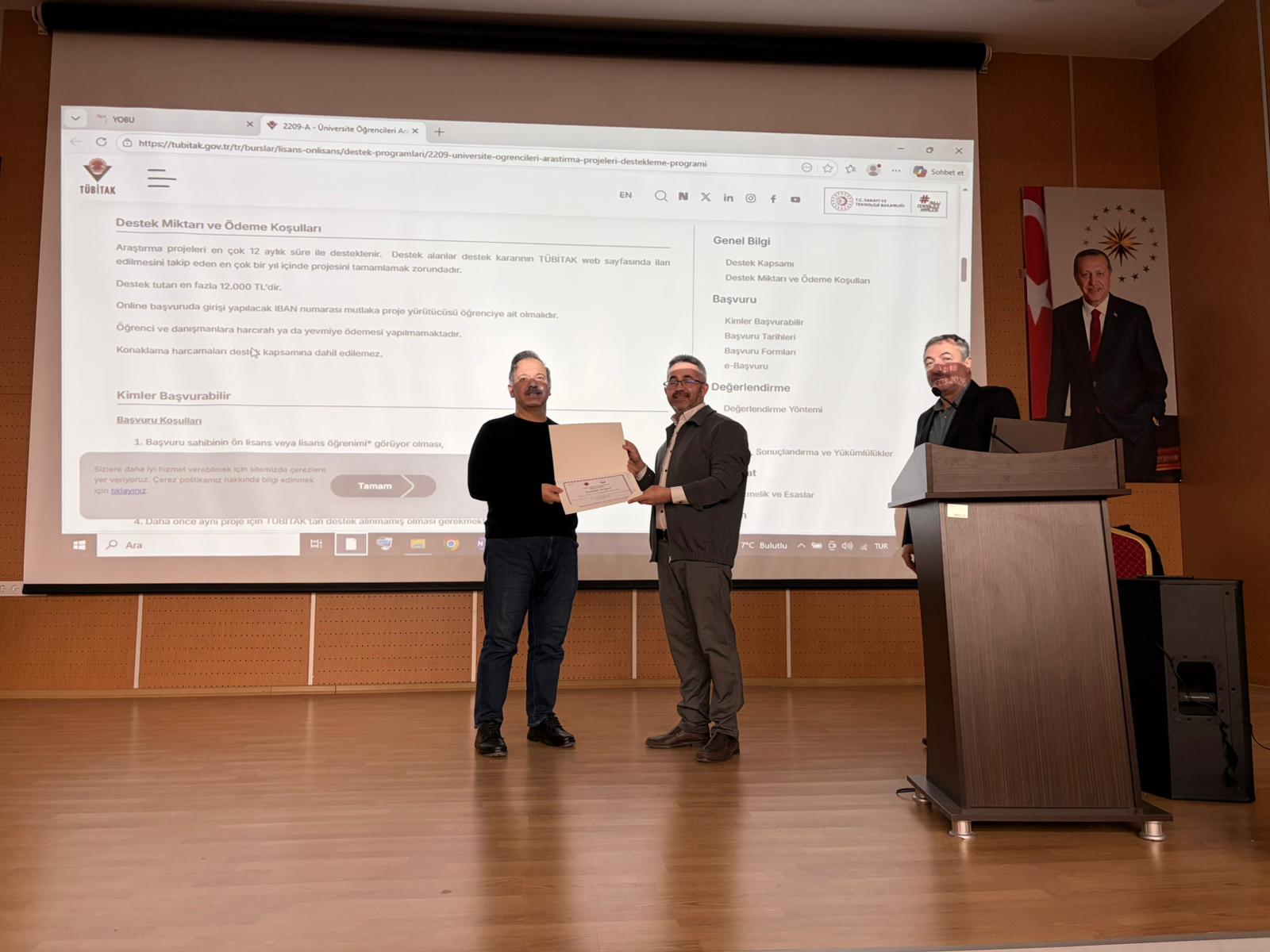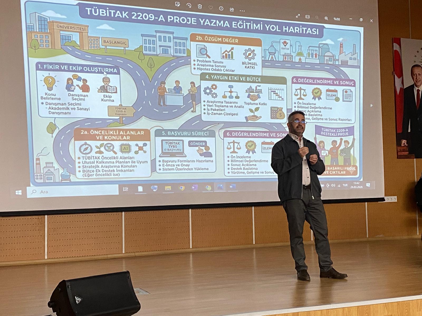 Bölüm başkanımız Doç. Dr. Güngör Karakaş tarafından İlahiyat Fakültesinde 26 Mart 2026 tarihinde saat 13.30’da “İlahiyat Alanında Proje Hazırlama Süreçleri” başlıklı sunum gerçekleştirilmiştir. Sunumda akademik ve uygulamaya dönük önemli değerlendirmelerde bulunuldu. Bilimsel proje üretmenin yalnızca teorik bir çerçeveyle sınırlı olmadığı; aynı zamanda toplumsal ihtiyaçları gözeten, disiplinlerarası bakış açısını içeren ve sürdürülebilir çıktılar hedefleyen bir süreç olduğu vurgulandı. Doç. Dr. Karakaş, özellikle TÜBİTAK 2209-A gibi öğrenci projelerine değinerek, proje fikrinin oluşumundan değerlendirme aşamasına kadar geçen süreci sistematik bir yol haritası üzerinden katılımcılarla paylaştı. Sunumda; problem tanımlama, özgün değer ortaya koyma, yöntem belirleme, yaygın etki ve bütçe planlama gibi temel aşamalar ayrıntılı biçimde ele alındı. Ayrıca akademik yazımda dikkat edilmesi gereken hususlar ve hakem değerlendirme süreçlerine nasıl etkin şekilde cevap verilebileceği konusunda pratik öneriler sunuldu. Teorik bilginin somut örneklerle desteklendiği etkinlikte öğrencilerin aktif katılımı teşvik edildi. Katılımcılar, proje hazırlama sürecine dair sorularını doğrudan yöneltme imkânı bulurken, akademik üretimin ortak bir düşünme ve geliştirme pratiği olduğuna dair farkındalık kazandılar.