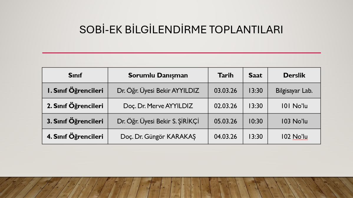 Bölümümüz öğrencilerine yönelik SOBİ-EK Sertifika Programı bilgilendirme toplantıları düzenlenecektir. Tüm öğrencilerimizin akademik danışmanlarının düzenleyeceği toplantılara katılımını bekliyoruz.