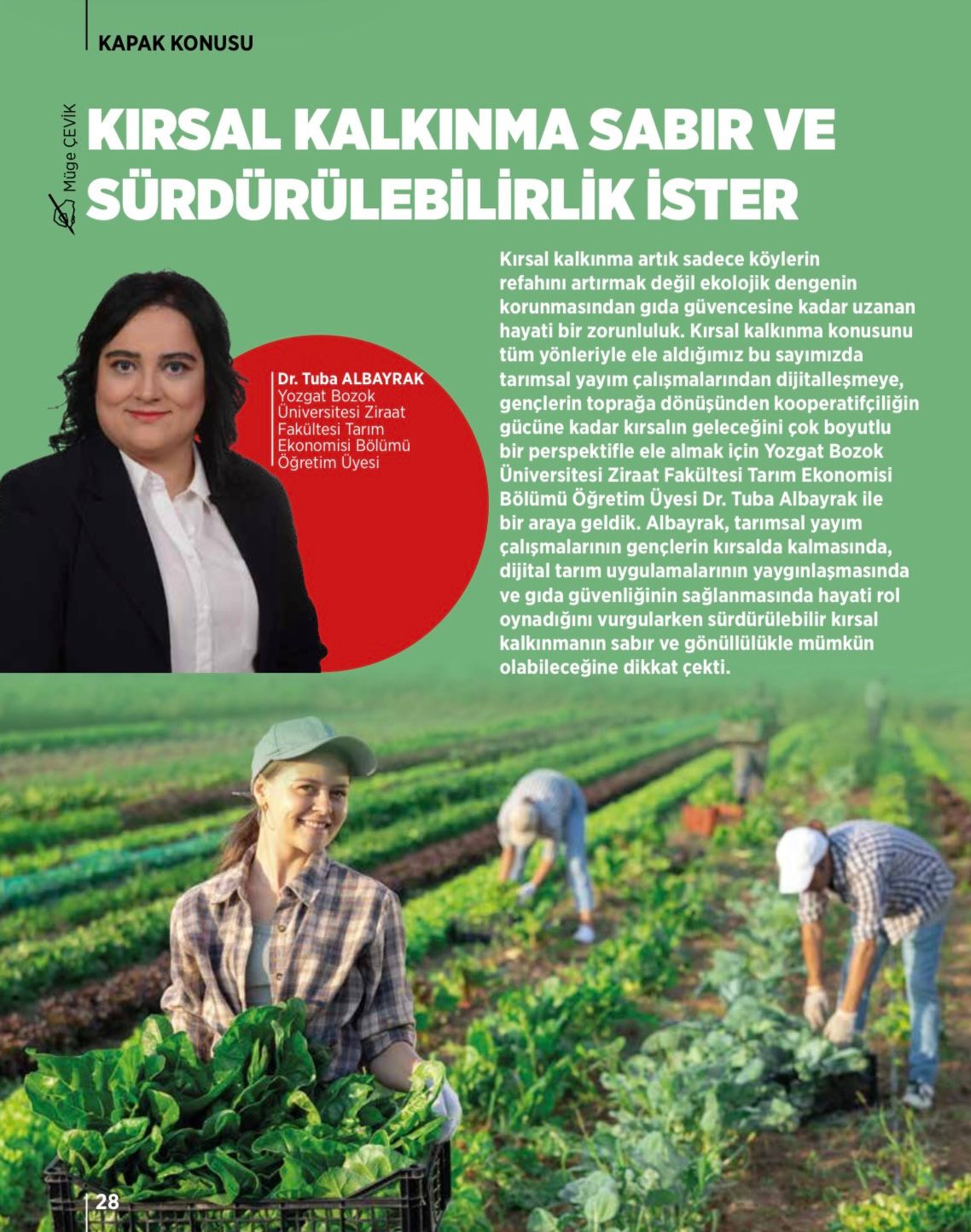 Fakültemiz Tarım Ekonomisi Bölümü Öğretim üyesi Dr. Öğr. Üyesi Tuba ALBAYRAK, Türk Tarım Orman dergisinin Kasım-Aralık 2025 tarihli baskısında Kırsal Kalkınma temasında “Kırsal Kalkınma Sabır ve Sürdürülebilirlik İster” başlıklı konuyu ele almıştır. Yazının tamamına Türk Tarım Orman Dergisi'nin resmi web sitesinden ulaşabilirsiniz.