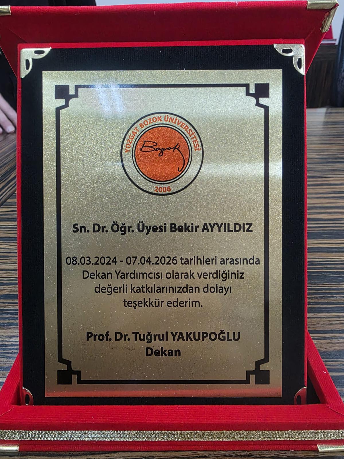 Fakültemizde 08.03.2024 - 07.04.2026 tarihleri arasında Dekan Yardımcılığı görevini yapan Sayın Dr. Öğr. Üyesi Bekir Ayyıldız hocamıza emekleri için teşekkür eder, akademik çalışmalarında başarılar dileriz. DEKANLIK