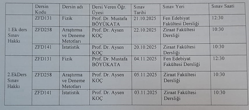 Bitki Koruma Bölümü 16801118025 nolu öğrencisi Furkan ÖZDEMİR'in Ek Ders Sınav Tarihleri