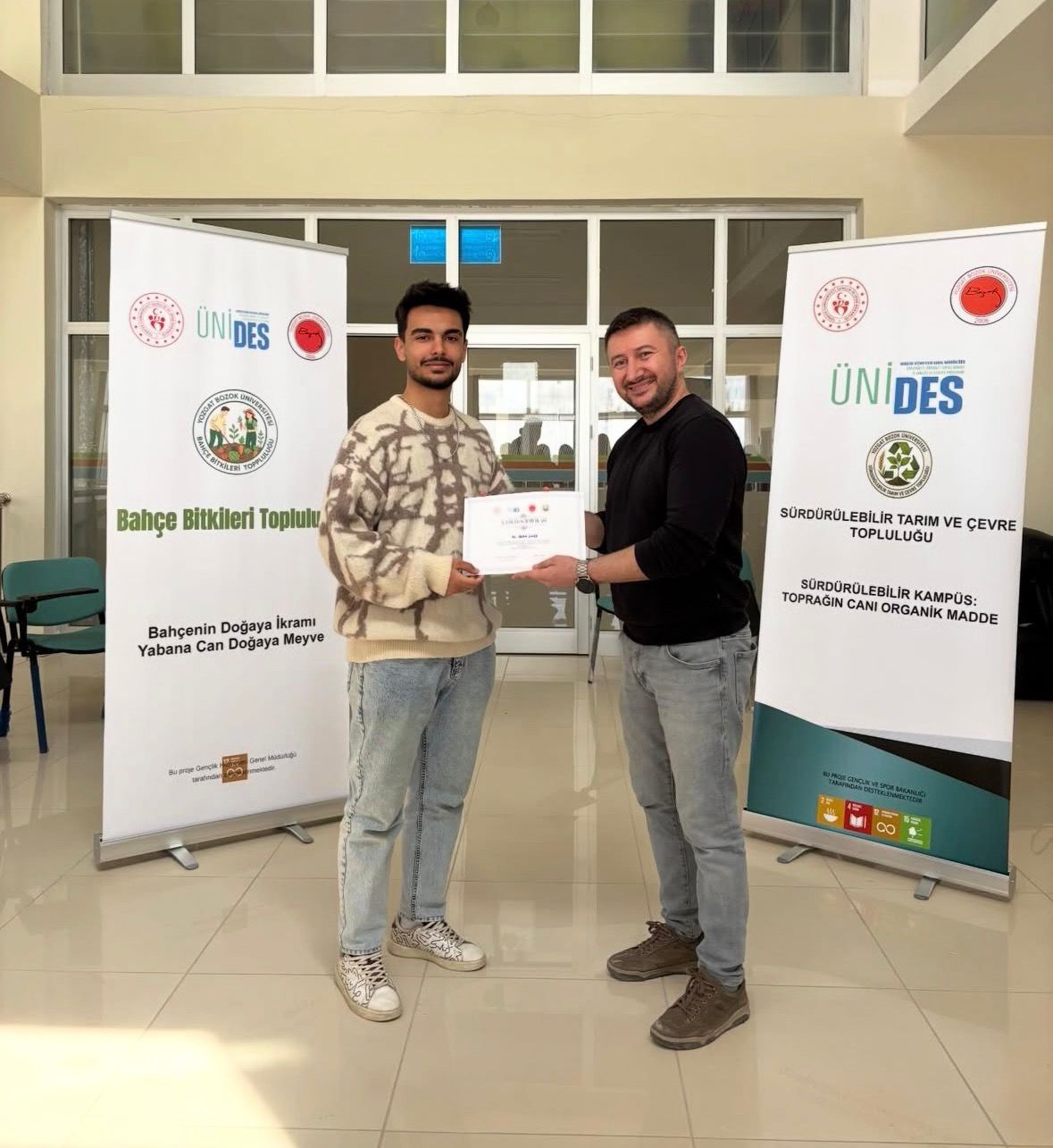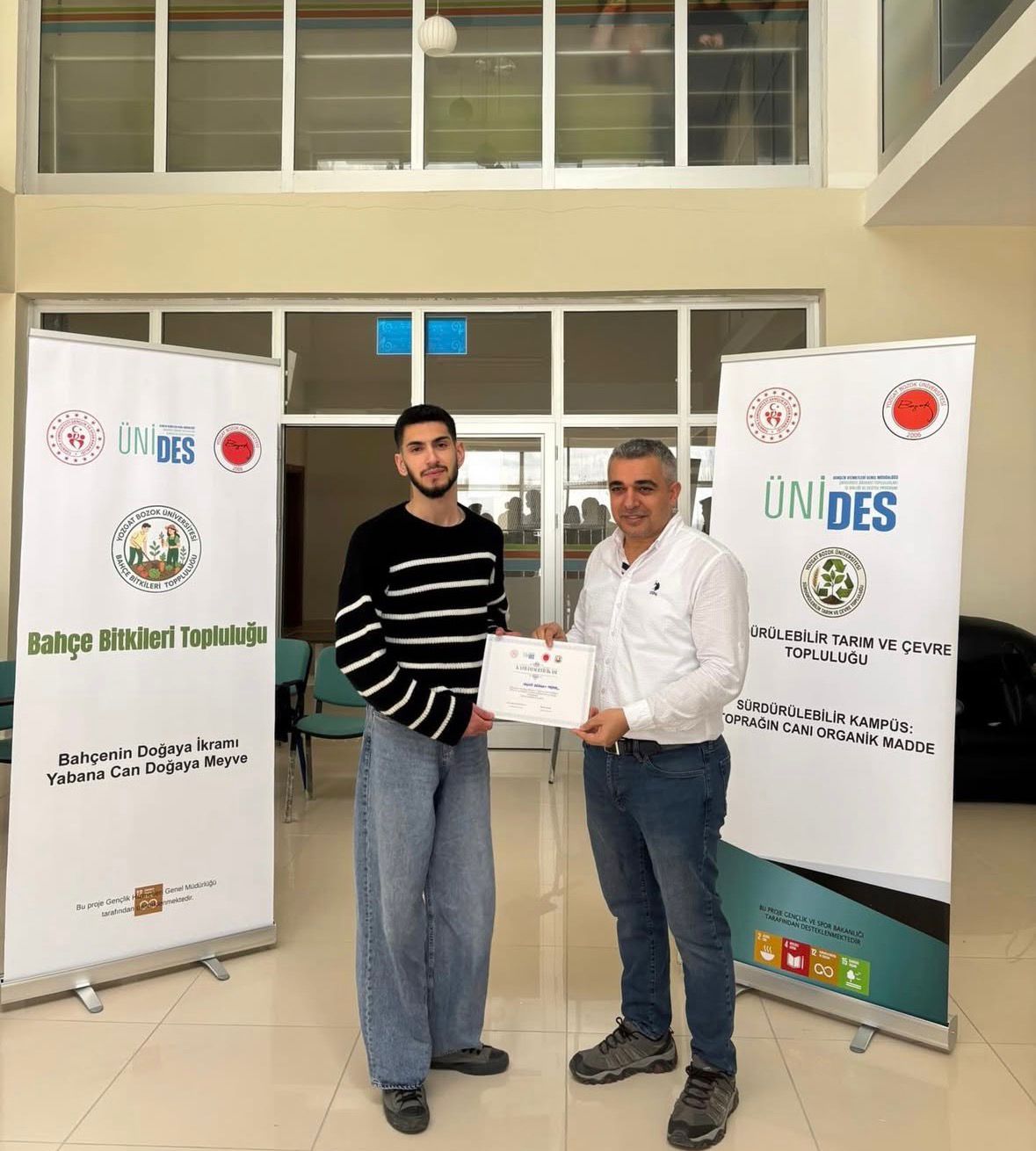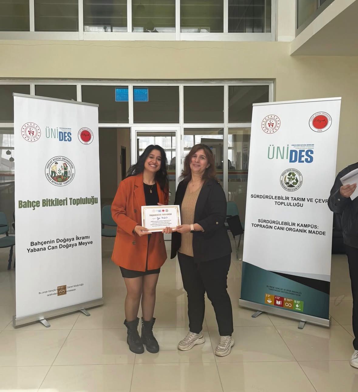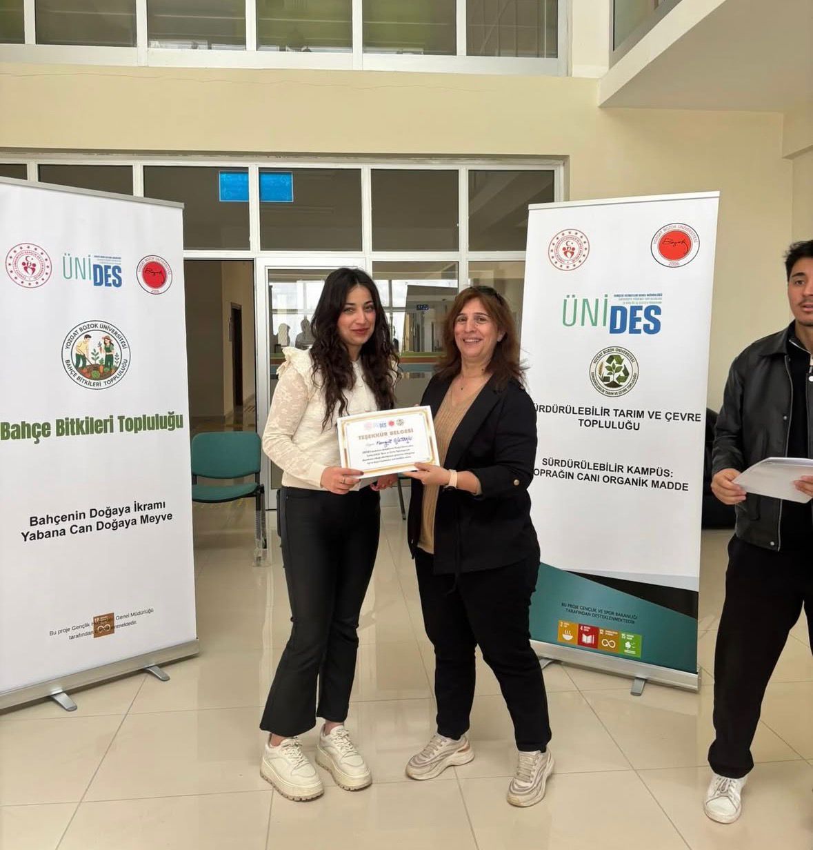 Fakültemizde, ÜNİDES kapsamında desteklenen projeler kapsamında anlamlı bir buluşma gerçekleştirildi. “Sürdürülebilir Tarım ve Çevre Topluluğu” ile “Bahçe Bitkileri Topluluğu” tarafından yürütülen ve kabul edilen projelerin başarısı, Dekanımız Prof. Dr. Tuğrul Yakupoğlu, akademisyenlerimiz ve öğrencilerimizin katılımıyla düzenlenen törende kutlandı. Program kapsamında, projelere katkı sağlayan öğrencilere plaket ve katılım belgeleri takdim edildi. Topluluk danışmanları Doç. Dr. Gökçen Yakupoğlu ve Doç. Dr. Gülden Balcı ile proje yürütücüleri Ömer Ceran ve Mahmut Can Kızılırmak başta olmak üzere, projede emeği geçen tüm öğrencilere belgeleri Dekanımız tarafından verildi.