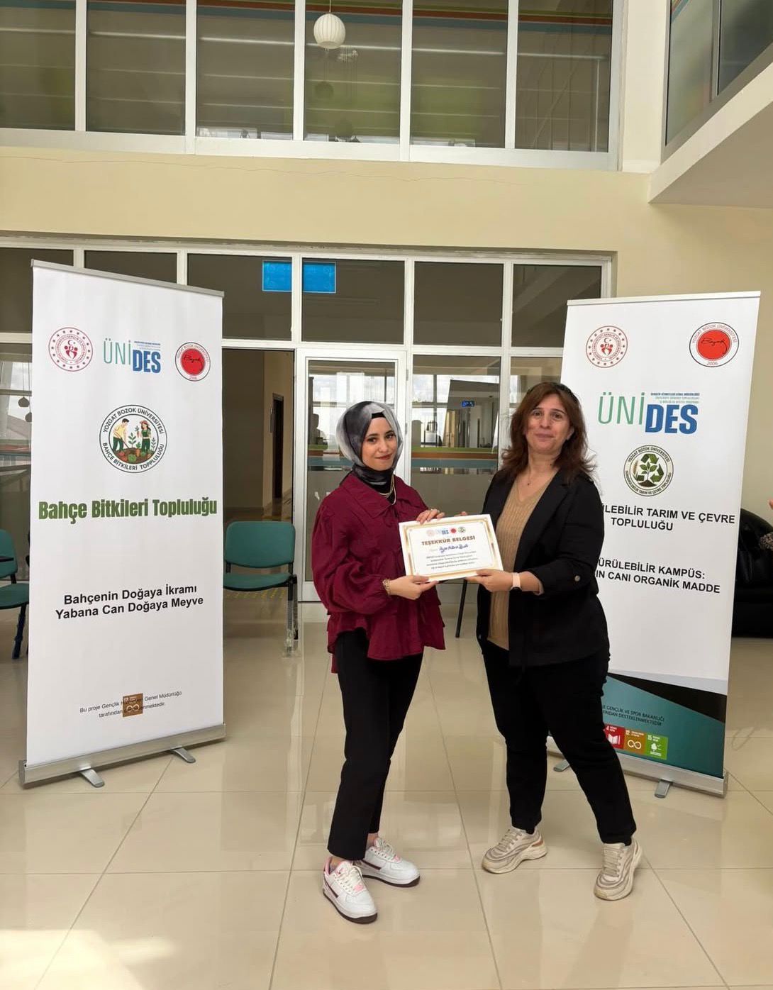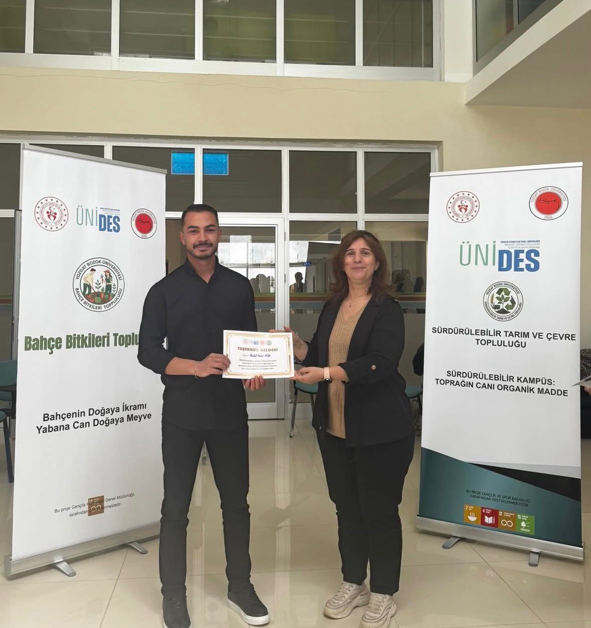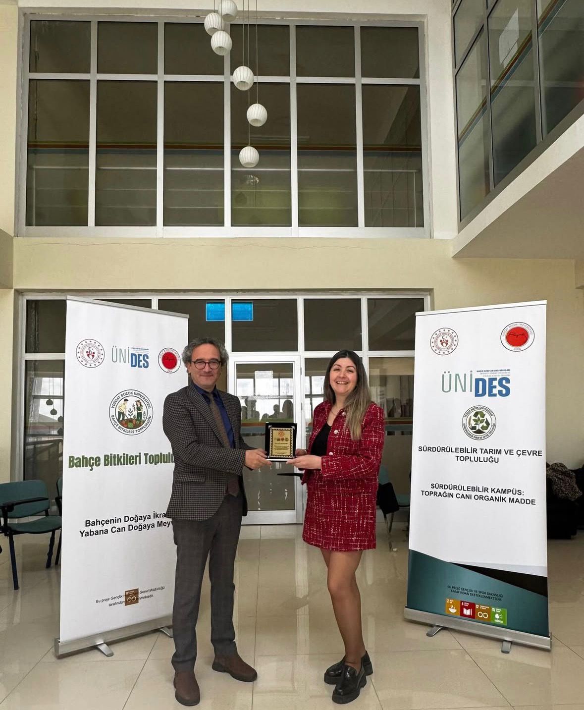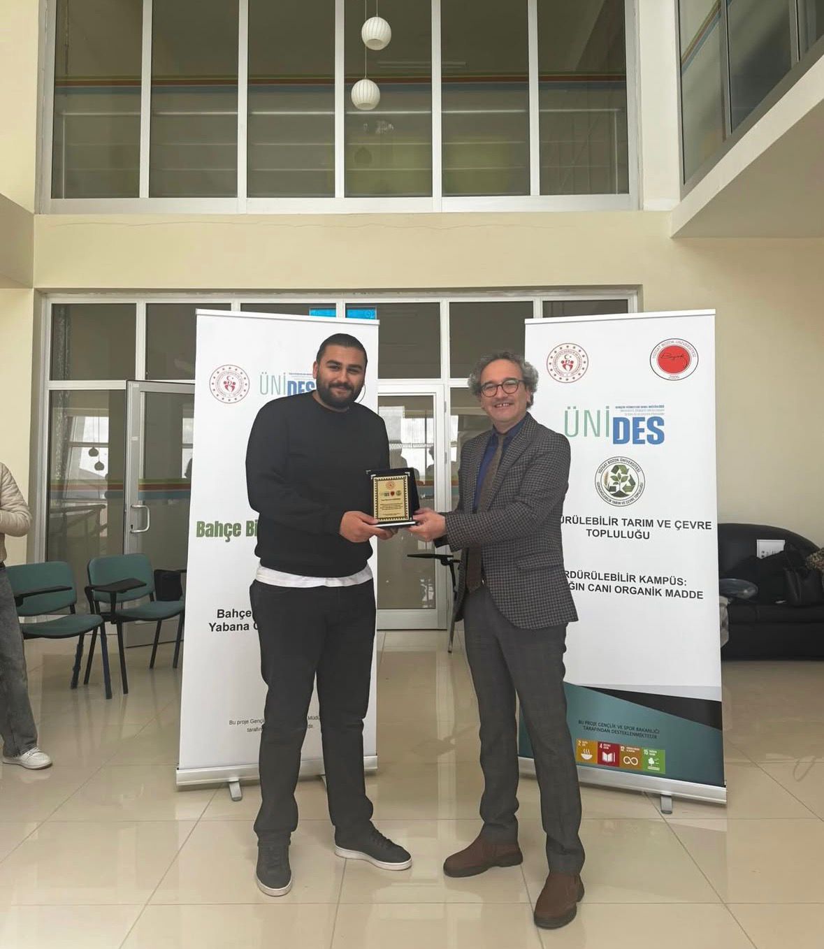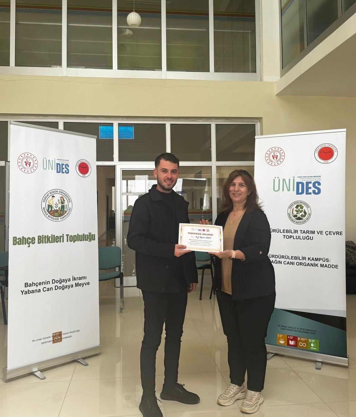 Fakültemizde, ÜNİDES kapsamında desteklenen projeler kapsamında anlamlı bir buluşma gerçekleştirildi. “Sürdürülebilir Tarım ve Çevre Topluluğu” ile “Bahçe Bitkileri Topluluğu” tarafından yürütülen ve kabul edilen projelerin başarısı, Dekanımız Prof. Dr. Tuğrul Yakupoğlu, akademisyenlerimiz ve öğrencilerimizin katılımıyla düzenlenen törende kutlandı. Program kapsamında, projelere katkı sağlayan öğrencilere plaket ve katılım belgeleri takdim edildi. Topluluk danışmanları Doç. Dr. Gökçen Yakupoğlu ve Doç. Dr. Gülden Balcı ile proje yürütücüleri Ömer Ceran ve Mahmut Can Kızılırmak başta olmak üzere, projede emeği geçen tüm öğrencilere belgeleri Dekanımız tarafından verildi.