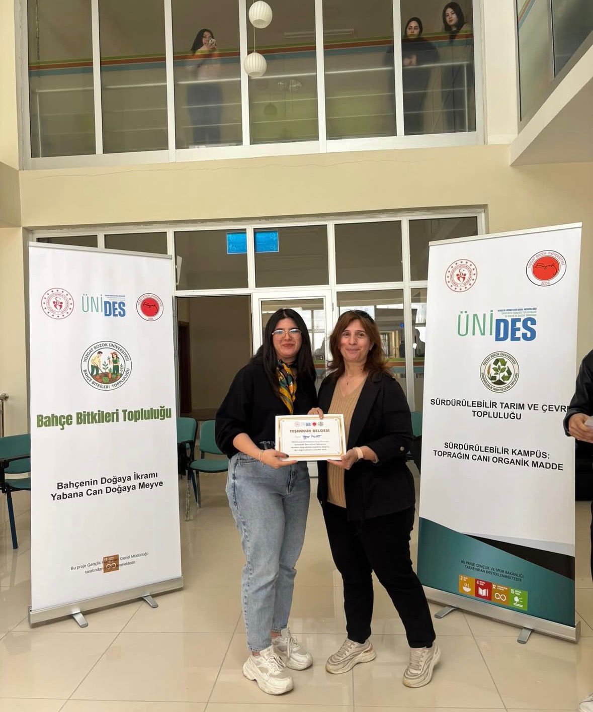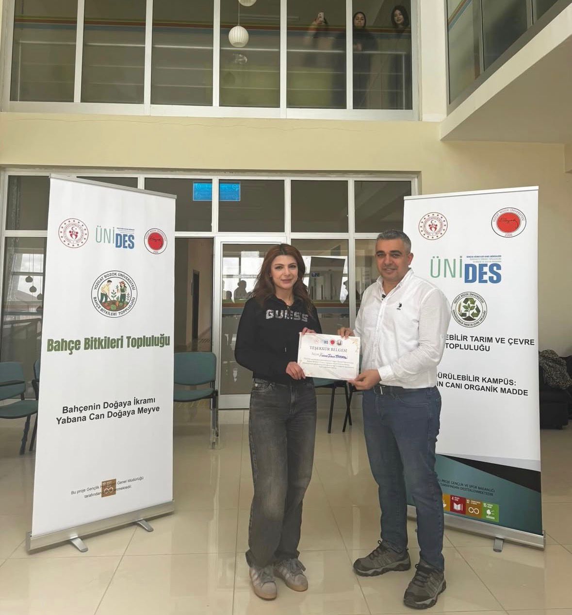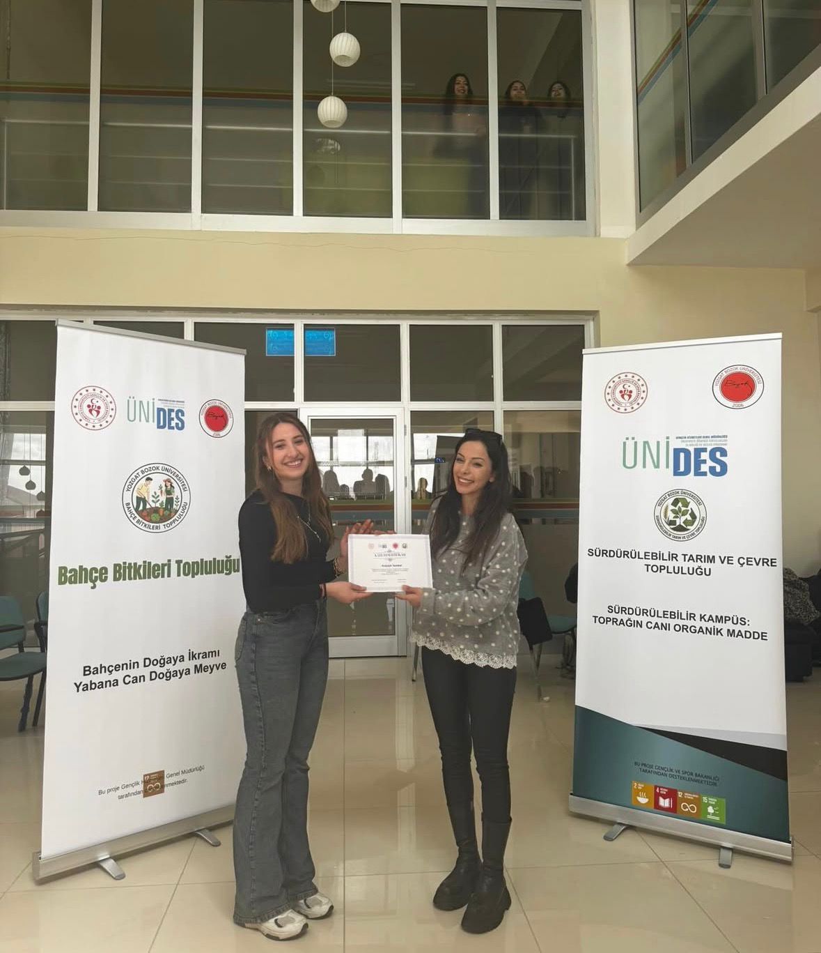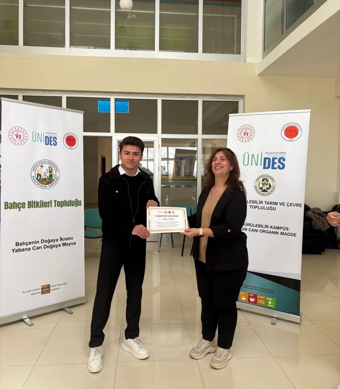 Fakültemizde, ÜNİDES kapsamında desteklenen projeler kapsamında anlamlı bir buluşma gerçekleştirildi. “Sürdürülebilir Tarım ve Çevre Topluluğu” ile “Bahçe Bitkileri Topluluğu” tarafından yürütülen ve kabul edilen projelerin başarısı, Dekanımız Prof. Dr. Tuğrul Yakupoğlu, akademisyenlerimiz ve öğrencilerimizin katılımıyla düzenlenen törende kutlandı. Program kapsamında, projelere katkı sağlayan öğrencilere plaket ve katılım belgeleri takdim edildi. Topluluk danışmanları Doç. Dr. Gökçen Yakupoğlu ve Doç. Dr. Gülden Balcı ile proje yürütücüleri Ömer Ceran ve Mahmut Can Kızılırmak başta olmak üzere, projede emeği geçen tüm öğrencilere belgeleri Dekanımız tarafından verildi.