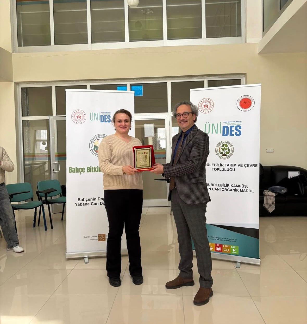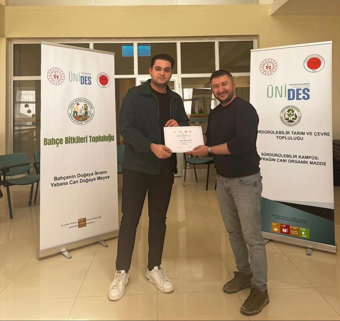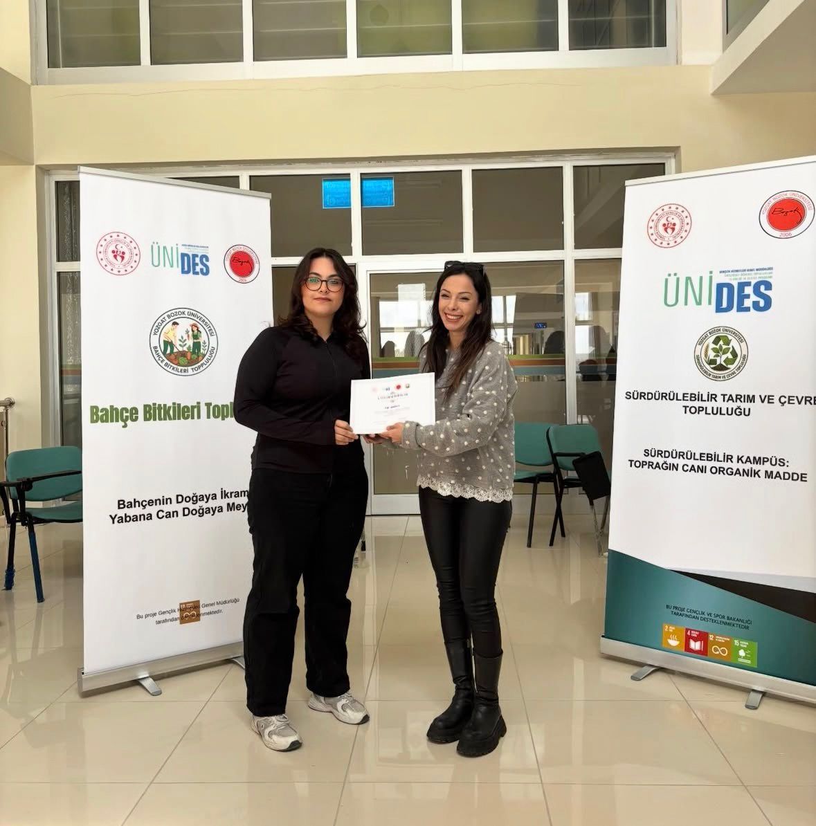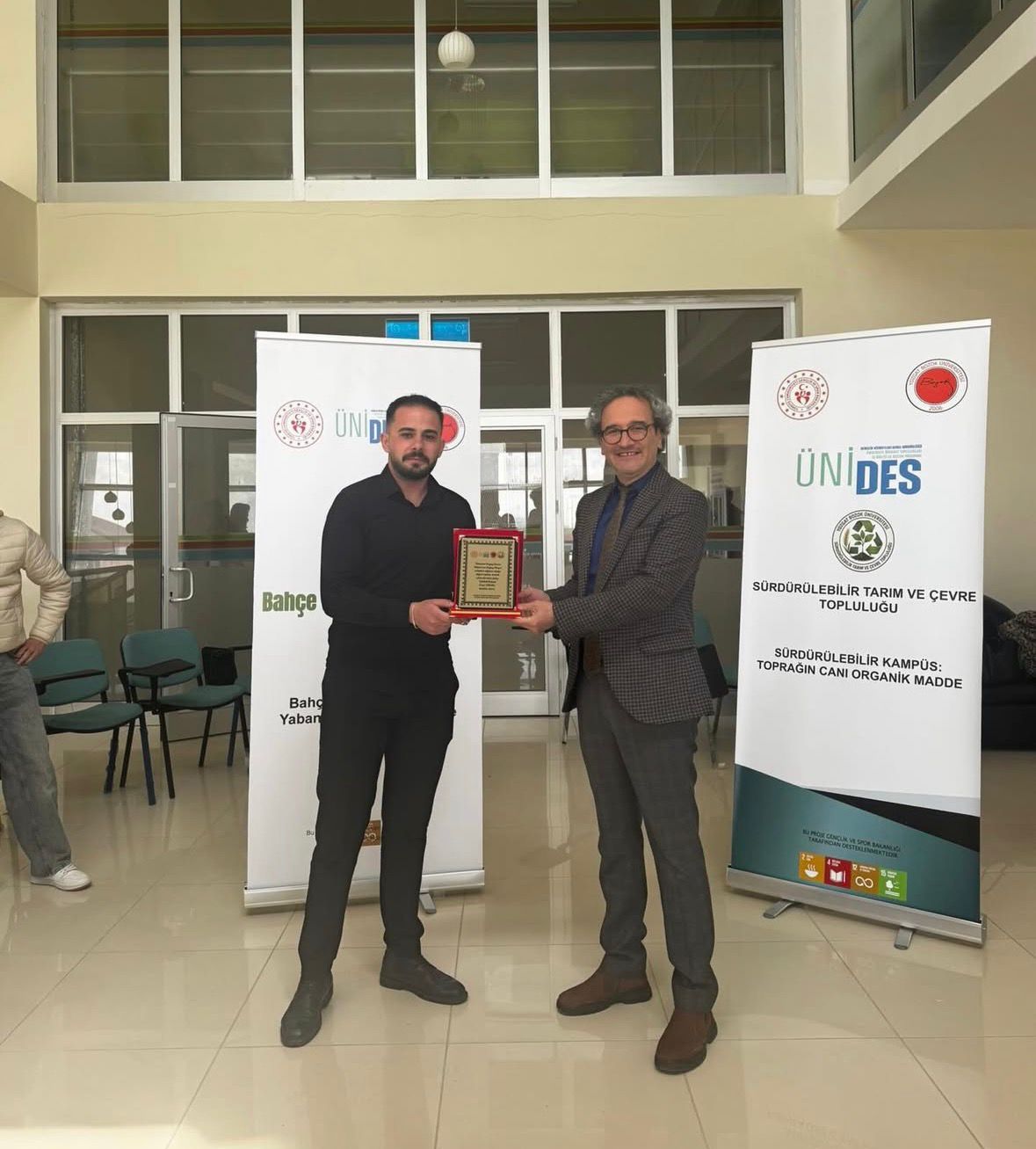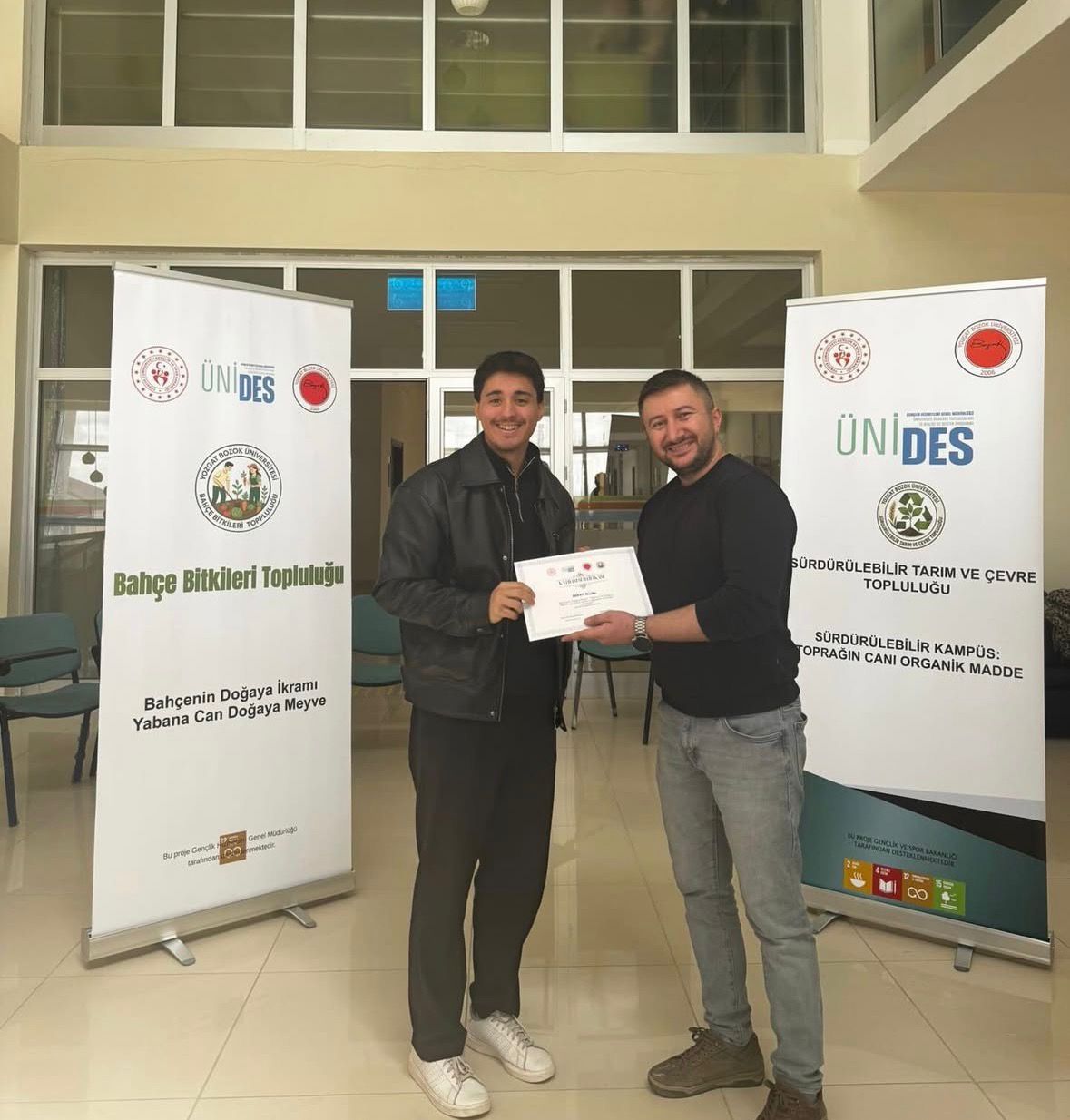 Fakültemizde, ÜNİDES kapsamında desteklenen projeler kapsamında anlamlı bir buluşma gerçekleştirildi. “Sürdürülebilir Tarım ve Çevre Topluluğu” ile “Bahçe Bitkileri Topluluğu” tarafından yürütülen ve kabul edilen projelerin başarısı, Dekanımız Prof. Dr. Tuğrul Yakupoğlu, akademisyenlerimiz ve öğrencilerimizin katılımıyla düzenlenen törende kutlandı. Program kapsamında, projelere katkı sağlayan öğrencilere plaket ve katılım belgeleri takdim edildi. Topluluk danışmanları Doç. Dr. Gökçen Yakupoğlu ve Doç. Dr. Gülden Balcı ile proje yürütücüleri Ömer Ceran ve Mahmut Can Kızılırmak başta olmak üzere, projede emeği geçen tüm öğrencilere belgeleri Dekanımız tarafından verildi.