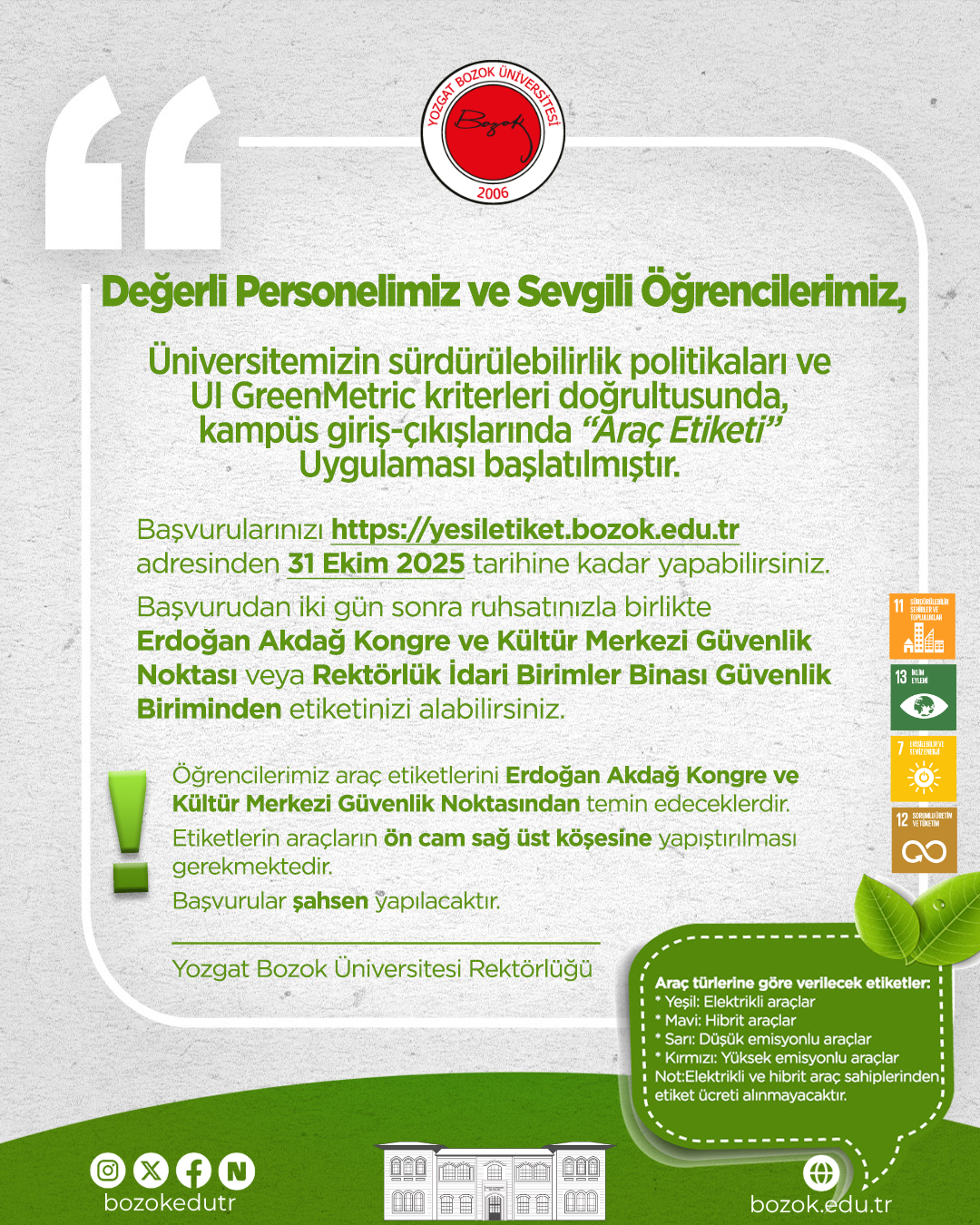 Üniversitemizin sürdürülebilirlik politikaları ve UI GreenMetric kriterleri doğrultusunda, kampüs giriş-çıkışlarında "Araç Etiketi Uygulaması" başlatılmıştır.