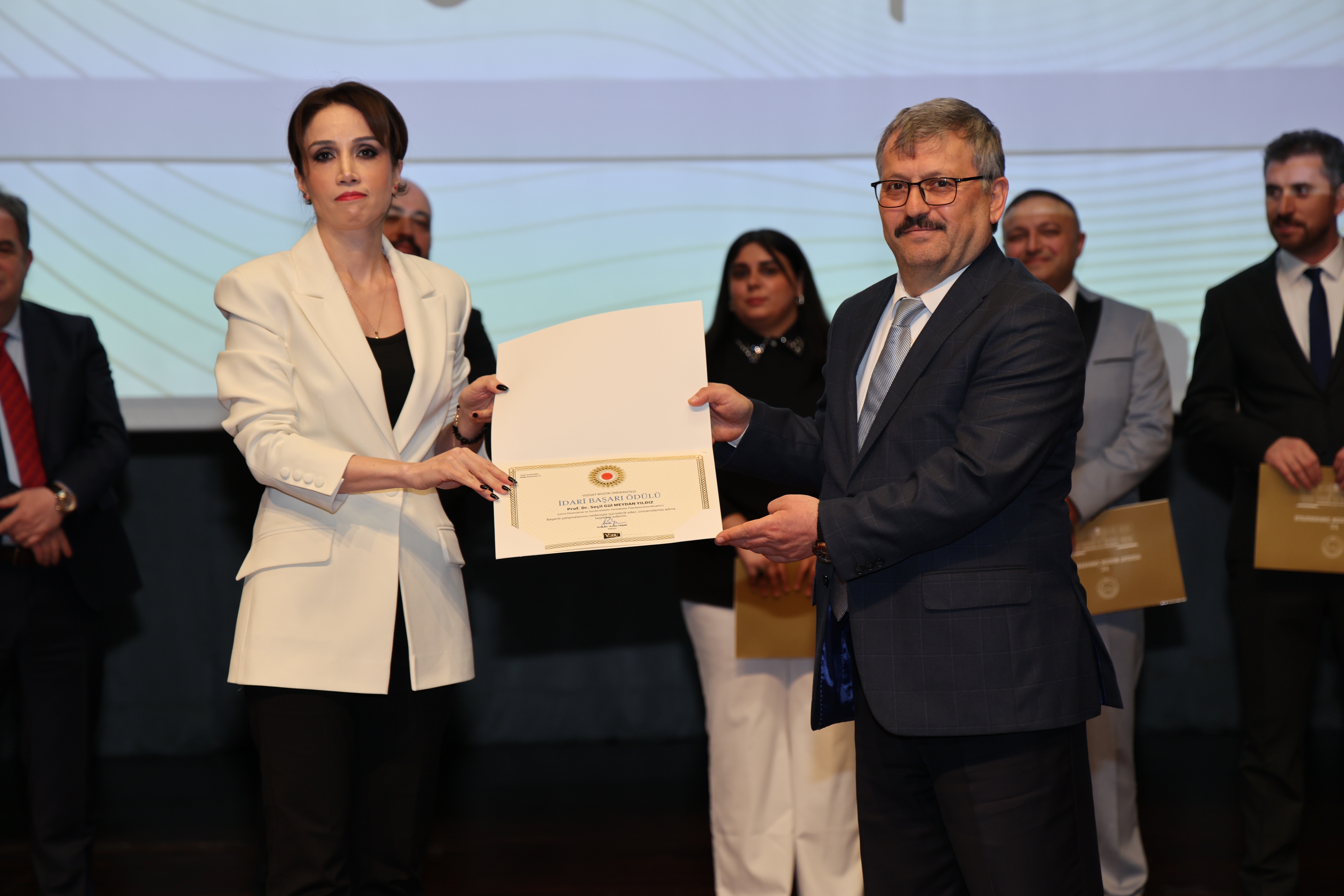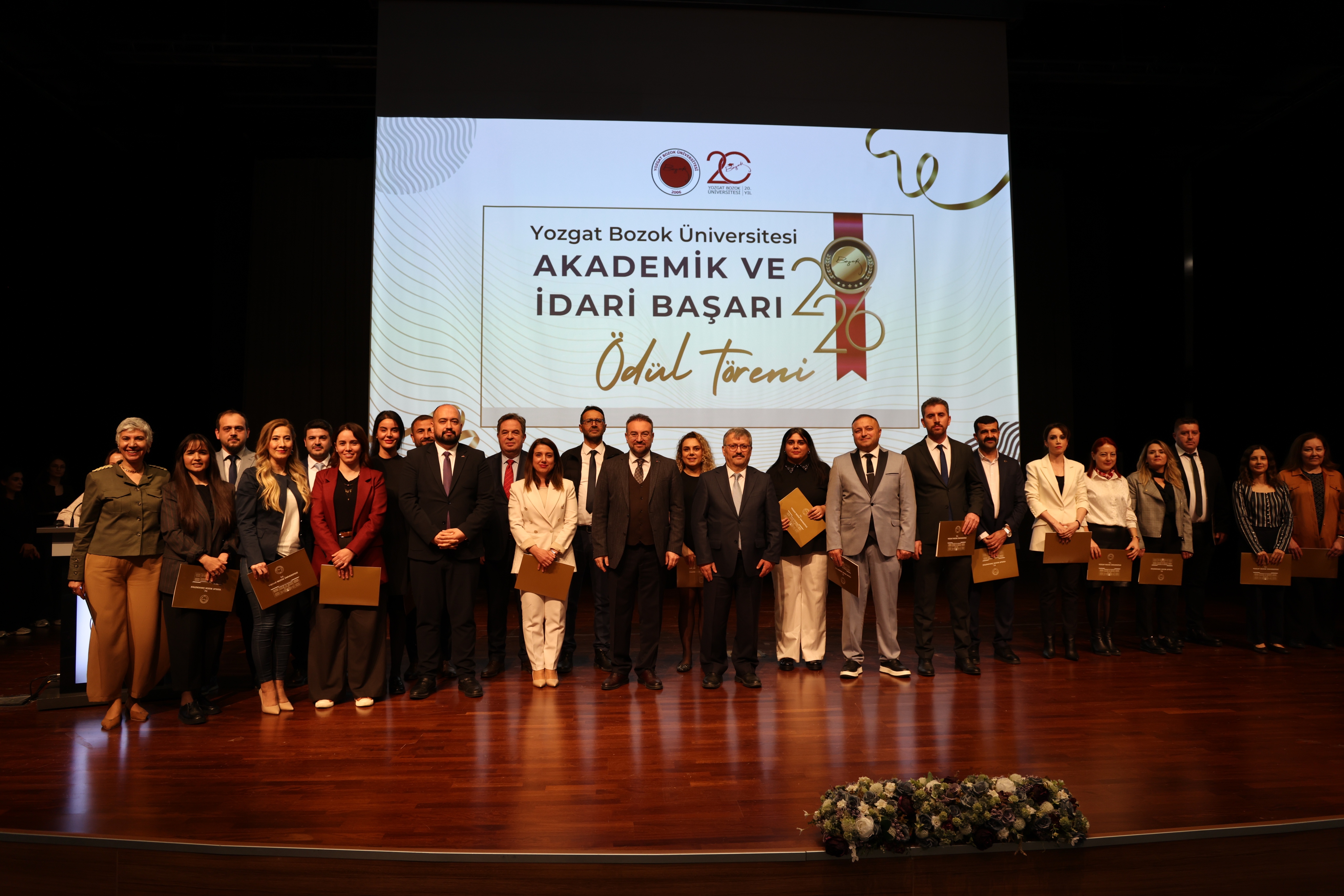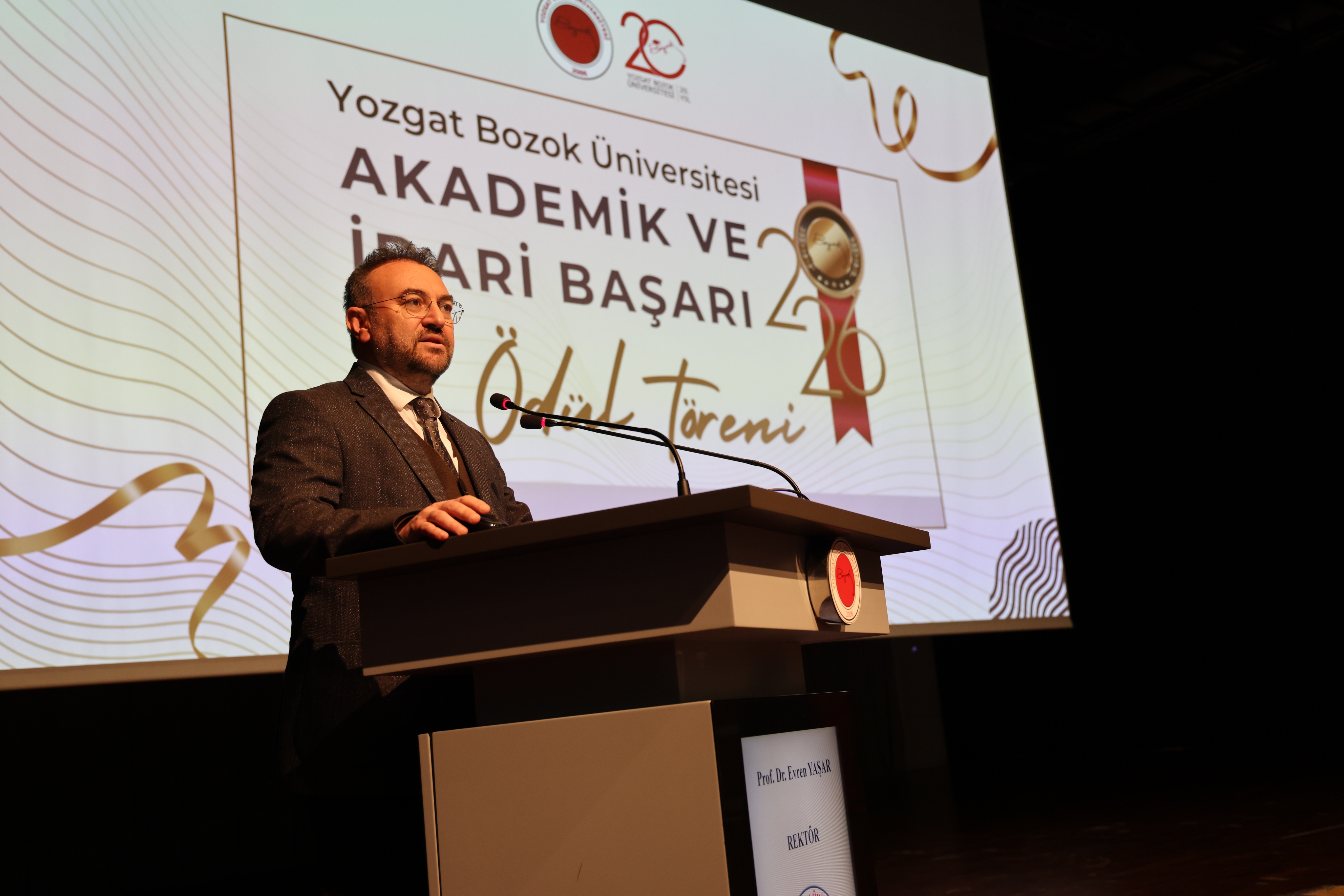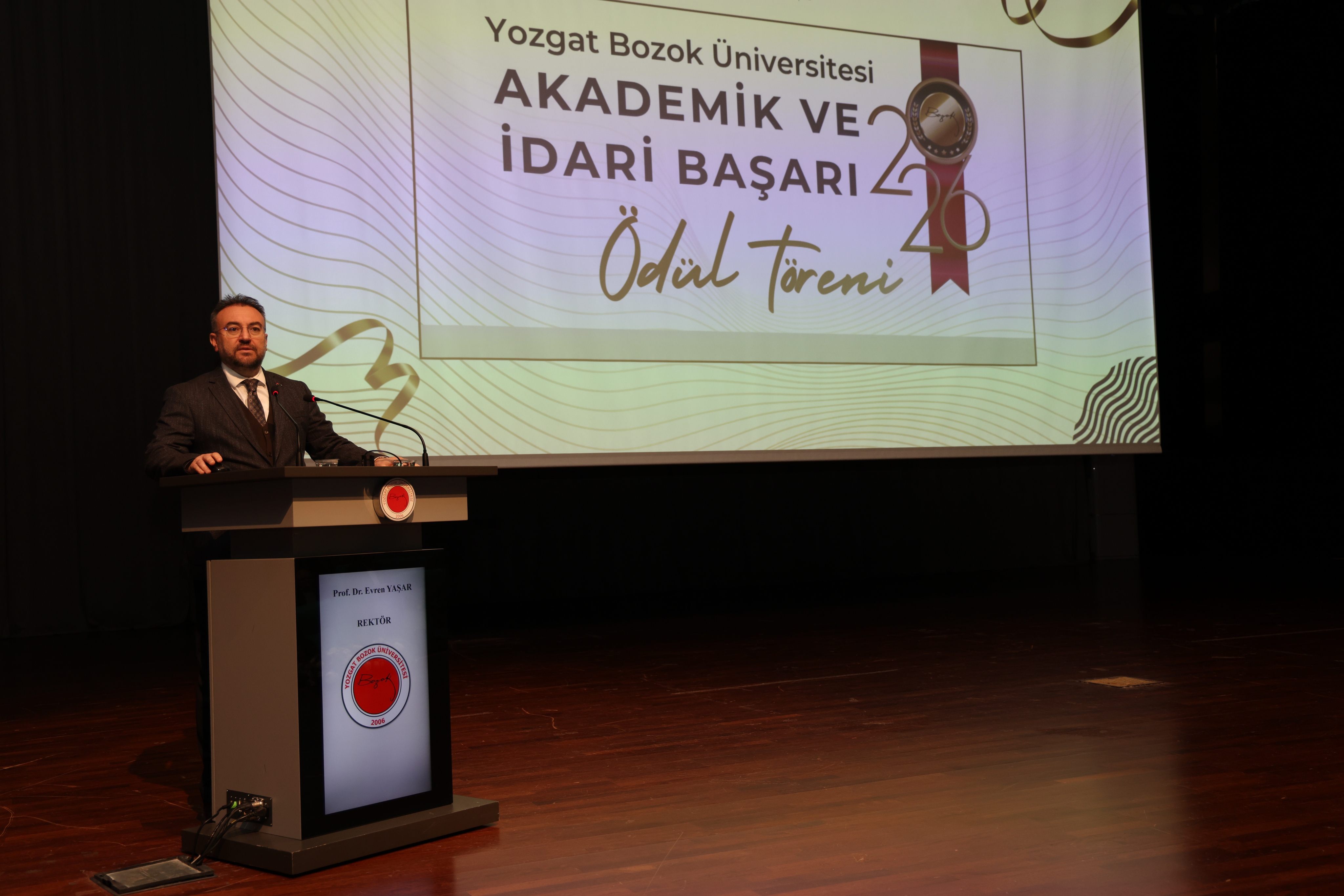 Elde edilen başarıların, ortak emek ve özverinin bir sonucu olduğunu ifade eden Rektörümüz konuşmasının devamında: “İki buçuk yılı aşkın süredir birlikte çalışıyoruz. Bu süreçte üniversitemizi ulusal ve uluslararası alanda daha ileriye taşımak için elinizden gelen çabayı gösterdiniz. Yozgat Bozok Üniversitesi markasının görünürlüğünü artırma noktasında hep birlikte önemli katkılar sundunuz. Yönetim anlayışı olarak profesyonel çalışmayı önemsiyoruz ve başarıyı ödüllendirmeyi de bu sürecin önemli bir parçası olarak görüyoruz. Bu tür törenleri önümüzdeki süreçte de sürdürmeyi planlıyoruz. Sorumluluğumuz büyük ve önümüzde zorlu bir yol var. Ancak birlik ve beraberlik içerisinde hareket ederek bu süreci daha güçlü bir şekilde yürütebiliriz. Bugün gerçekleştirdiğimiz ödül töreninin güzel bir başlangıç olduğuna inanıyorum. Hep birlikte üniversitemizin görünürlüğünü daha ileriye taşıyacak, Yozgat Bozok Üniversitesi markasını daha güçlü bir konuma ulaştıracağız.” ifadelerini kullandı.