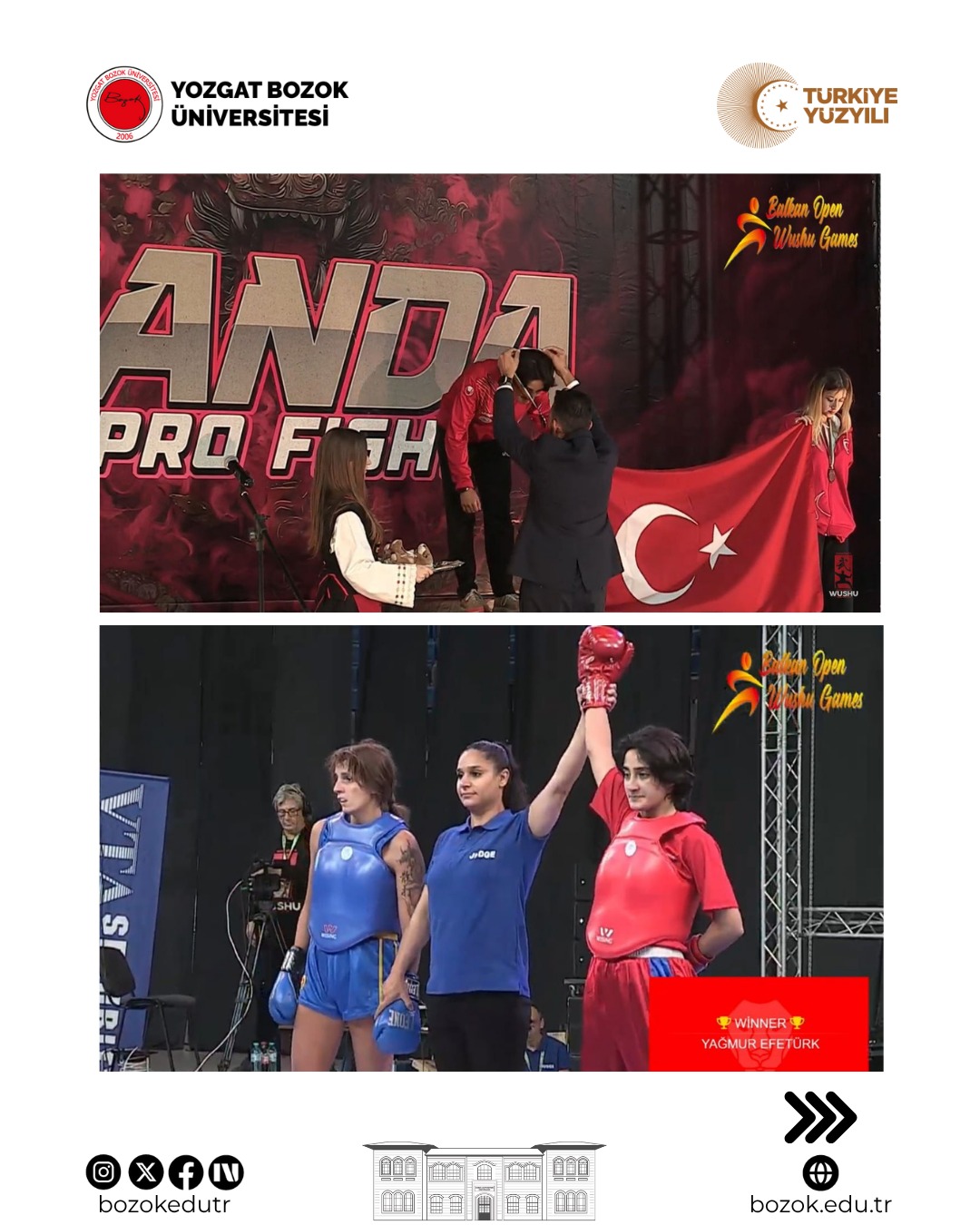 Üniversitemiz Spor Bilimleri Fakültesi Antrenörlük Eğitimi 1. sınıf öğrencisi Yağmur Efetürk, 12–16 Kasım tarihleri arasında Bulgaristan’ın Burgaz kentinde düzenlenen Açık Balkan Wushu Kung Fu Şampiyonasında büyük bir başarıya imza attı. Efetürk, 56 kg Büyükler Sanda kategorisinde rakiplerini geride bırakarak Balkan Şampiyonu oldu.