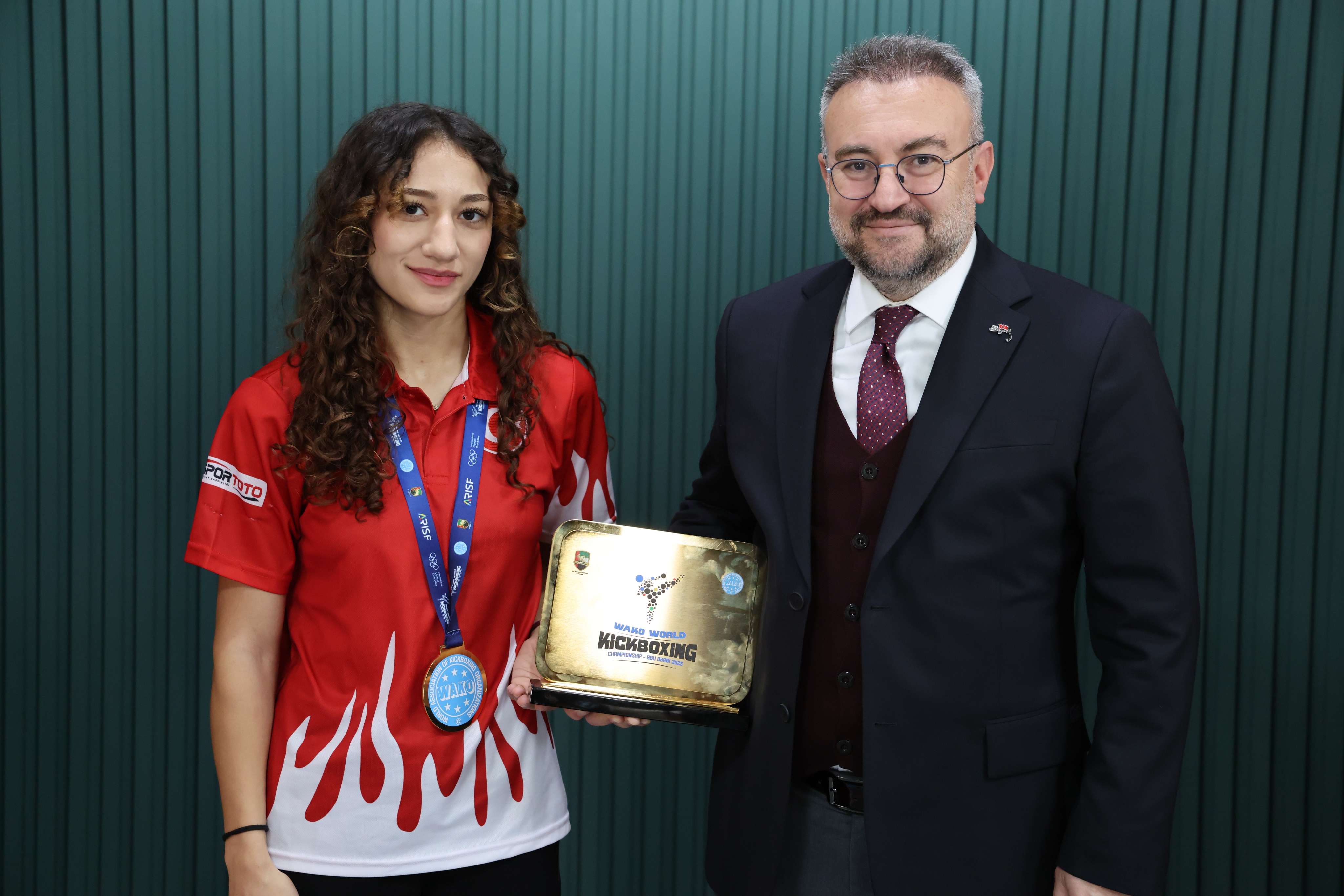 Üniversitemiz Rektörü Prof. Dr. Evren Yaşar, 21–30 Kasım 2025 tarihlerinde Birleşik Arap Emirlikleri’nin başkenti Abu Dabi’de düzenlenen Dünya Büyükler Kick Boks Şampiyonasında dünya şampiyonu olan Betül Zararsız’ı makamında kabul etti.
