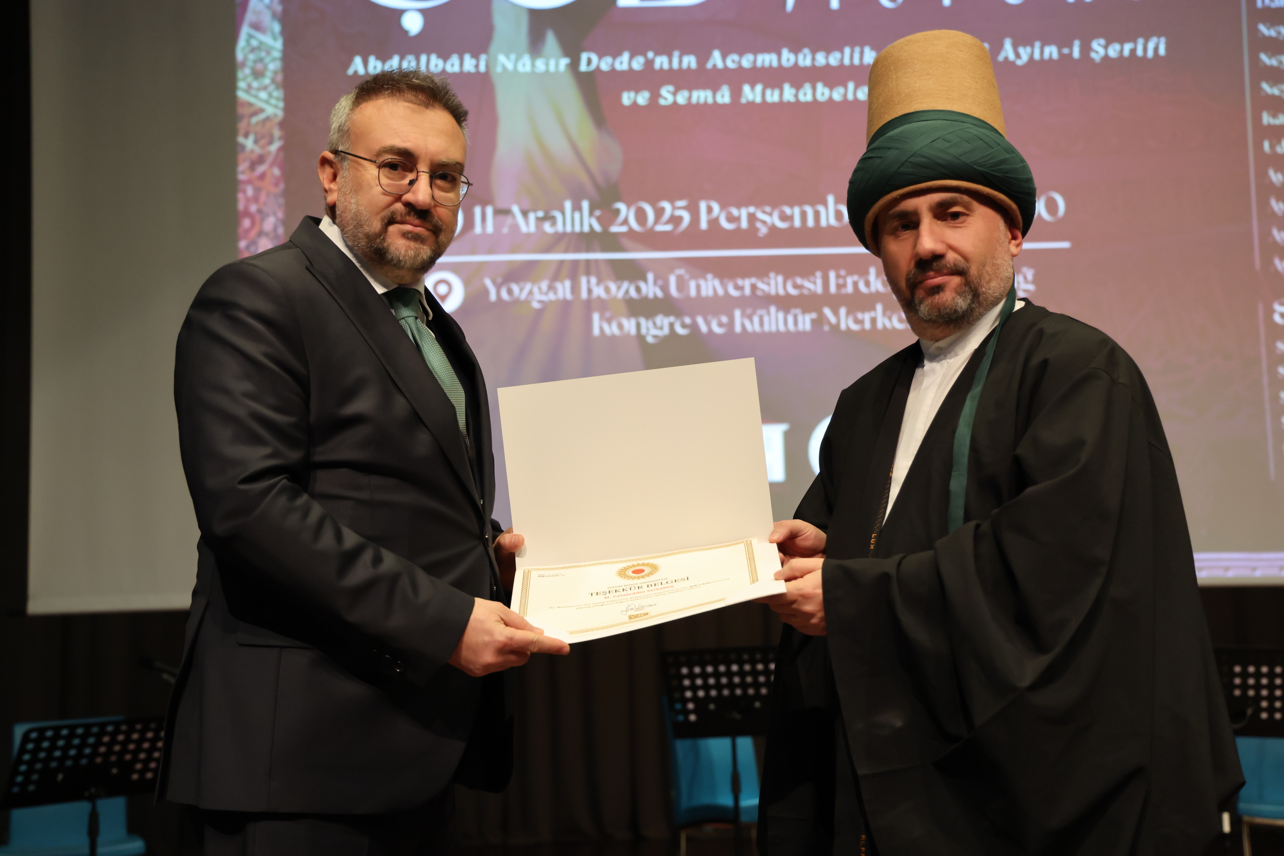 Sakarya Üniversitesi İlahiyat Fakültesi Öğretim Üyesi Prof. Dr. Sezai Küçük’ün Mevlevi Ayin geleneğinden olan Mesnevi dersi ile başlayan tören, Abdülbâkî Nâsır Dede’nin Acembuselik Mevlevî Âyini’nin icrası ile devam etti. Mevlevî geleneğinin temel unsurlarını yansıtan ayin, mutrıb heyeti tarafından özenle sunuldu.