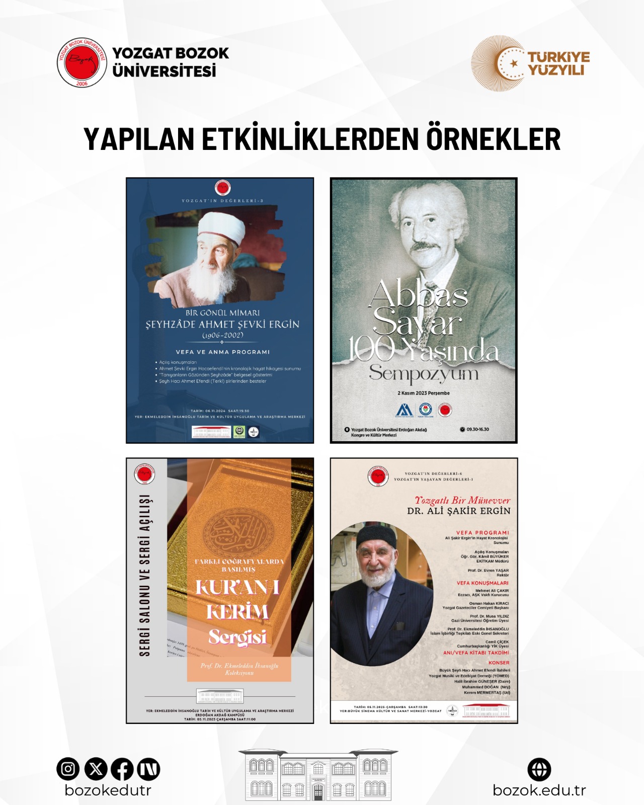 “Yozgat’ın Değerleri” serisinin ilk etkinliği olan Abbas Sayar Sempozyumu ile başlayan süreç; Müderris Yozgatlı İhsan Efendi Paneli, Şeyhzade Ahmet Şevki Ergin Vefa Programı, İnceliklerin Şairi Gülten Akın Paneli, Osmanlı’dan Cumhuriyet’e Yozgatlı Devlet Adamları Paneli, Yozgat Mevlevihanesi ve Salih Sabri Dede Programı gibi etkinliklerle devam etti. Toplamda "on ayrı program" gerçekleştirilerek Yozgat’ın kültürel atlası yeniden görünür hale getirildi.
