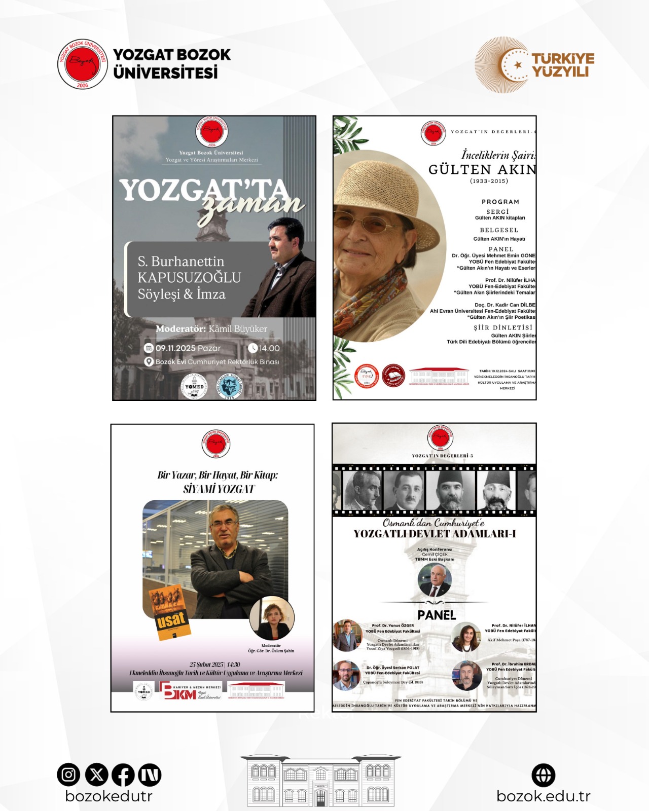 Üniversitemiz tarafından yürütülen “Yozgat’ın Değerleri” projesi kapsamında; şehrin yetiştirdiği yazarlar, sanatçılar, siyasetçiler ve akademisyenler düzenlenen anma programları, paneller ve söyleşilerle yeniden Yozgatlılarla buluşturuldu. Bu etkinlikler sayesinde Yozgat’ın kültürel birikimi yalnızca hatırlanmakla kalmadı, aynı zamanda yeni nesillere aktarılan güçlü bir şehir mirasına dönüştü.