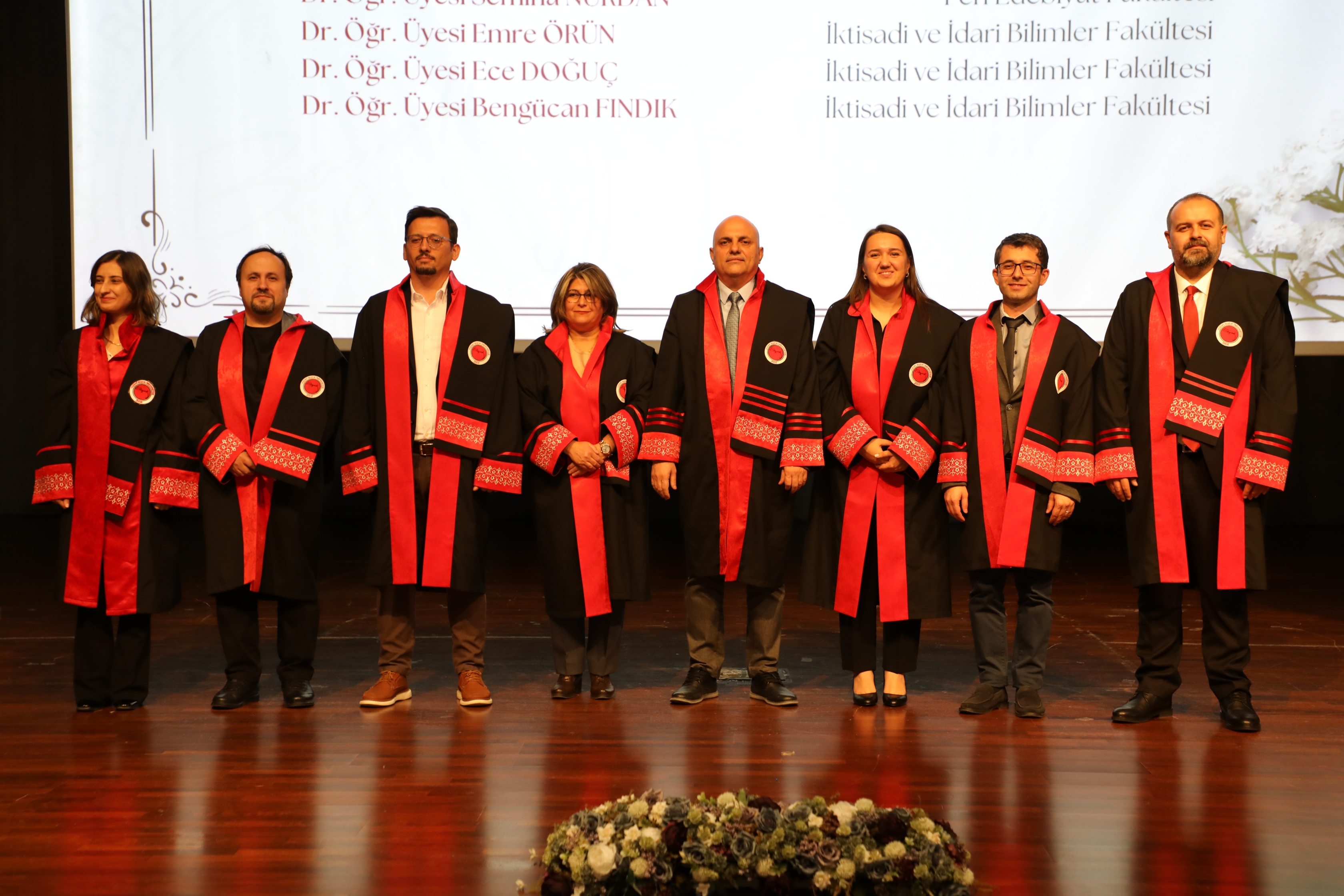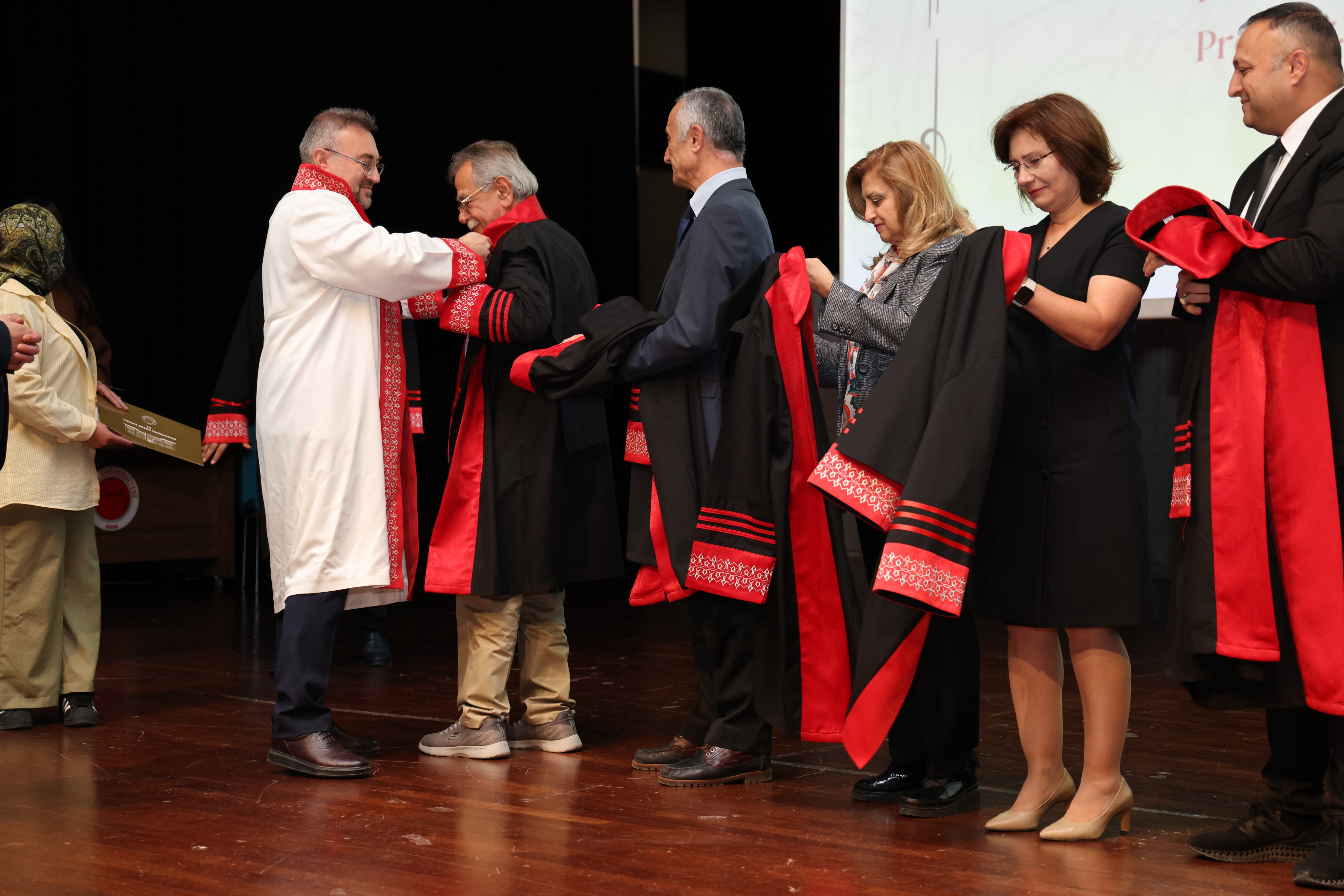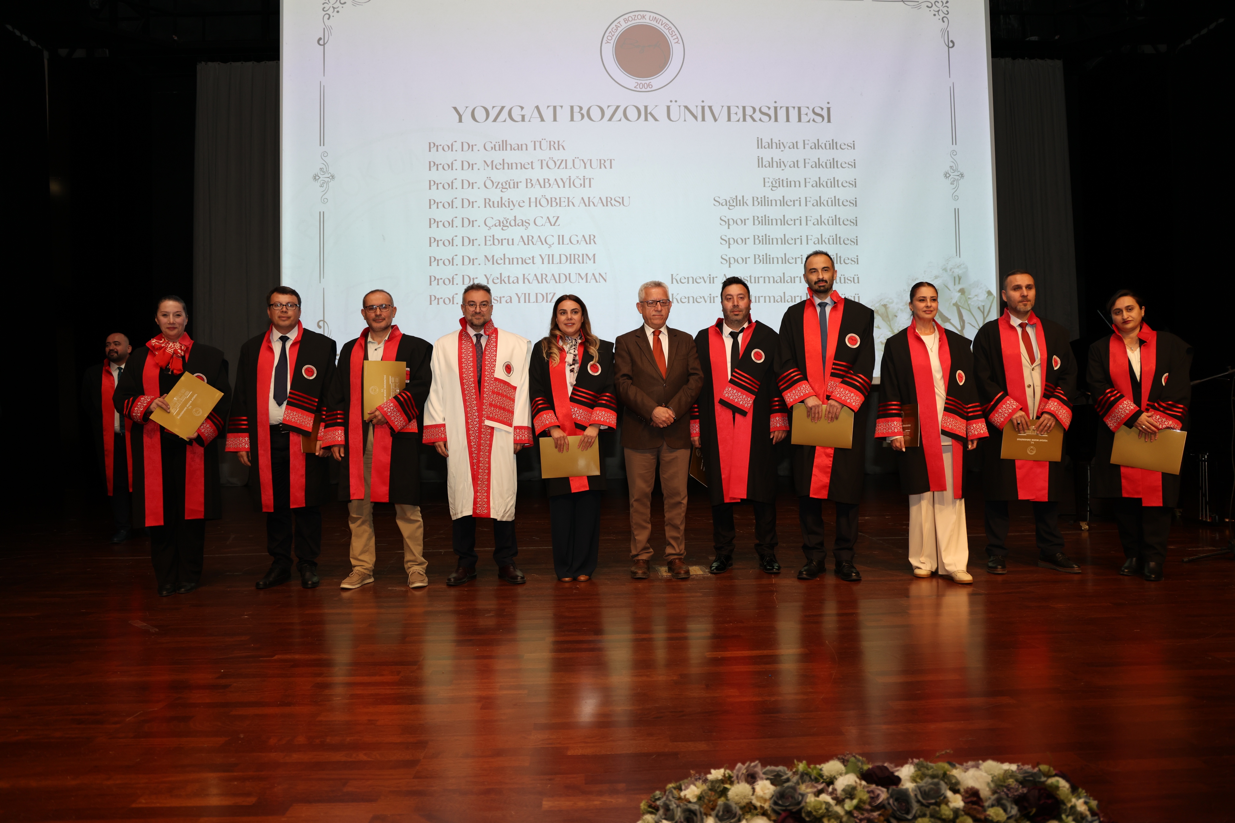 Açılış konuşmalarının ardından Üniversitemiz Rektörü Prof. Dr. Evren Yaşar ve protokol üyeleri tarafından akademik unvanlarında yükselen 27 Profesör, 28 Doçent ve 89 Doktor Öğretim Üyesi’ne cübbeleri giydirilerek belgeleri takdim edildi.