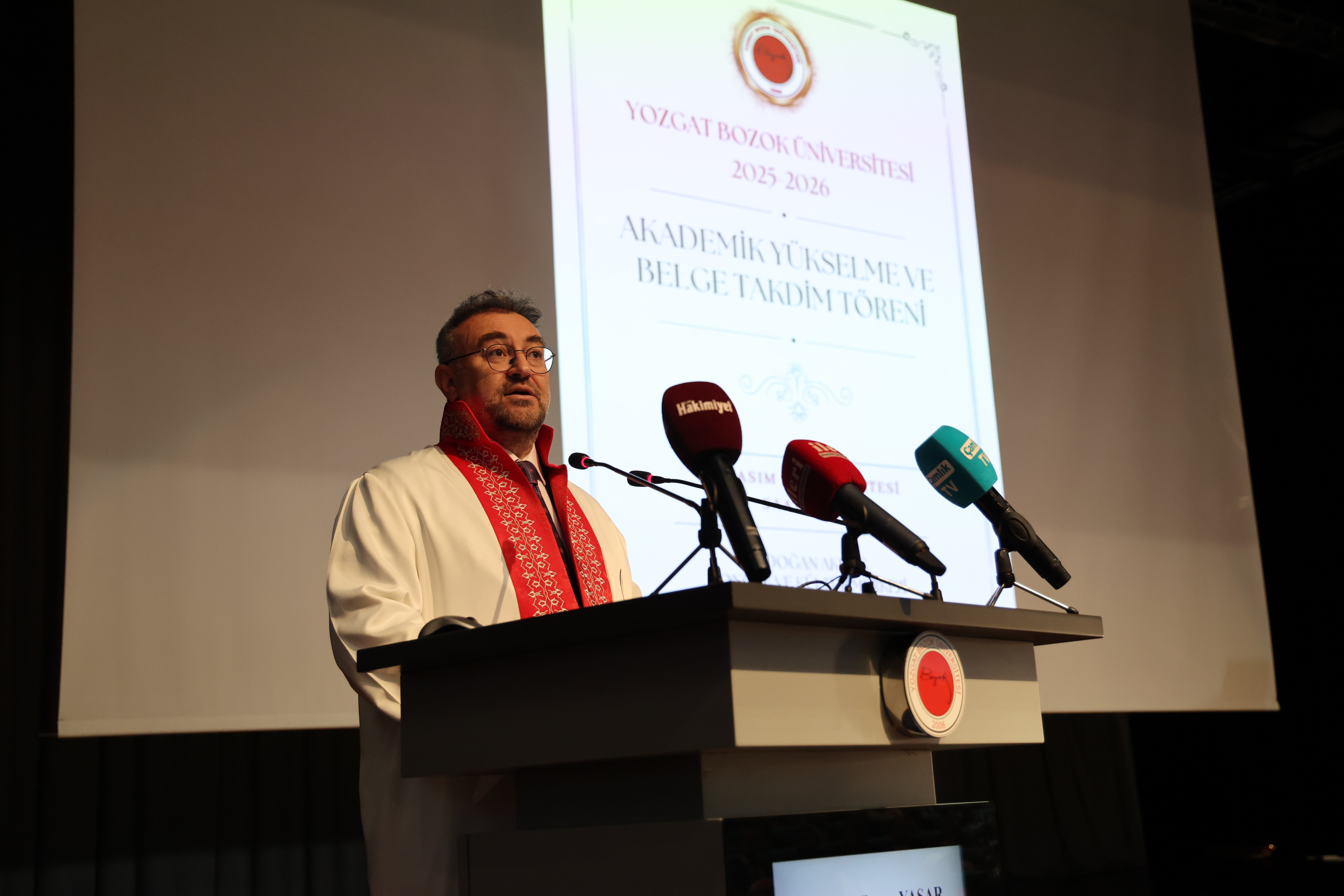 Konuşmasının sonunda Yozgat Bozok Üniversitesi’nin sadece bir yükseköğretim kurumu değil, bilim üreten, çevreye duyarlı, öğrenci merkezli ve toplumla iç içe bir dönüşümün merkezi haline geldiğini vurgulayan Rektörümüz: “Göreve başladığımızdan bu yana 249 öğretim üyemiz akademik yükselme elde etti, 170 yeni akademisyen kadromuza katıldı. Bu büyük başarı, laboratuvarlarda gece gündüz çalışan akademisyenlerimizin, idari personelimizin ve bizlere güvenen öğrencilerimizin ortak eseridir. Başta Cumhurbaşkanımız Sayın Recep Tayyip Erdoğan olmak üzere tüm devlet büyüklerimize, Yozgat Valimize, Yozgat Milletvekillerimize ve şehrimizin tüm paydaşlarına teşekkür ediyorum. Yeni akademik yılımız, Bozok ailesine, Yozgat’ımıza ve ülkemize hayırlı olsun. Bu anlamlı törende Profesör, Doçent ve Doktor Öğretim Üyesi unvanlarına yükselen öğretim elemanlarımızı tebrik ediyor akademik hayatlarında başarılar diliyorum.” dedi.