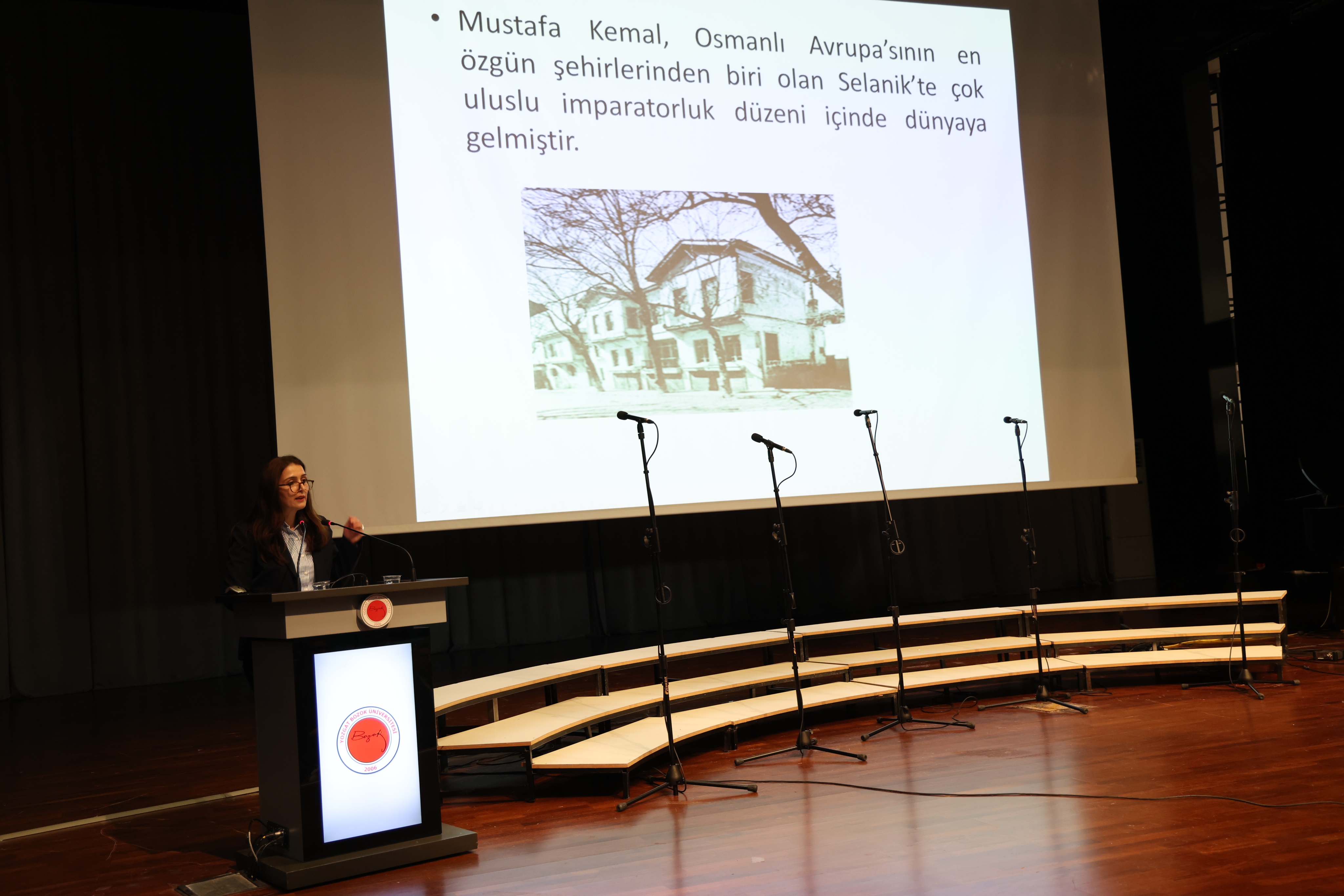 Doç. Dr. Mumyakmaz sunumunda, Mustafa Kemal Atatürk’ün kişiliğini şekillendiren eğitim ve düşünsel çevrelerden, liderliğini belirleyen vizyon, kararlılık, bilime ve akla olan bağlılık gibi temel niteliklere değindi. Atatürk’ün, askeri dehası, ileri görüşlülüğü ve Türk milletini çağdaş uygarlık düzeyine taşıma hedeflerine ilişkin bilgiler aktaran Doç. Dr. Mumyakmaz konuşmasının devamında: “Cumhuriyetimizin kurucusu Mustafa Kemal Atatürk, yalnız bir komutan değil; aynı zamanda vizyon sahibi bir düşünce ve eylem insanıdır. O, milletine ‘akıl ve bilimi’ miras bırakmış, çağdaşlaşma hedefini bir yaşam mücadelesinin gereği olarak görmüştür. Liderlik, insanları etkileme, güven verme, risk alabilme ve onları ortak bir ideale yönlendirme sanatıdır. Atatürk’ü farklı kılan da işte bu özellikleridir. Mustafa Kemal, yıkılmış bir ülke ve devletten genç, modern, kalkınma yolunda mamur bir Cumhuriyet inşa etmek için çalışıp yaşamıştır. Eğitime, bilime ve ilerlemeye duyduğu inançla bir imparatorluğun küllerinden modern bir devlet inşa etmiştir. Selanik’ten başlayıp Cumhuriyet’e uzanan yaşamında, toplumsal dönüşümün yalnızca silahla değil, fikirle kazanılabileceğini göstermiştir. Hayatta en hakiki mürşidin ilim ve fen olduğunu vurgulayan Atatürk, Türk milletini çağdaş uygarlık düzeyine taşıma hedefini kararlılıkla sürdürmüştür. Bugün Türk milleti olarak modern Türkiye Cumhuriyeti’nin ve Türk milletinin kurucusuna minnet ve şükran duyguları içindeyiz. Vefatının 87. yılında, aklı ve bilimi rehber edinen bu büyük lideri saygı, rahmet ve minnetle anıyoruz.” ifadelerini kullandı.