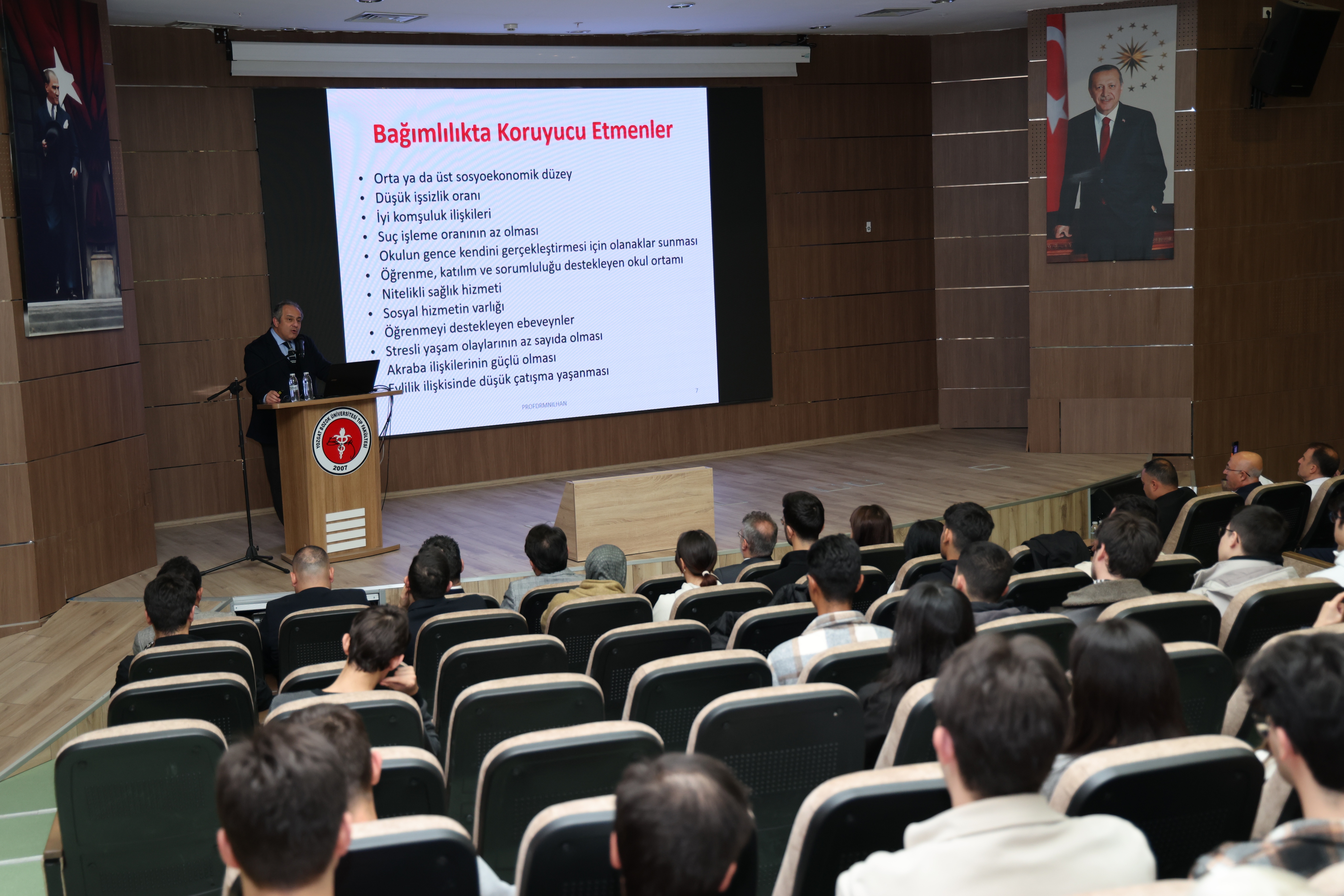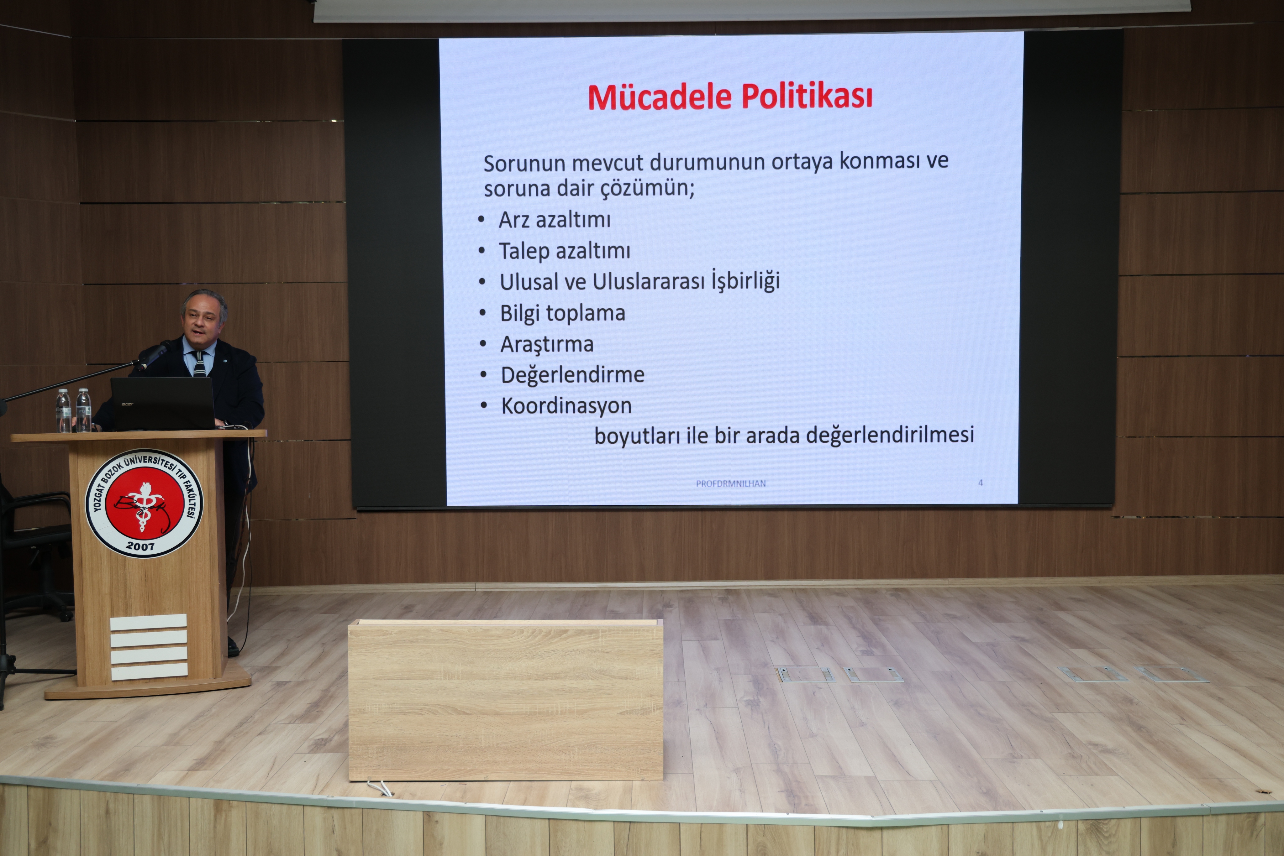 Konferansa konuşmacı olarak katılan Gazi Üniversitesi Tıp Fakültesi Halk Sağlığı Anabilim Dalı Öğretim Üyesi Prof. Dr. Mustafa Necmi İlhan, Türkiye’de ve dünyada uyuşturucu madde kullanımının mevcut durumu, risk faktörleri, bağımlılığın toplumsal etkileri ve mücadelede uygulanması gereken stratejiler hakkında kapsamlı bilgiler verdi. Prof. Dr. İlhan, bağımlılığın yalnızca bireysel değil aynı zamanda toplumsal bir sorun olduğuna dikkat çekerek, erken müdahale, eğitim, farkındalık çalışmaları ve kurumlar arası iş birliğinin önemini vurguladı.