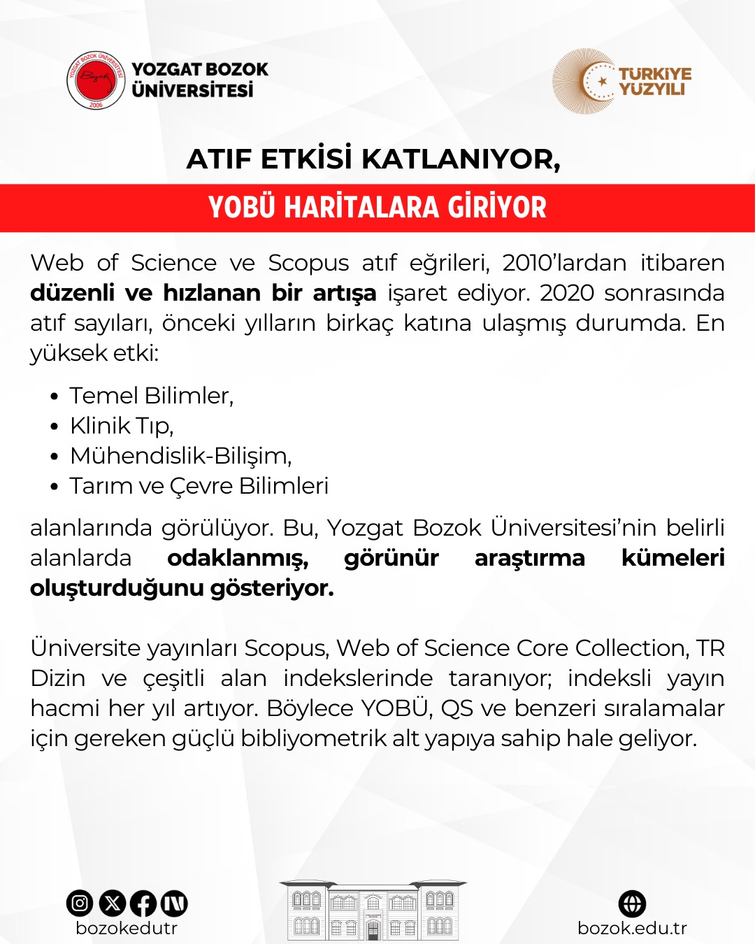 Üniversite yayınları Scopus, Web of Science Core Collection, TR Dizin ve çeşitli alan indekslerinde taranıyor; indeksli yayın hacmi her yıl artıyor. Böylece YOBÜ, QS ve benzeri sıralamalar için gereken güçlü bibliyometrik alt yapıya sahip hale geliyor.
