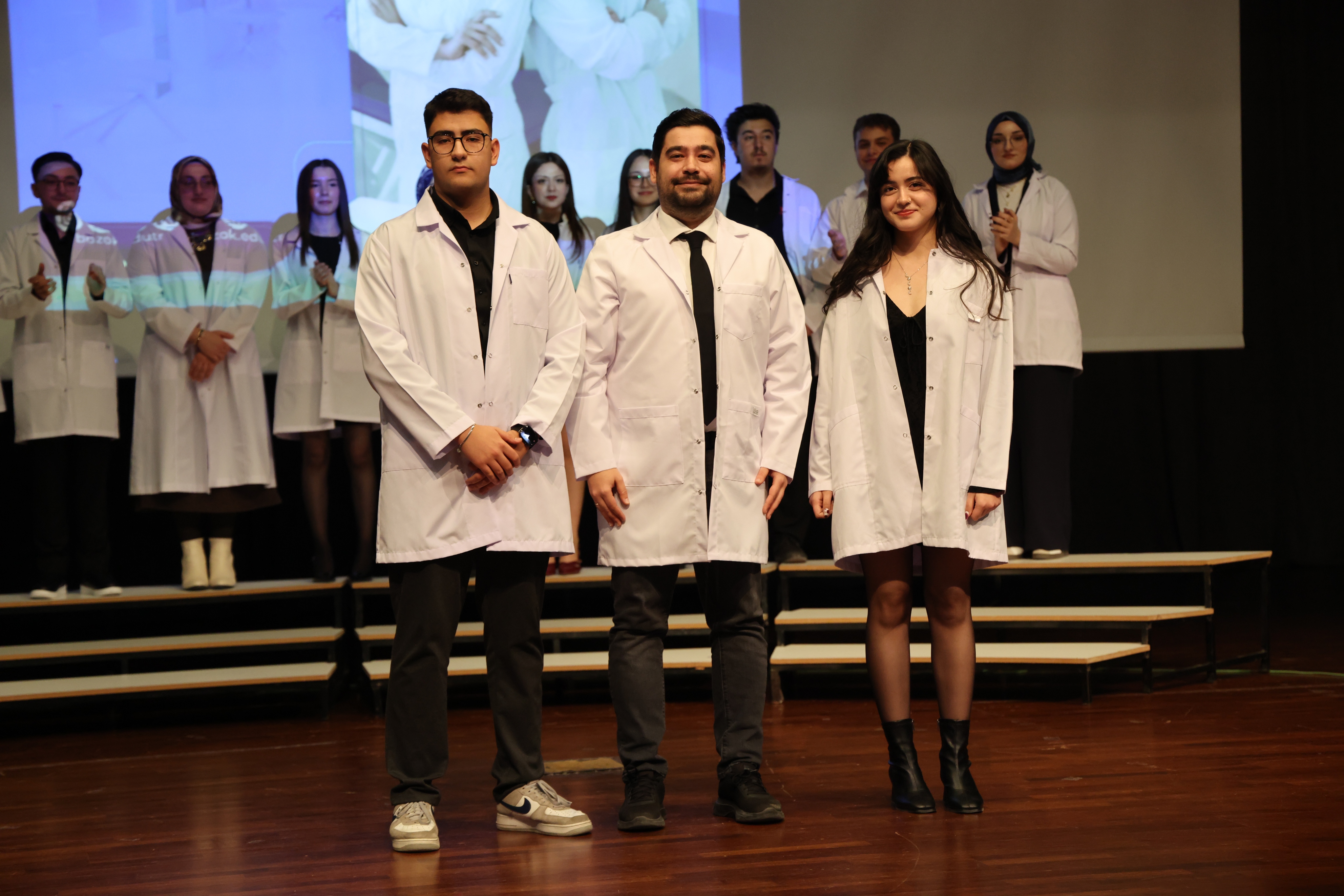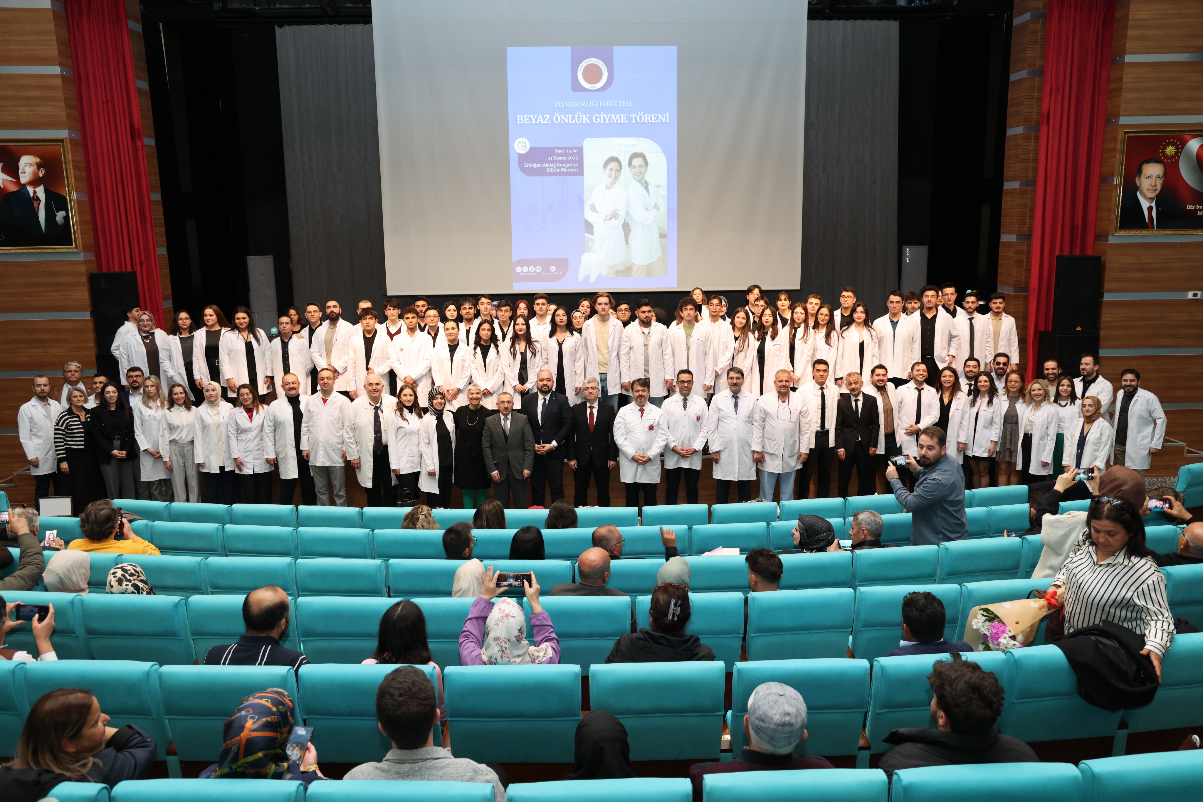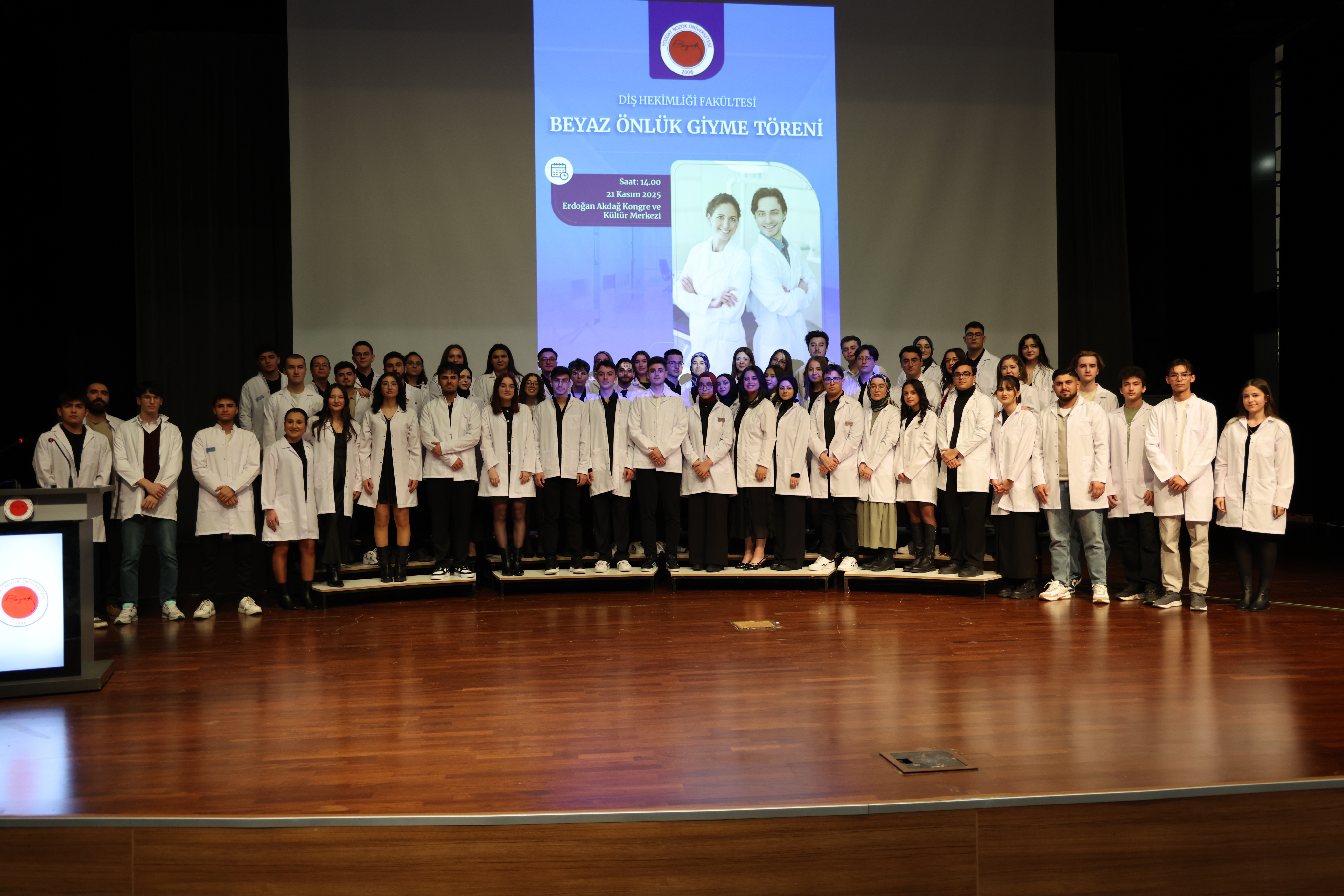 2025-2026 eğitim-öğretim yılında üniversitemiz Diş Hekimliği Fakültesi’ne başlayan 57 hekim adayı için “Beyaz Önlük Giyme Töreni” düzenlendi. Törende, hekimliğe ilk adımlarını atan Diş Hekimliği Fakültesi birinci sınıf öğrencileri, mesleki yaşamlarının simgesi olan beyaz önlüklerini giymenin heyecan ve gururunu yaşadı.
