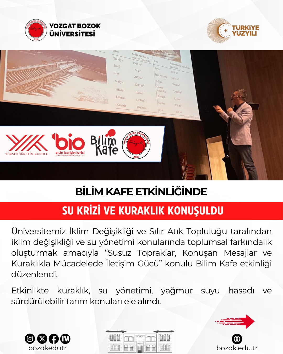 Üniversitemiz İklim Değişikliği ve Sıfır Atık Topluluğu tarafından iklim değişikliği ve su yönetimi konularında toplumsal farkındalık oluşturmak amacıyla “Susuz Topraklar, Konuşan Mesajlar ve Kuraklıkla Mücadelede İletişim Gücü” konulu Bilim Kafe etkinliği düzenlendi.