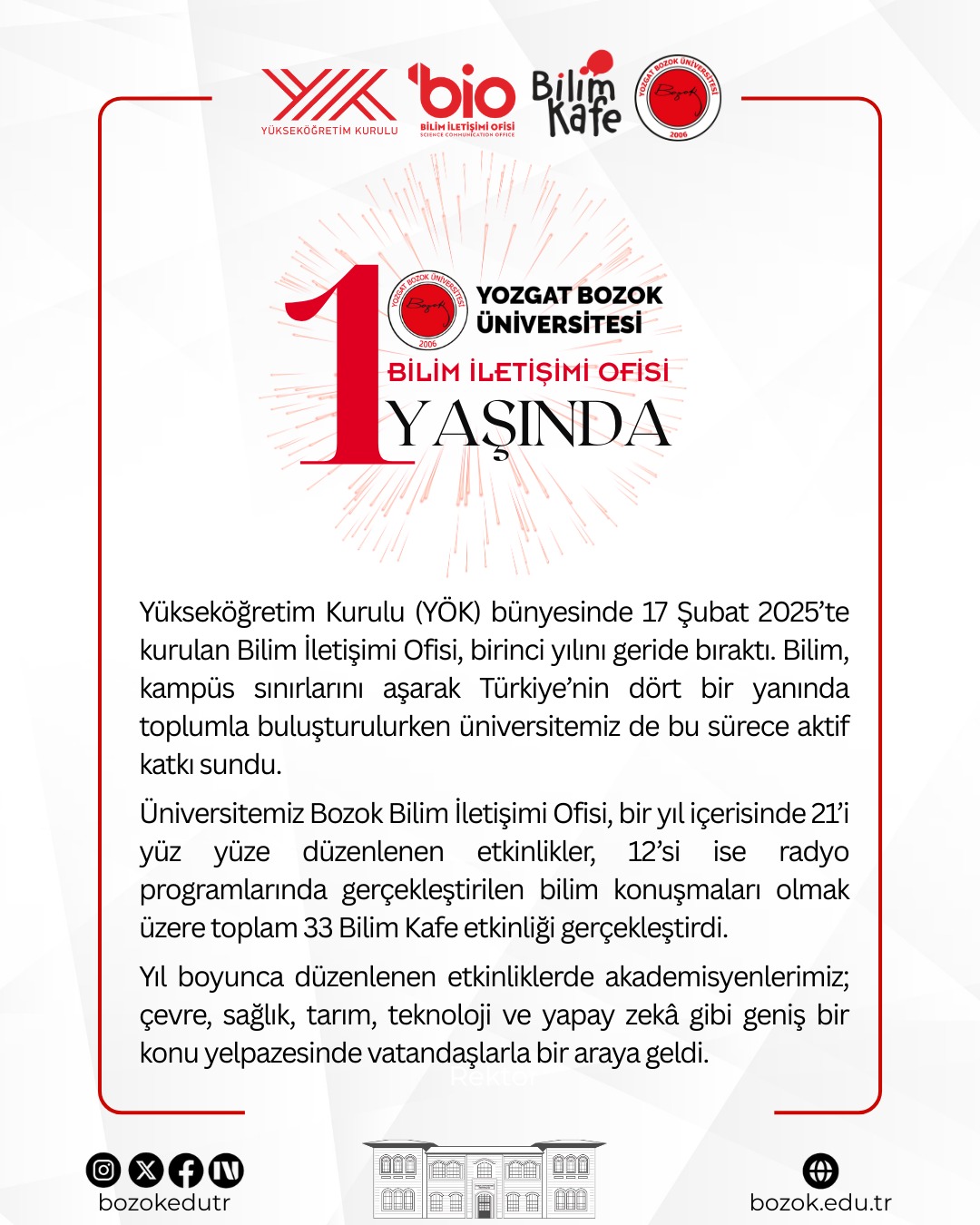 Yükseköğretim Kurulu (YÖK) bünyesinde 17 Şubat 2025’te kurulan Bilim İletişimi Ofisi, birinci yılını geride bıraktı. 170’ten fazla üniversite tarafından 2025 yılı boyunca düzenlenen 1200 “Bilim Kafe” etkinliğiyle bilim, kampüs sınırlarını aşarak Türkiye’nin dört bir yanında toplumla buluşturulurken üniversitemiz de bu sürece aktif katkı sundu.