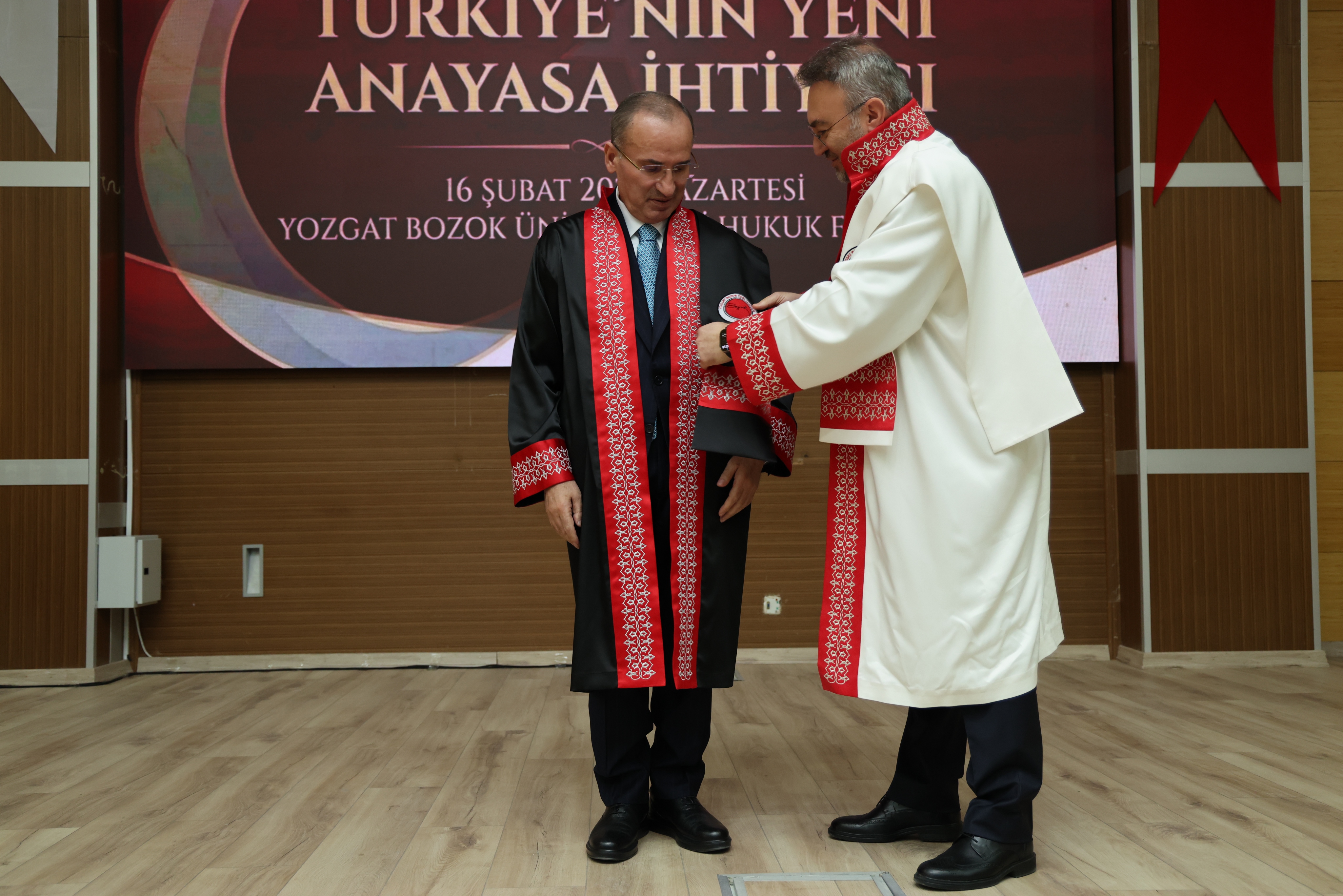 Konferansın ardından Üniversitemiz Rektörü Prof. Dr. Evren Yaşar da TBMM Başkanvekili Bekir Bozdağ’a cübbe giydirerek fahri doktora belgesini takdim etti.