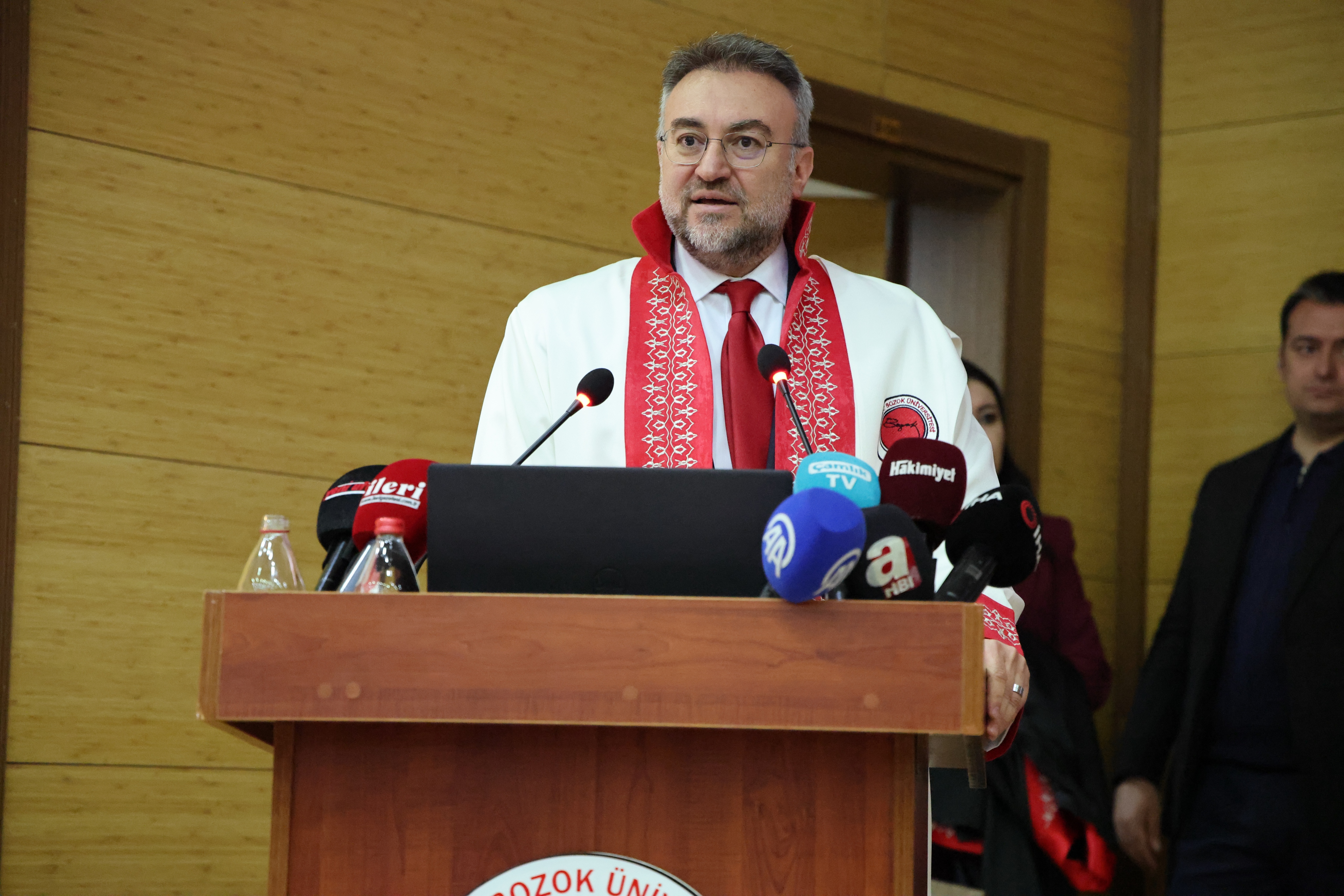 Programda konuşan Üniversitemiz Rektörü Prof. Dr. Evren Yaşar, “Topluma ve devlete uzun yıllar boyunca farklı görevlerde hizmet etmiş, hukuk ve siyaset alanında önemli sorumluluklar üstlenmiş Sayın Bekir Bozdağ’a fahri doktora ünvanını tevcih etmek üzere bir aradayız. Fahri doktora yalnızca akademik bir ünvan değil, aynı zamanda toplumun gelişimine, adalet anlayışına ve kamu hizmetine yapılan katkıların üniversite hafızasında anlam bulmasıdır. Sayın Bozdağ, üstlendiği görevlerde hukukun üstünlüğünü, demokratik değerleri ve kamu yararını önceleyen yaklaşımıyla ülkemizin yönetim ve hukuk hayatına önemli katkılar sunmuştur. Üniversiteler bilgi üreten, eleştiren ve aynı zamanda toplumsal hafızayı oluşturan kurumlardır. Bu çerçevede, farklı alanlarda ülkesine hizmet etmiş isimleri onurlandırmak, genç kuşaklara ilham verecek örnekleri görünür kılmak da akademinin sorumlulukları arasındadır. Bugün tevdi ettiğimiz bu unvanın, üniversitemiz ile kamu yönetimi arasındaki bilgi ve tecrübe köprülerini güçlendireceğine; öğrencilerimiz için ise kamu hizmetine adanmış bir yaşamın değerini hatırlatan anlamlı bir örnek olacağına inanıyorum. Bu vesileyle, Sayın Bakanım Bekir Bozdağ’a üniversitemiz adına hoş geldiniz diyor; kendilerini fahri doktora unvanı ile onurlandırmaktan duyduğumuz memnuniyeti ifade ediyor, saygılarımı sunuyorum.” dedi.