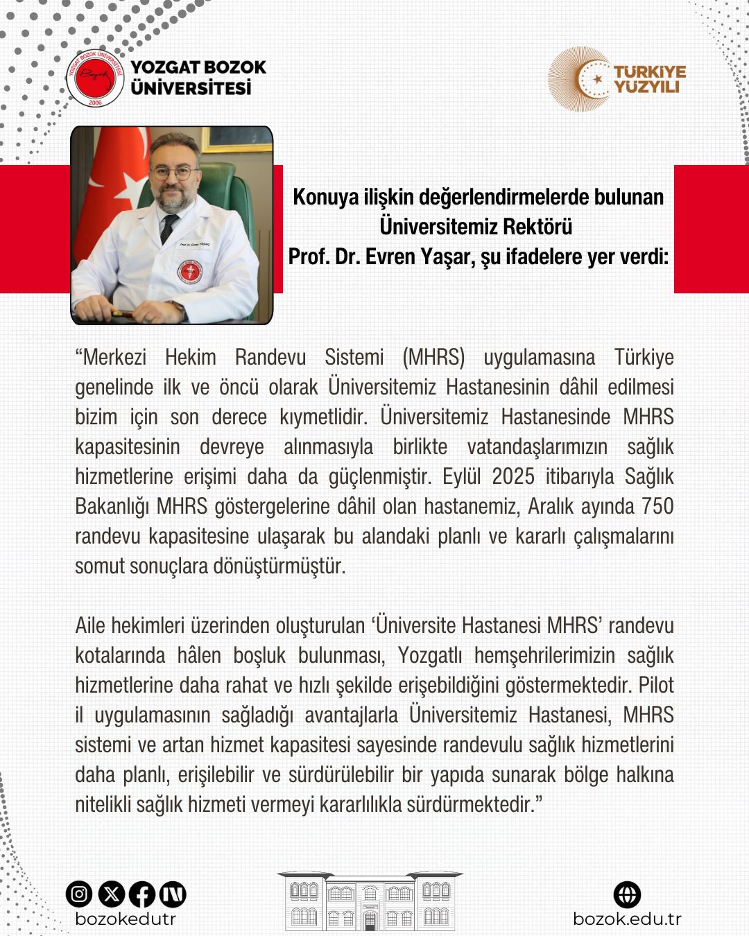 “Merkezi Hekim Randevu Sistemi (MHRS) uygulamasına Türkiye genelinde ilk ve öncü olarak Üniversitemiz Hastanesinin dâhil edilmesi bizim için son derece kıymetlidir. Üniversitemiz Hastanesinde MHRS kapasitesinin devreye alınmasıyla birlikte vatandaşlarımızın sağlık hizmetlerine erişimi daha da güçlenmiştir. Eylül 2025 itibarıyla Sağlık Bakanlığı MHRS göstergelerine dâhil olan hastanemiz, Aralık ayında 750 randevu kapasitesine ulaşarak bu alandaki planlı ve kararlı çalışmalarını somut sonuçlara dönüştürmüştür.