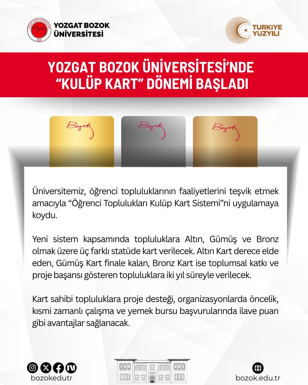 “Öğrencilerimizin yalnızca akademik başarılarıyla değil; sosyal, kültürel, sportif ve toplumsal sorumluluk alanlarındaki üretkenlikleriyle de öne çıkmalarını önemsiyoruz. Kulüp Kart Sistemi ile üniversitemizi ulusal ve uluslararası düzeyde temsil eden, proje üreten ve topluma katkı sunan topluluklarımızı teşvik etmeyi amaçlıyoruz. Bu sistem, öğrencilerimizin motivasyonunu artıracak ve kurumsal aidiyet duygusunu güçlendirecektir.”