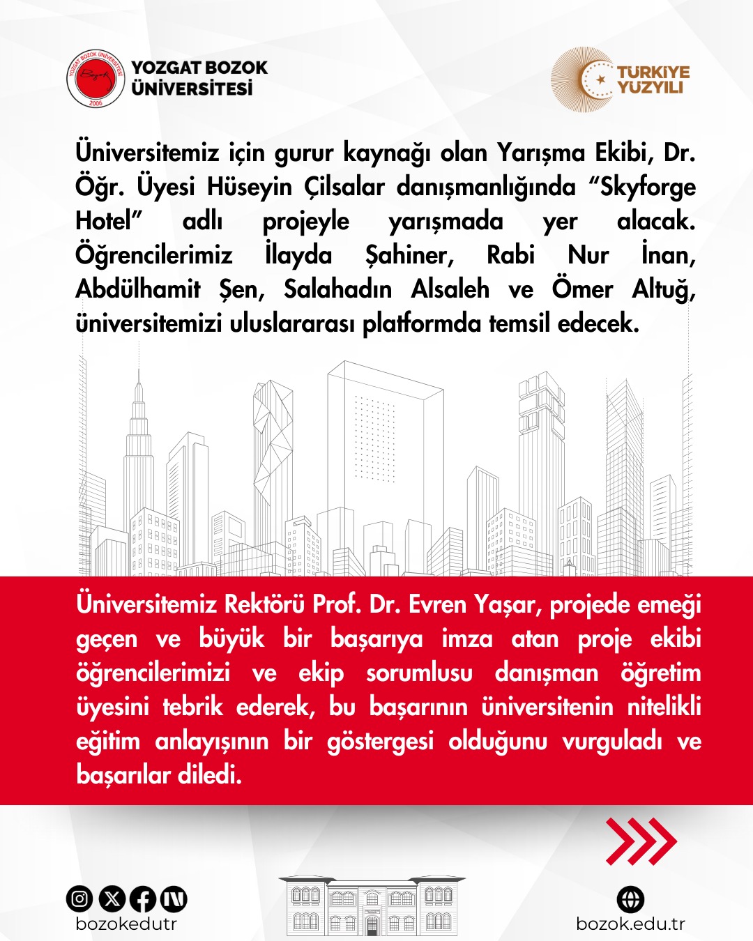 Takım, Dr. Öğr. Üyesi Hüseyin Çilsalar danışmanlığında “Skyforge Hotel” adlı projeyle yarışmada yer alacak. Öğrenciler İlayda Şahiner, Rabi Nur İnan, Abdülhamit Şen, Salahadın Alsaleh ve Ömer Altuğ, üniversitemizi uluslararası platformda temsil edecek.