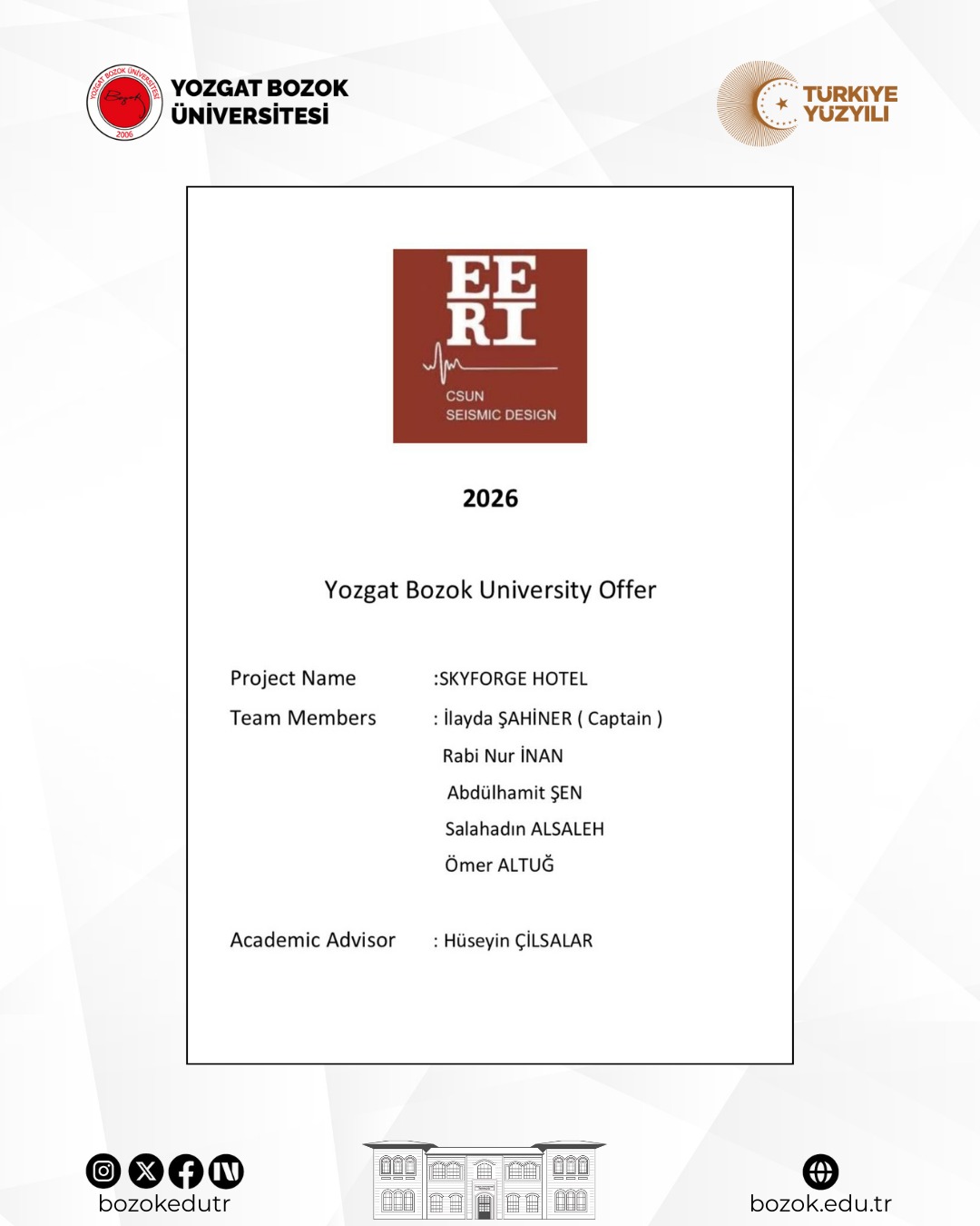Üniversitemiz Mühendislik-Mimarlık Fakültesi İnşaat Mühendisliği Bölümü öğrencilerinden oluşan Bozok İnşaat Topluluğu, Amerika Birleşik Devletleri’nin Oregon eyaletine bağlı Portland kentinde düzenlenecek 2026 Seismic Design Competition yarışmasına Türkiye’den seçilen 5 üniversite arasına girerek katılmaya hak kazandı.