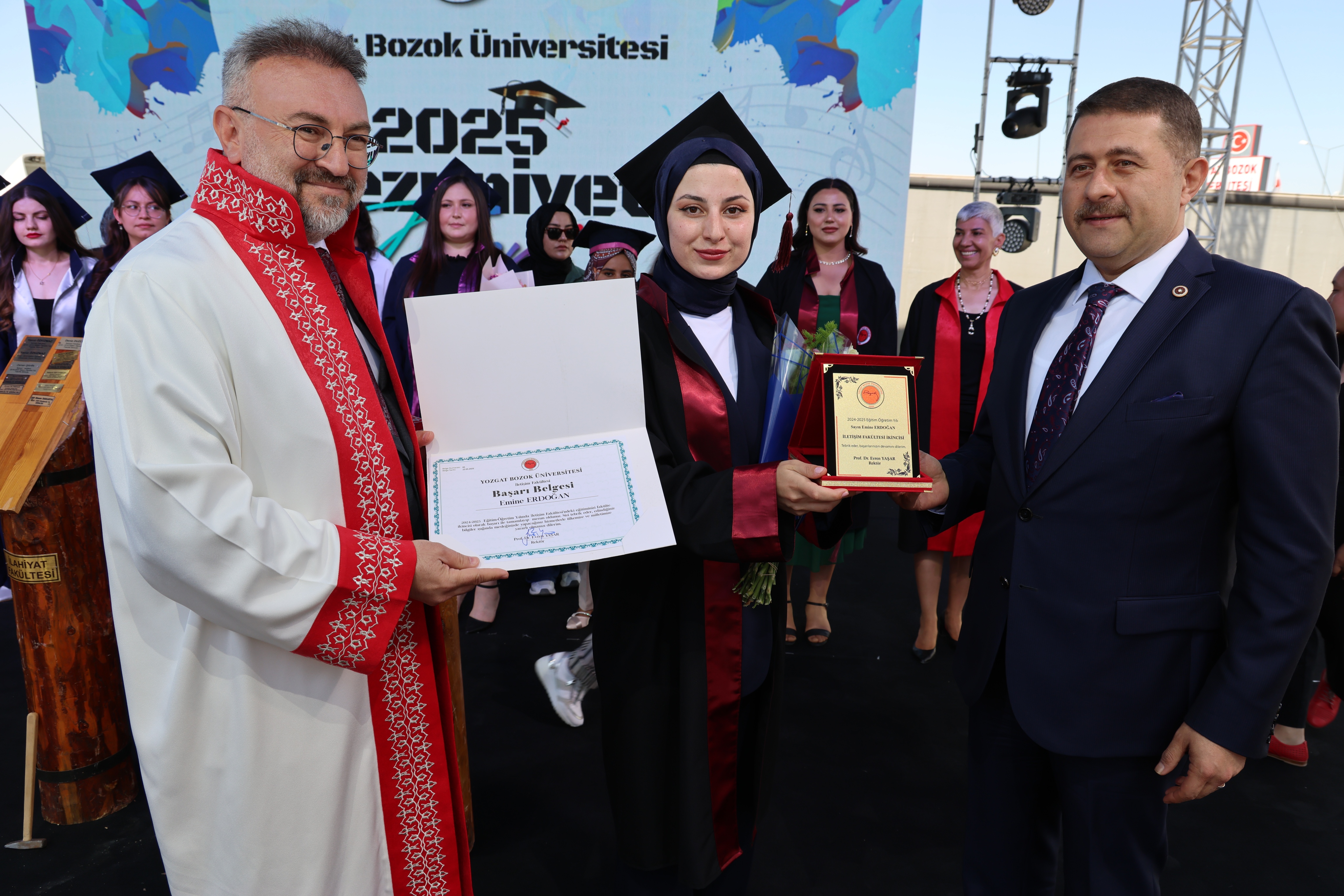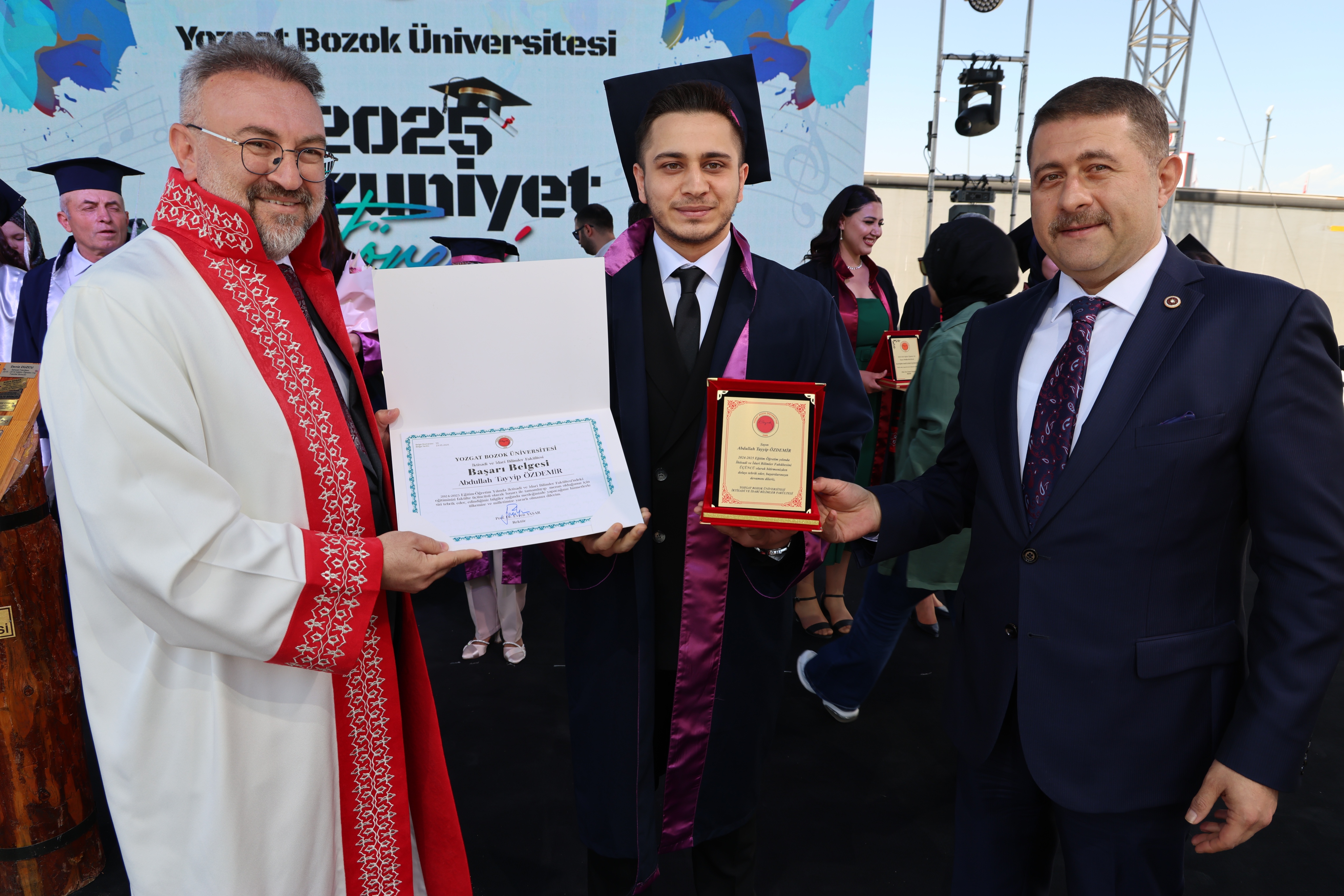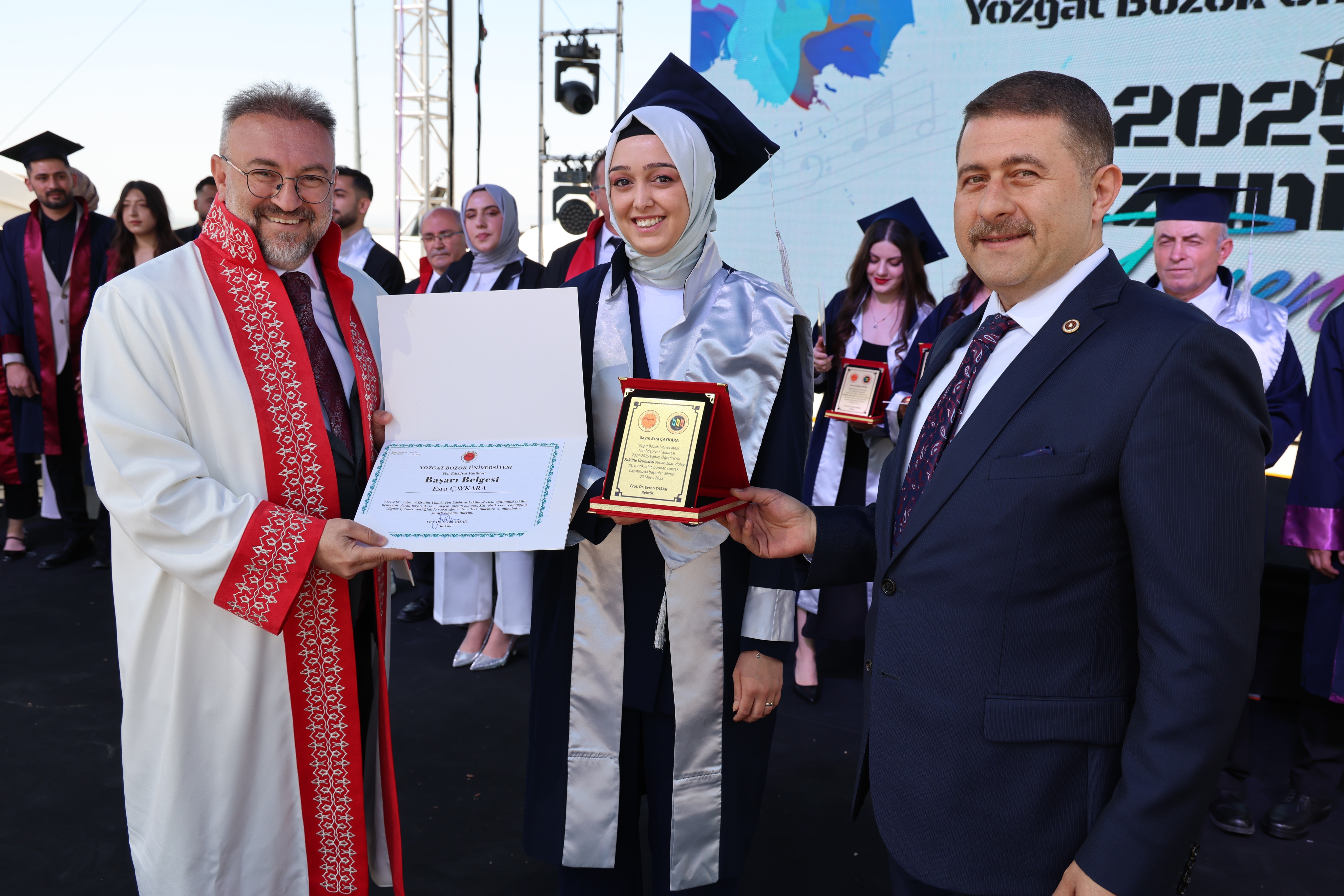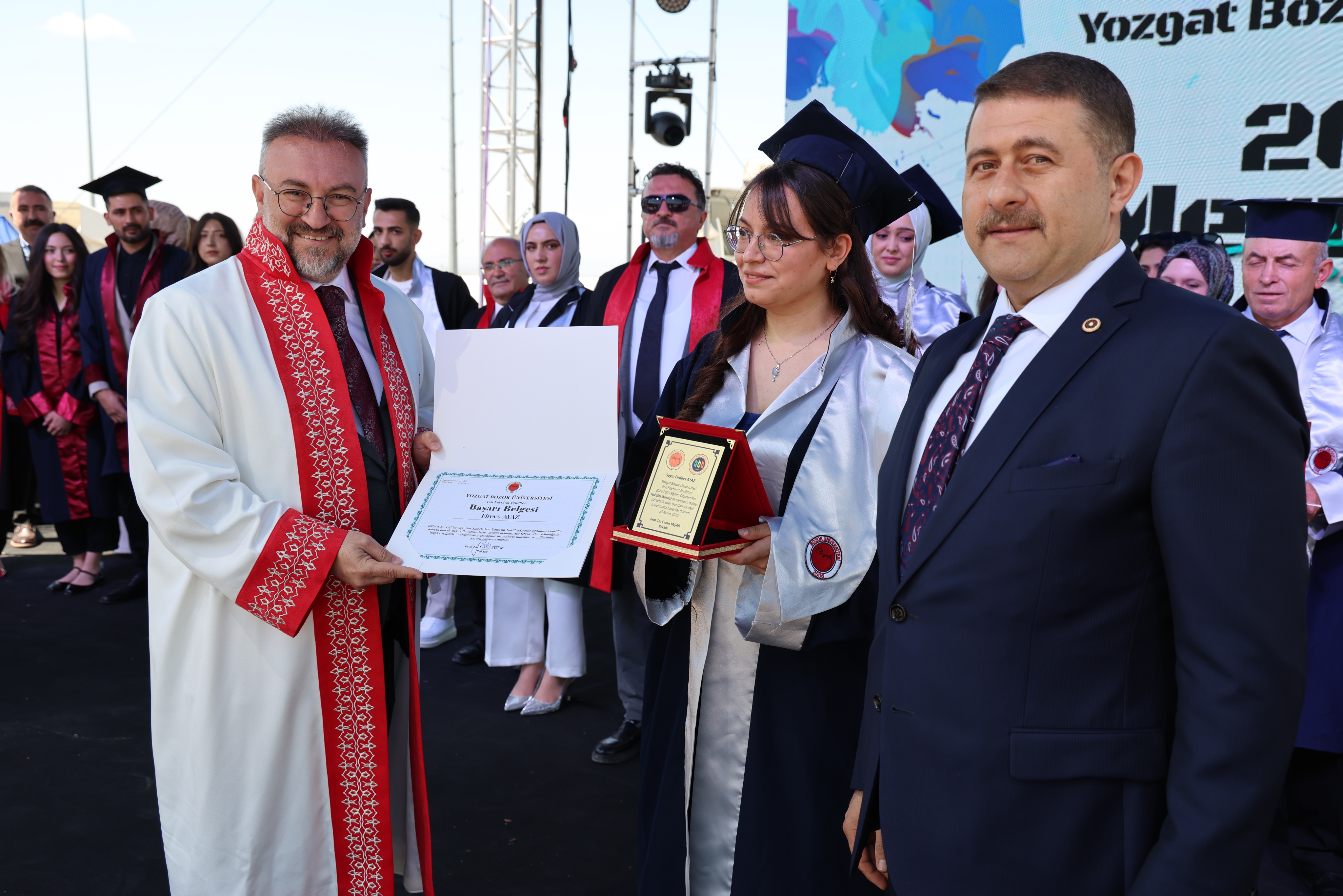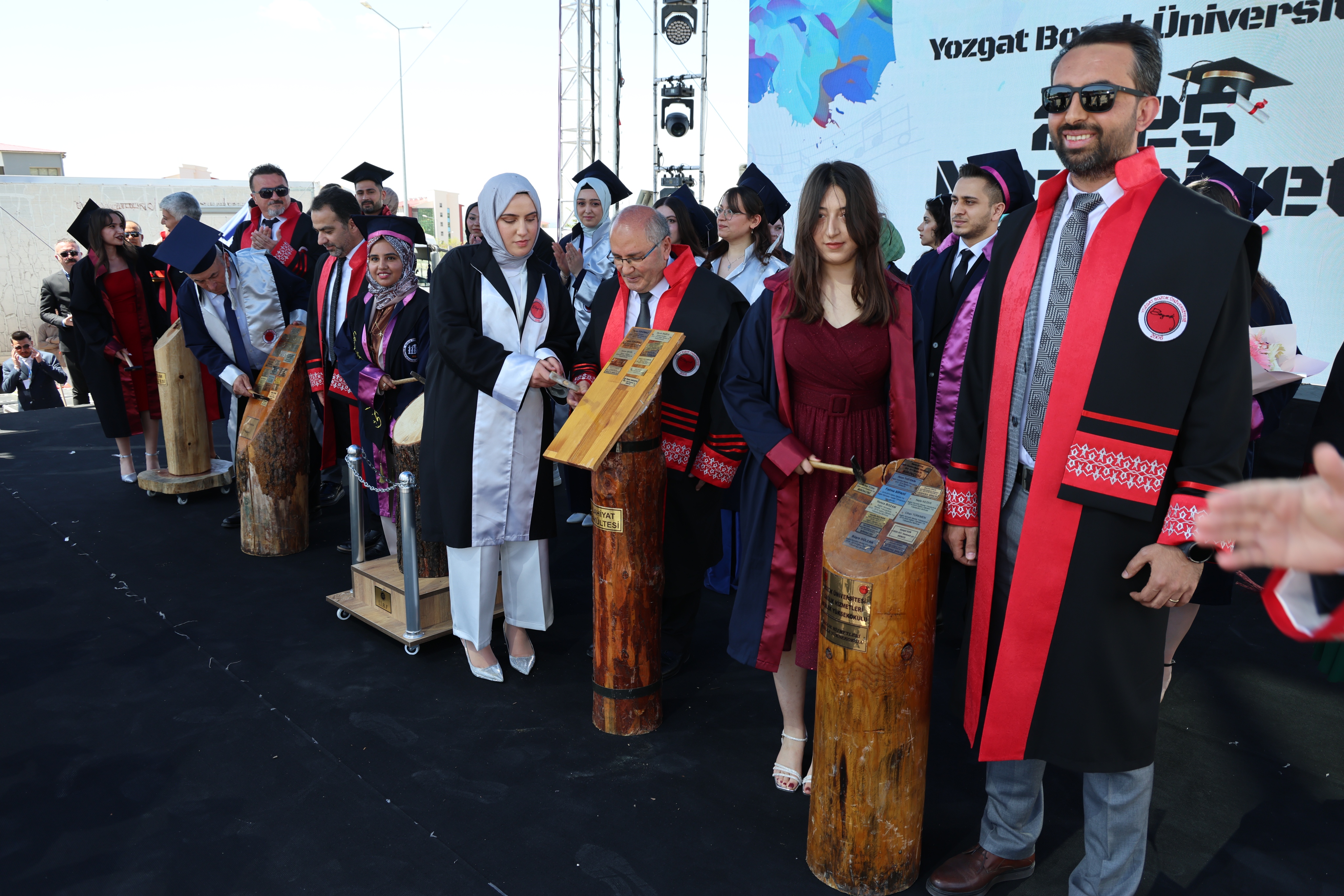 Törende, fakülte birincileri yaş kütüklerine isim plakalarını çaktı. Dereceye giren öğrencilerin mezuniyet diplomaları ve plaketleri Yozgat Milletvekili İbrahim Ethem Sedef ve Üniversitemiz Rektörü Prof. Dr. Evren Yaşar tarafından verildi.
