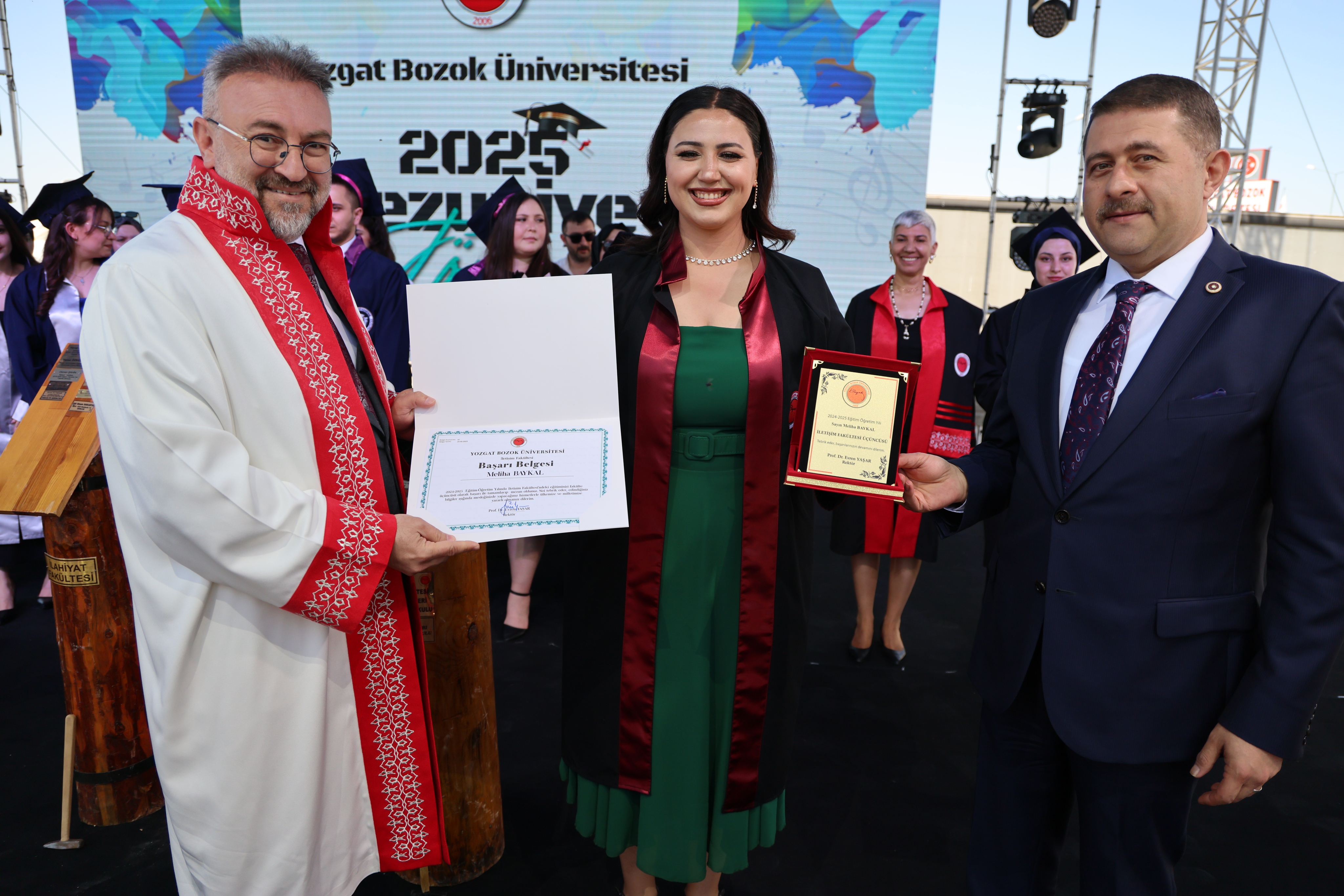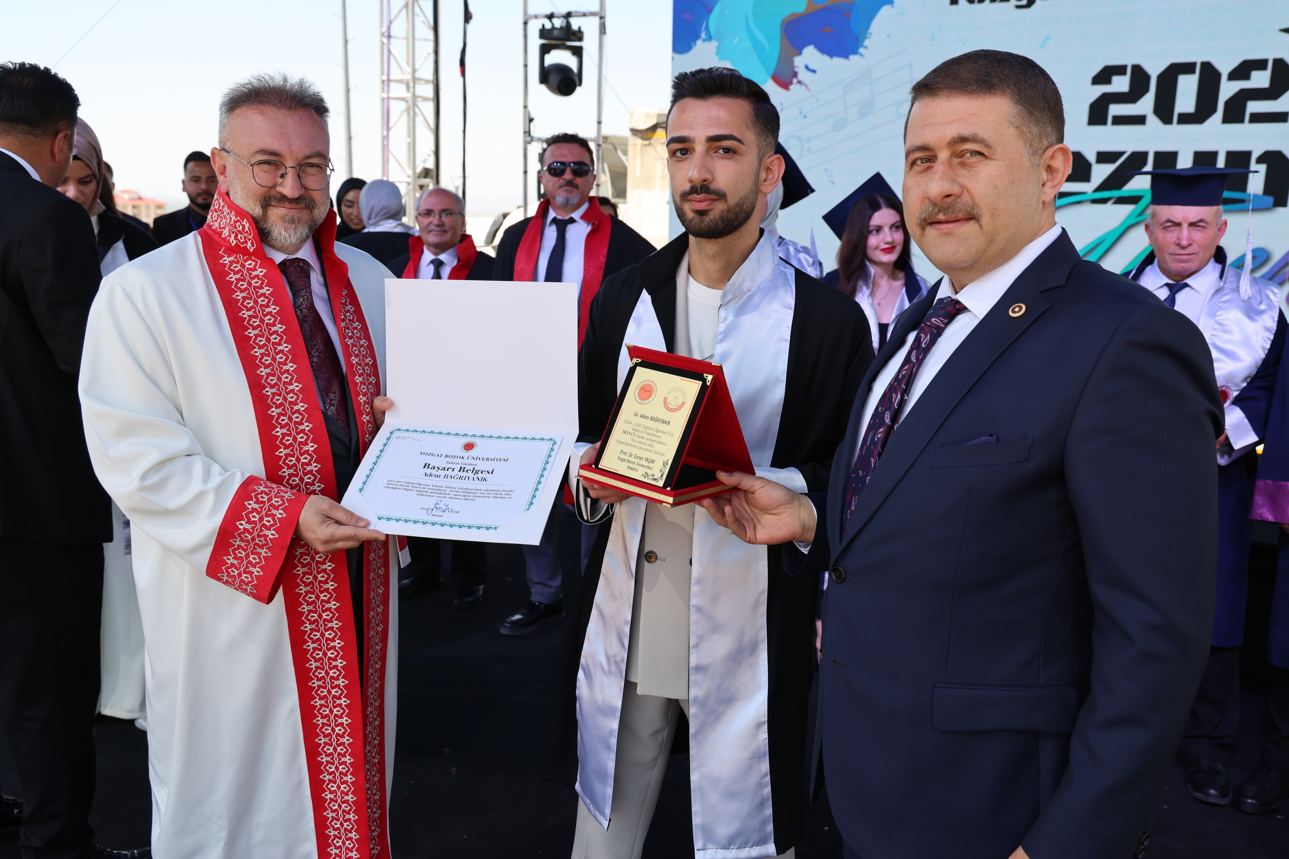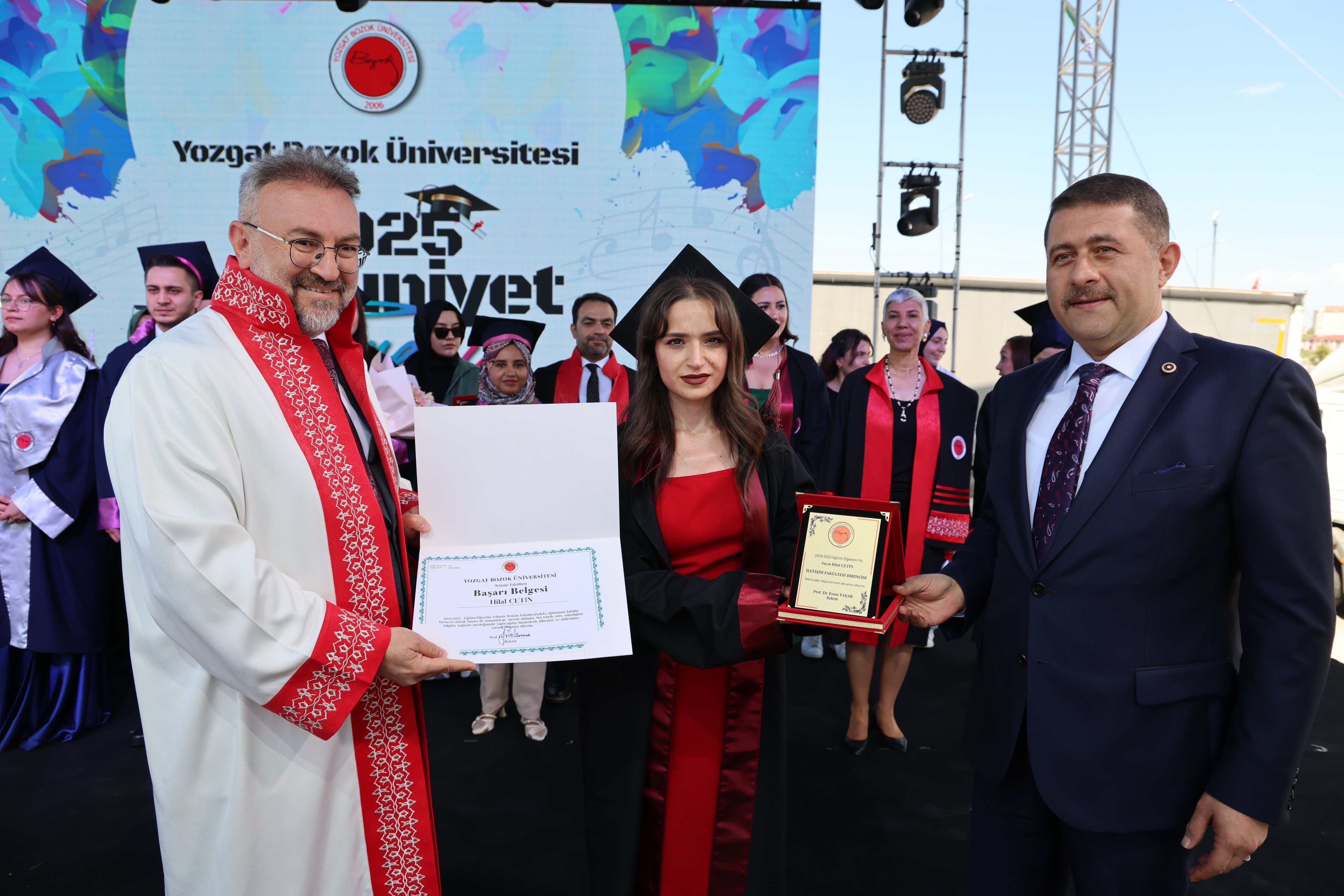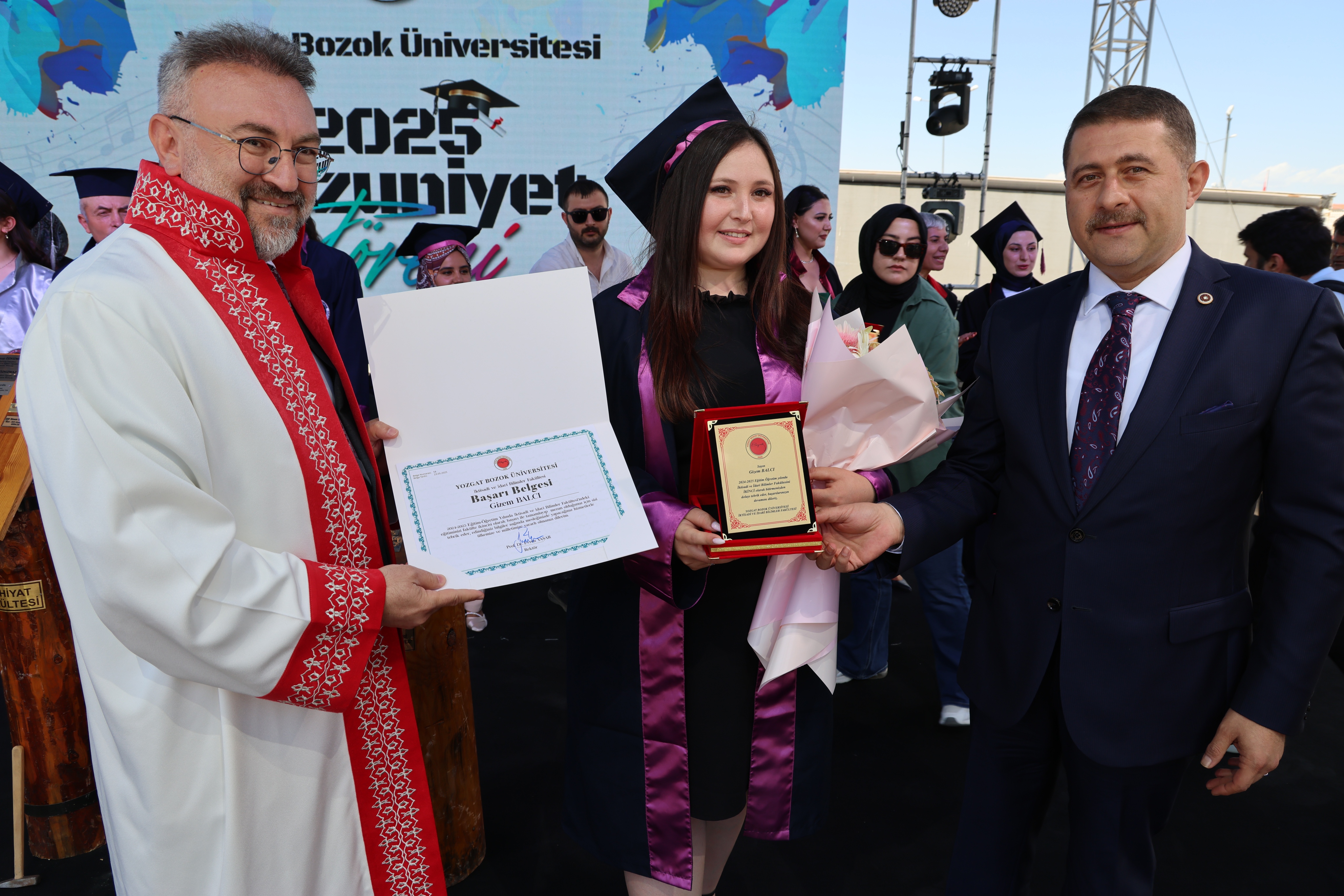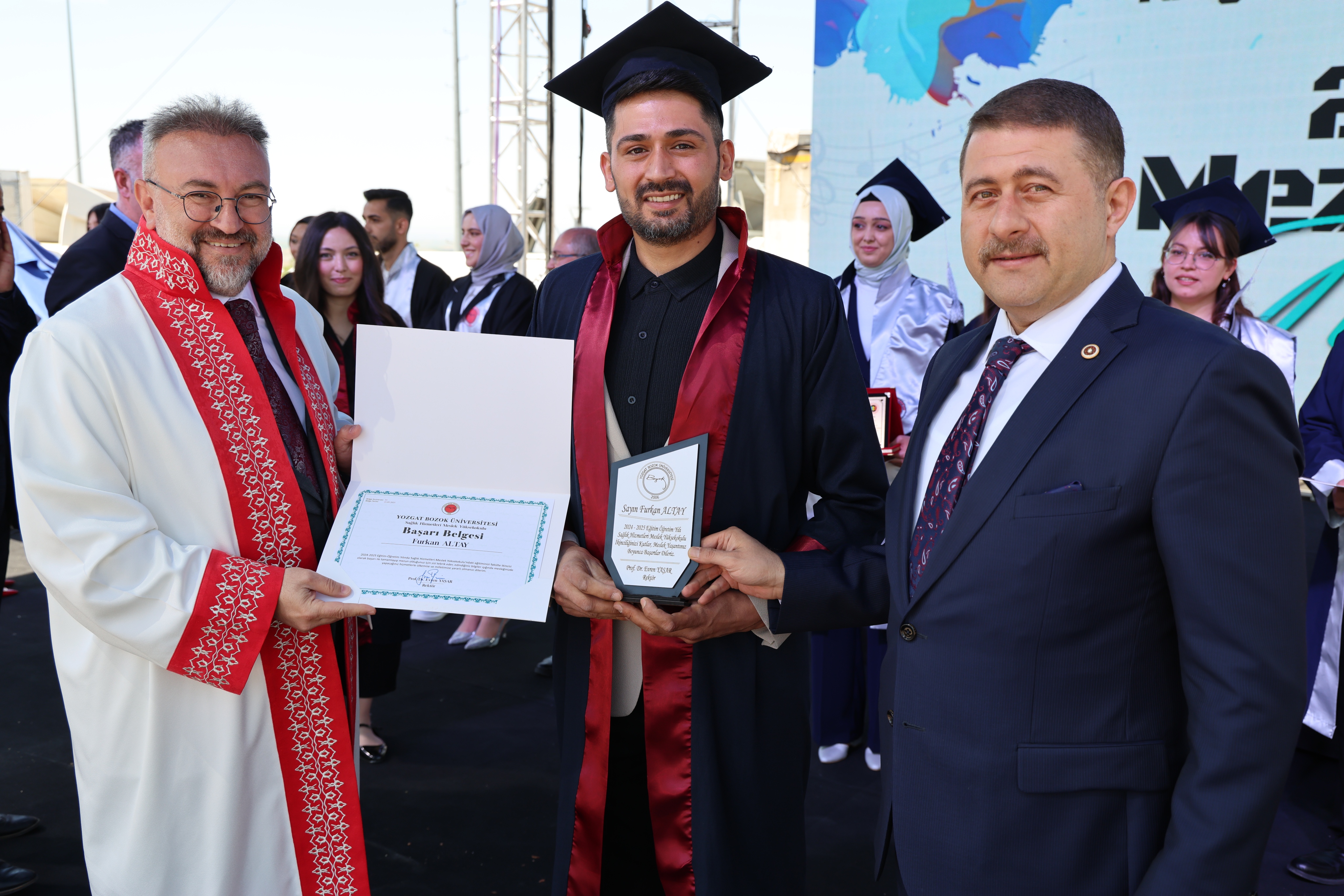 Törende, fakülte birincileri yaş kütüklerine isim plakalarını çaktı. Dereceye giren öğrencilerin mezuniyet diplomaları ve plaketleri Yozgat Milletvekili İbrahim Ethem Sedef ve Üniversitemiz Rektörü Prof. Dr. Evren Yaşar tarafından verildi.
