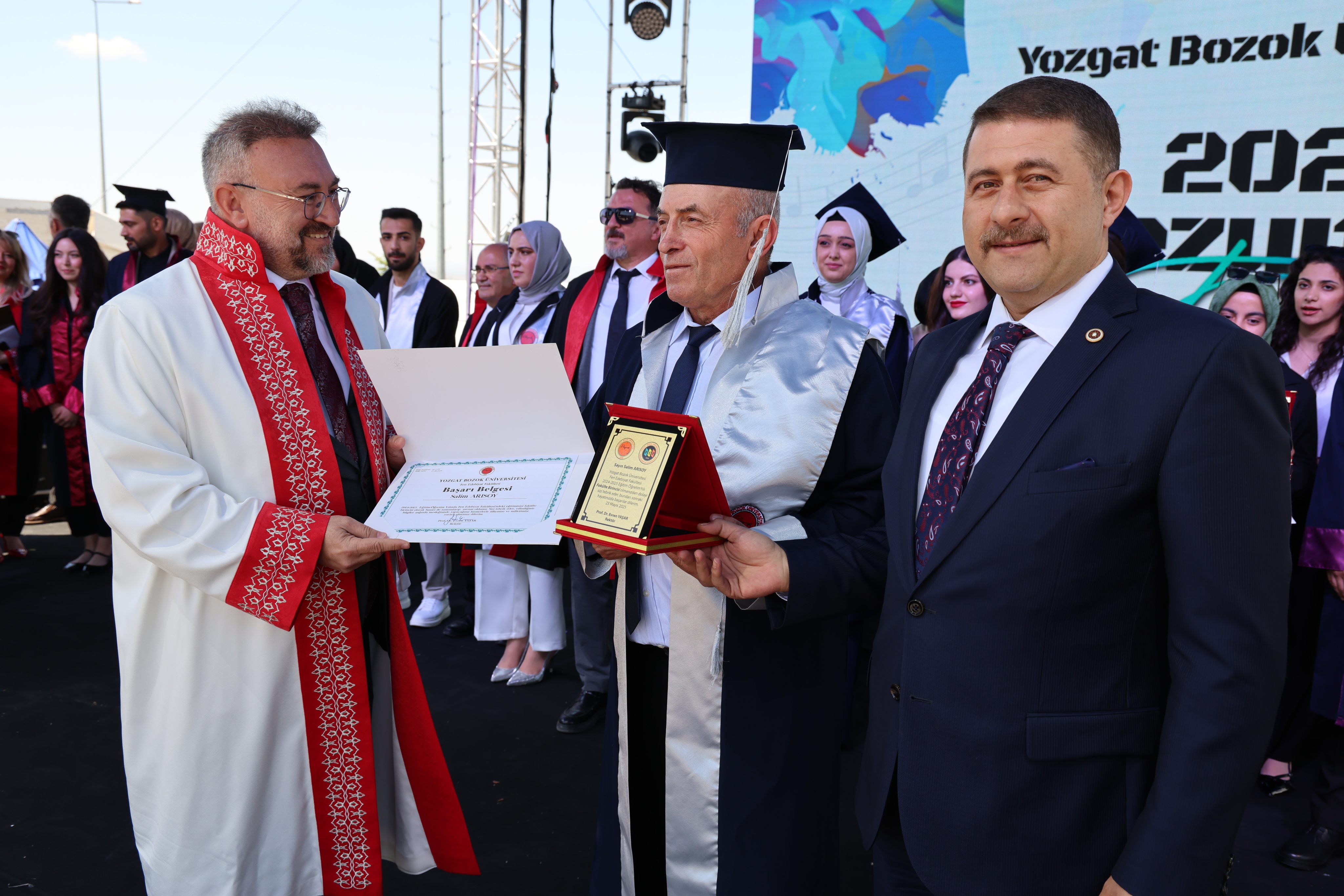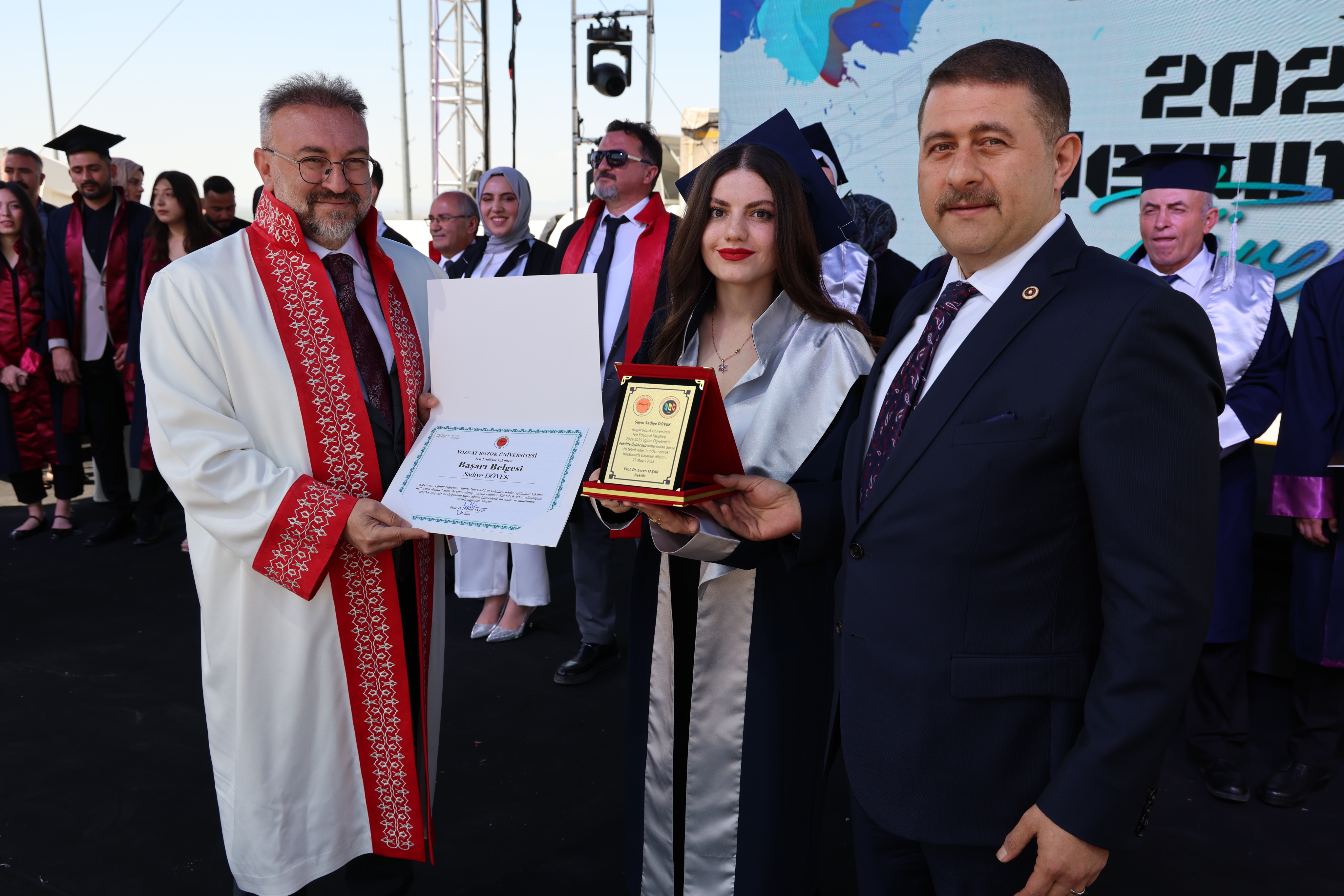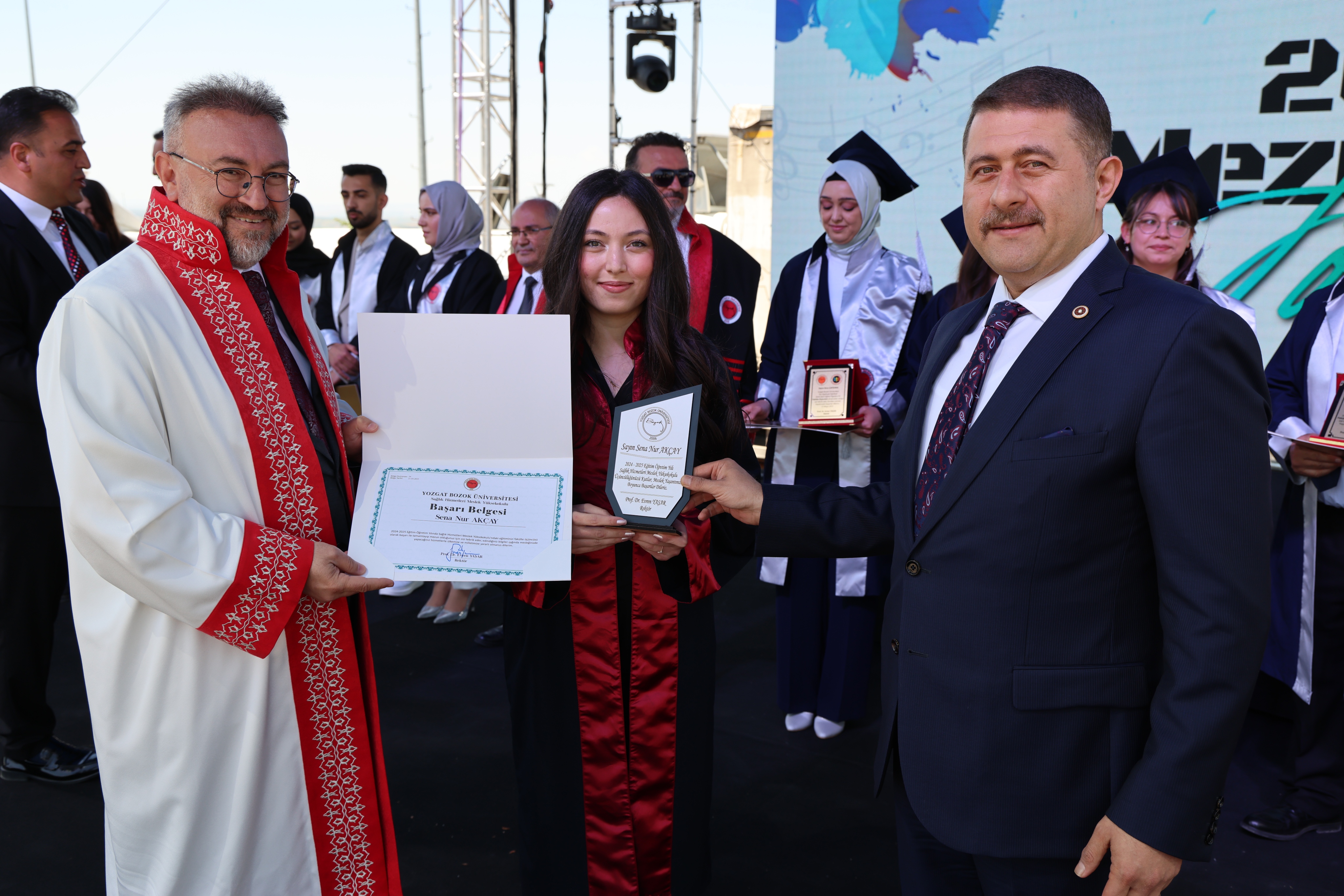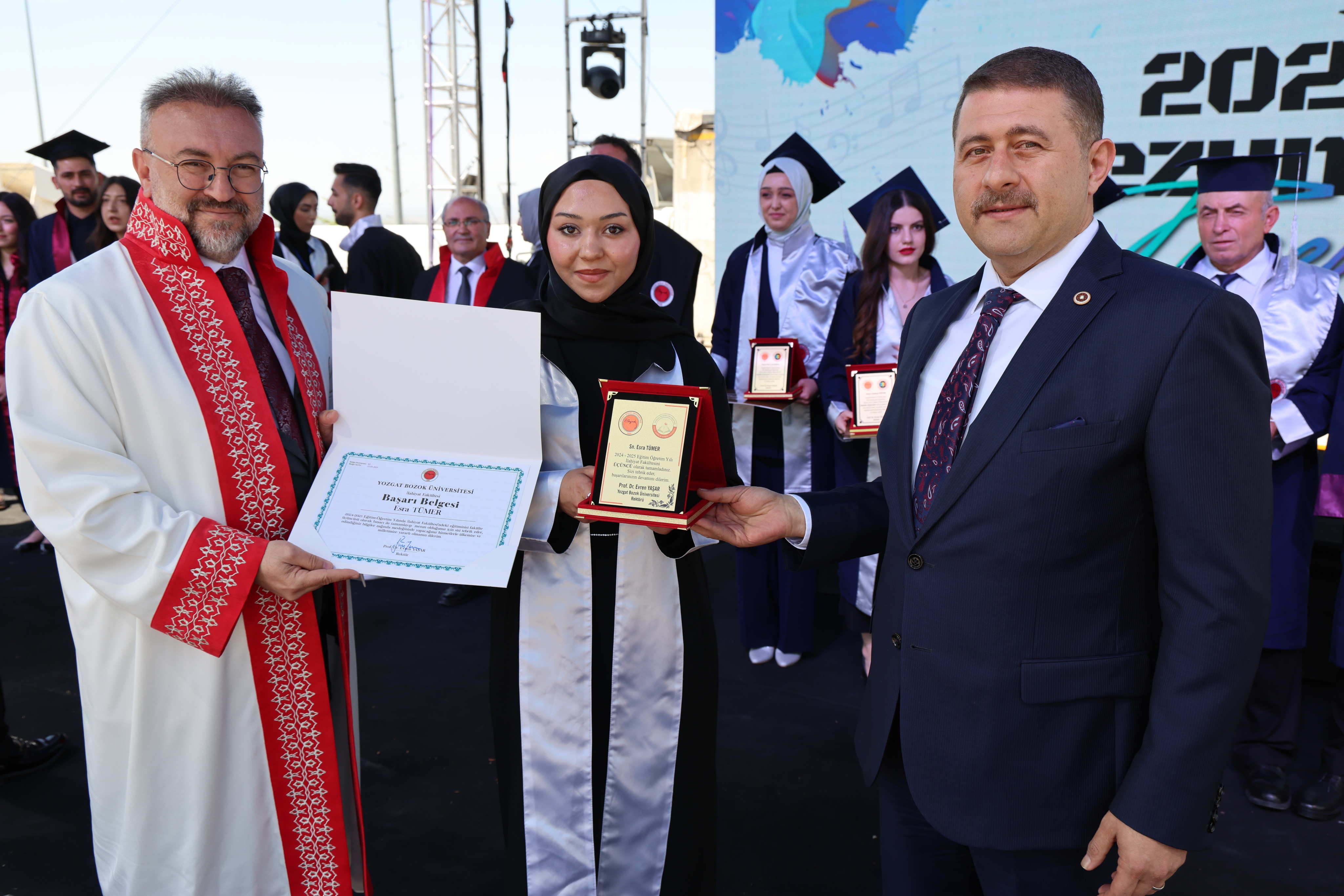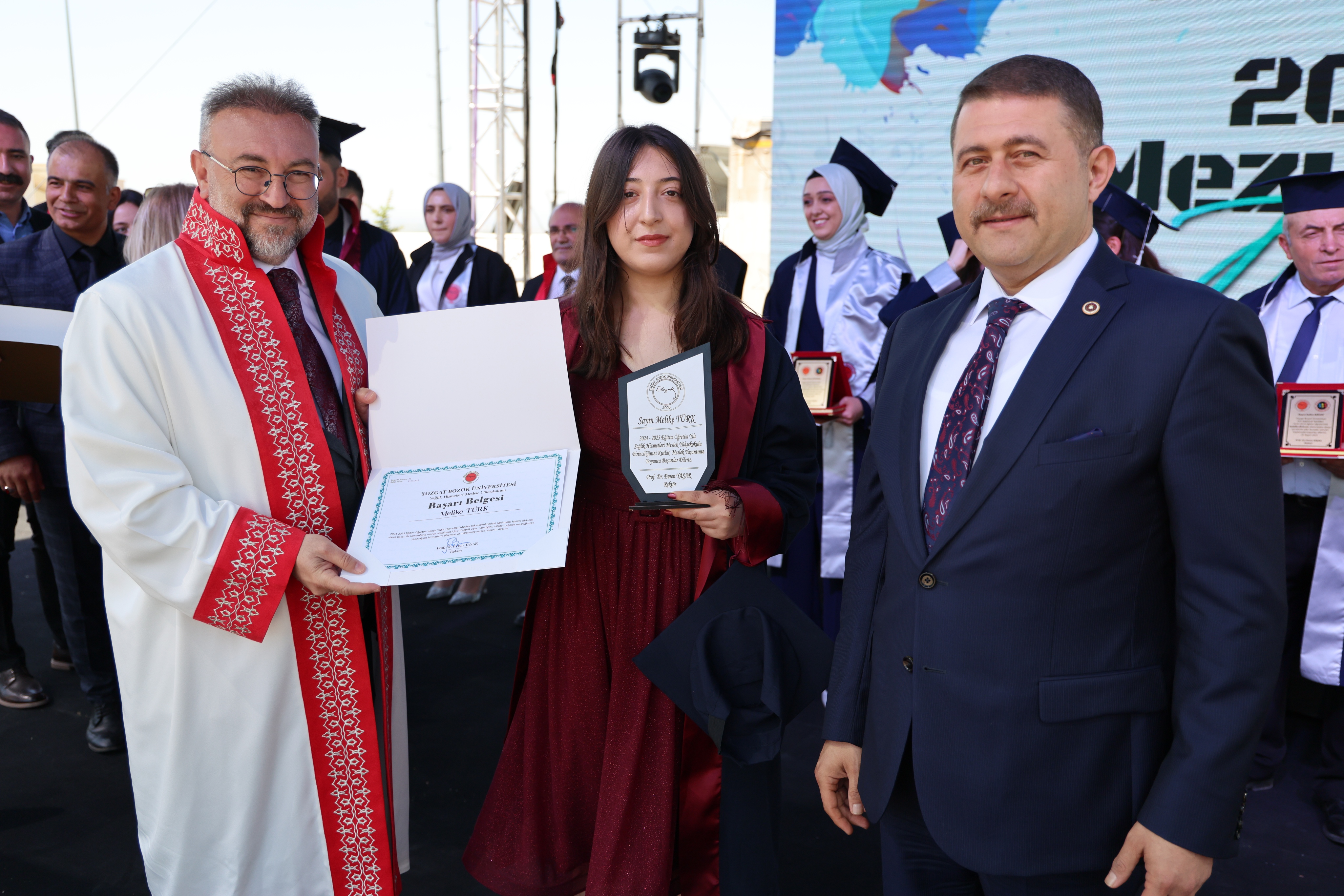 Törende, fakülte birincileri yaş kütüklerine isim plakalarını çaktı. Dereceye giren öğrencilerin mezuniyet diplomaları ve plaketleri Yozgat Milletvekili İbrahim Ethem Sedef ve Üniversitemiz Rektörü Prof. Dr. Evren Yaşar tarafından verildi.