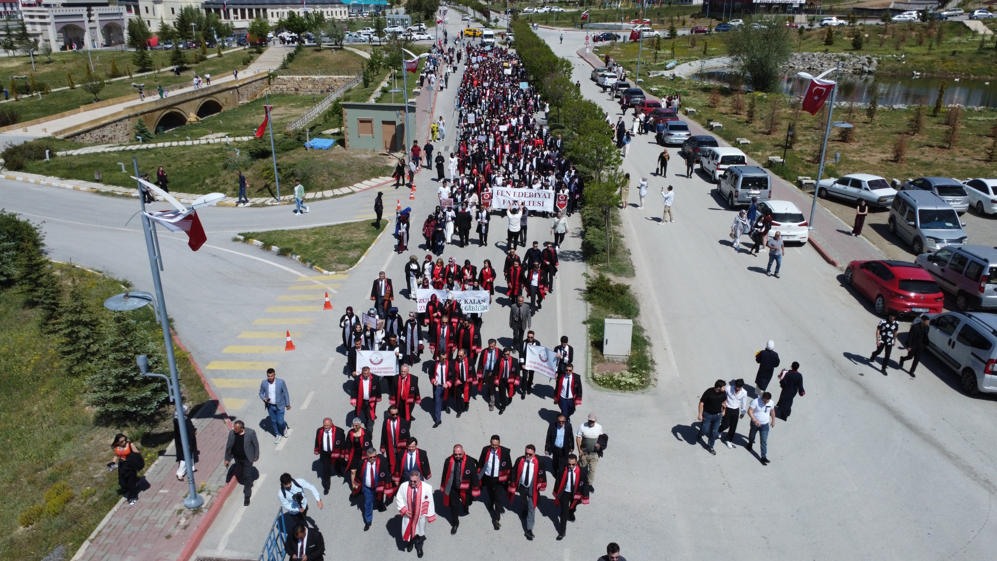 Mezuniyet programı, Üniversitemiz merkez kampüsünde Üniversitemiz Rektörü Prof. Dr. Evren Yaşar tarafından Atatürk Anıtı'na çelenk sunumu, saygı duruşu ve İstiklal Marşı'nın okunması ile başladı. Program, Üniversitemiz Rektörü Prof. Dr. Evren Yaşar, Rektör Yardımcıları Prof. Dr. Yusuf Hıdır, Prof. Dr. Güngör Yılmaz, Prof. Dr. Tansel Hacıhasanoğlu, Üniversitemiz Genel Sekreteri Doç. Dr. Mustafa Kocakaya, fakülte dekanları, öğretim üyeleri ve öğrencilerin katıldığı Mezuniyet Kortej Yürüyüşü ile devam etti.