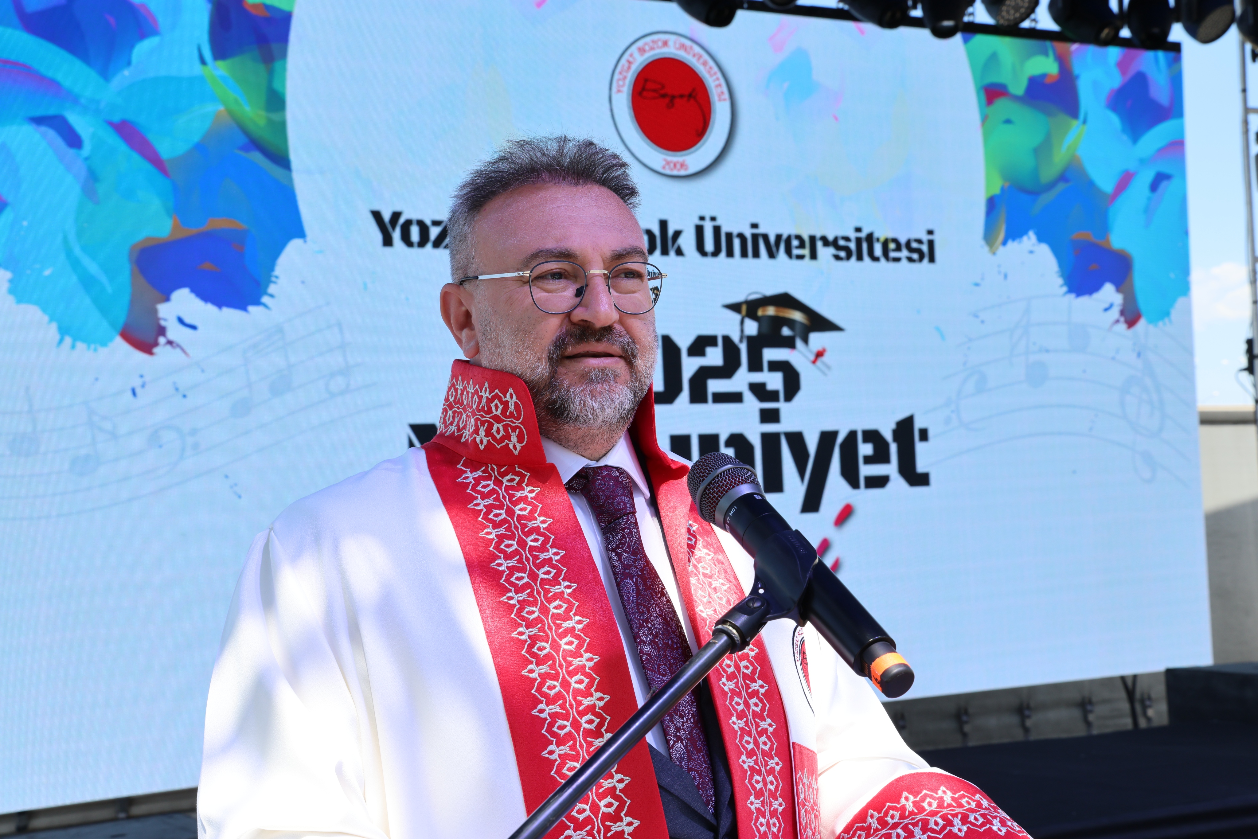 Üniversitemiz Rektörü Prof. Dr. Evren Yaşar yaptığı konuşmada, Yozgat Bozok Üniversitesi olarak bilgiyle, sabırla ve büyük emeklerle yetiştirilen mezunları uğurlamanın onurunu yaşadıklarını ifade etti. Mezuniyetlerin bir veda değil, bir başlangıç olduğunu vurgulayan Rektörümüz Prof. Dr. Yaşar konuşmasının devamında şunları söyledi: “Fen-Edebiyat Fakültemizden evrenin sırlarını, İletişim Fakültemizden sözcüklerin gücünü, İktisadi ve İdari Bilimler Fakültemizden stratejinin inceliklerini, İlahiyat Fakültemizden maneviyatın derinliğini ve Sağlık Hizmetleri Meslek Yüksekokulumuzdan insan hayatına dokunmanın sorumluluğunu öğrenen sizler, artık sadece birer mezun değil; bu ülkenin geleceğini şekillendirecek aktörlerisiniz. Artık hayatın yeni bir evresine adım atıyorsunuz. Bu evre, sadece bilgiyle değil; merakla, vicdanla ve cesaretle yürünmesi gereken bir yol”.