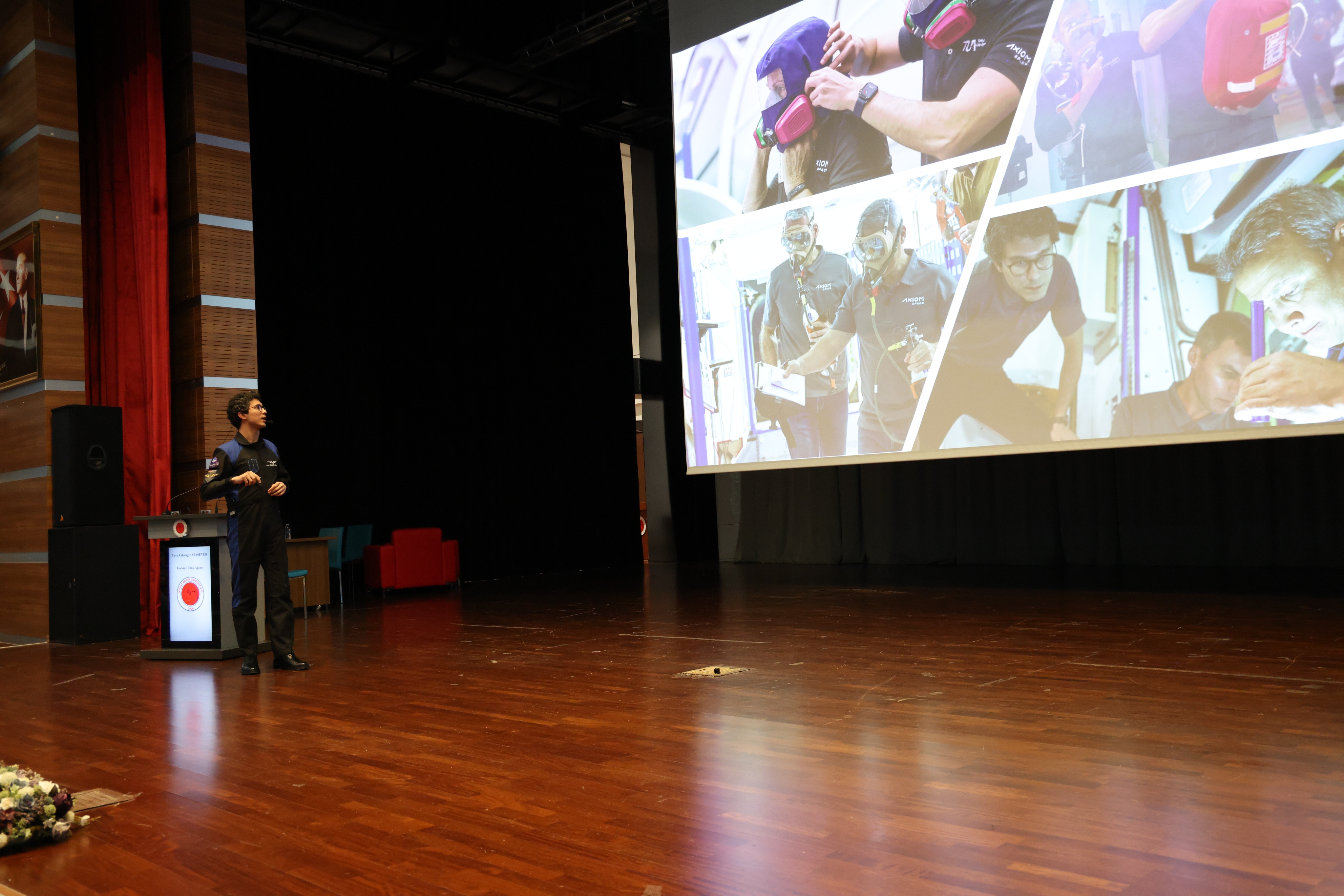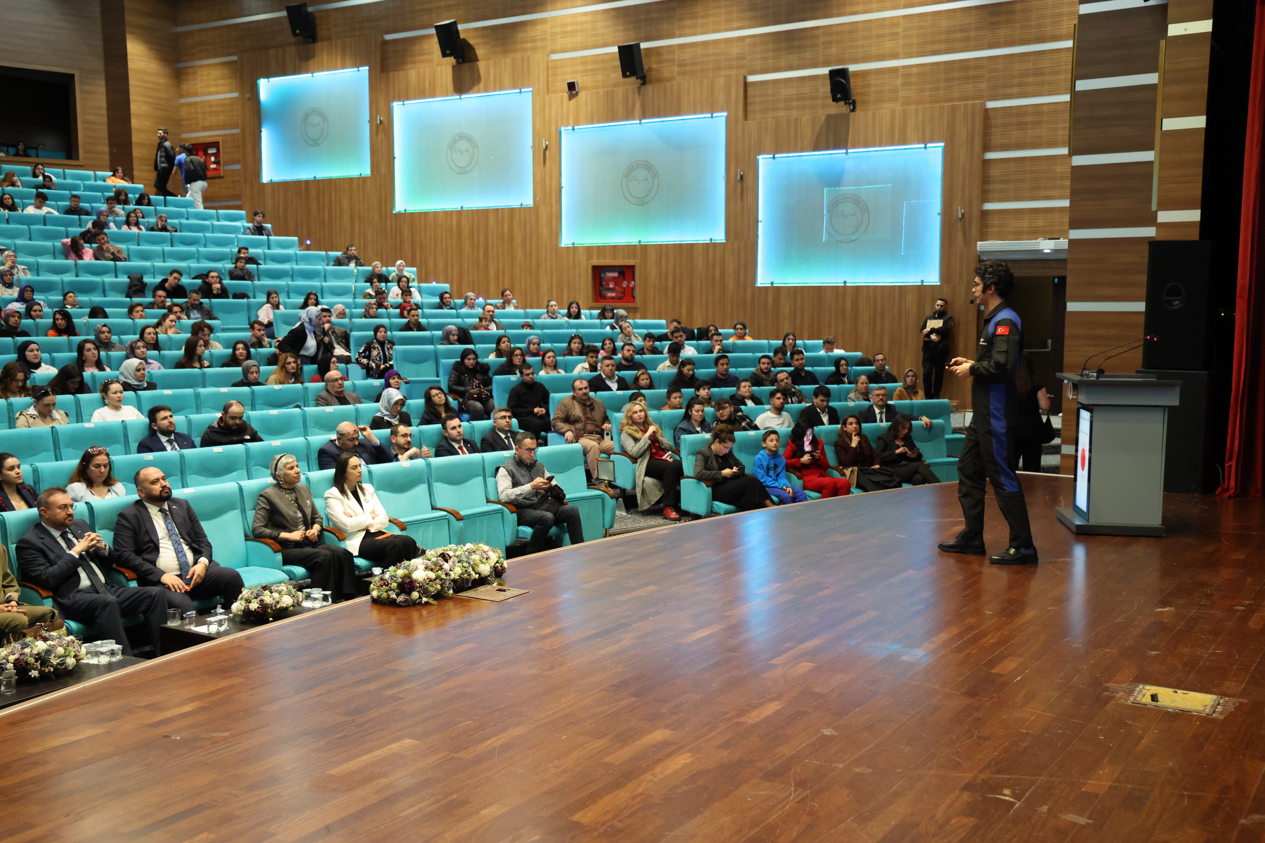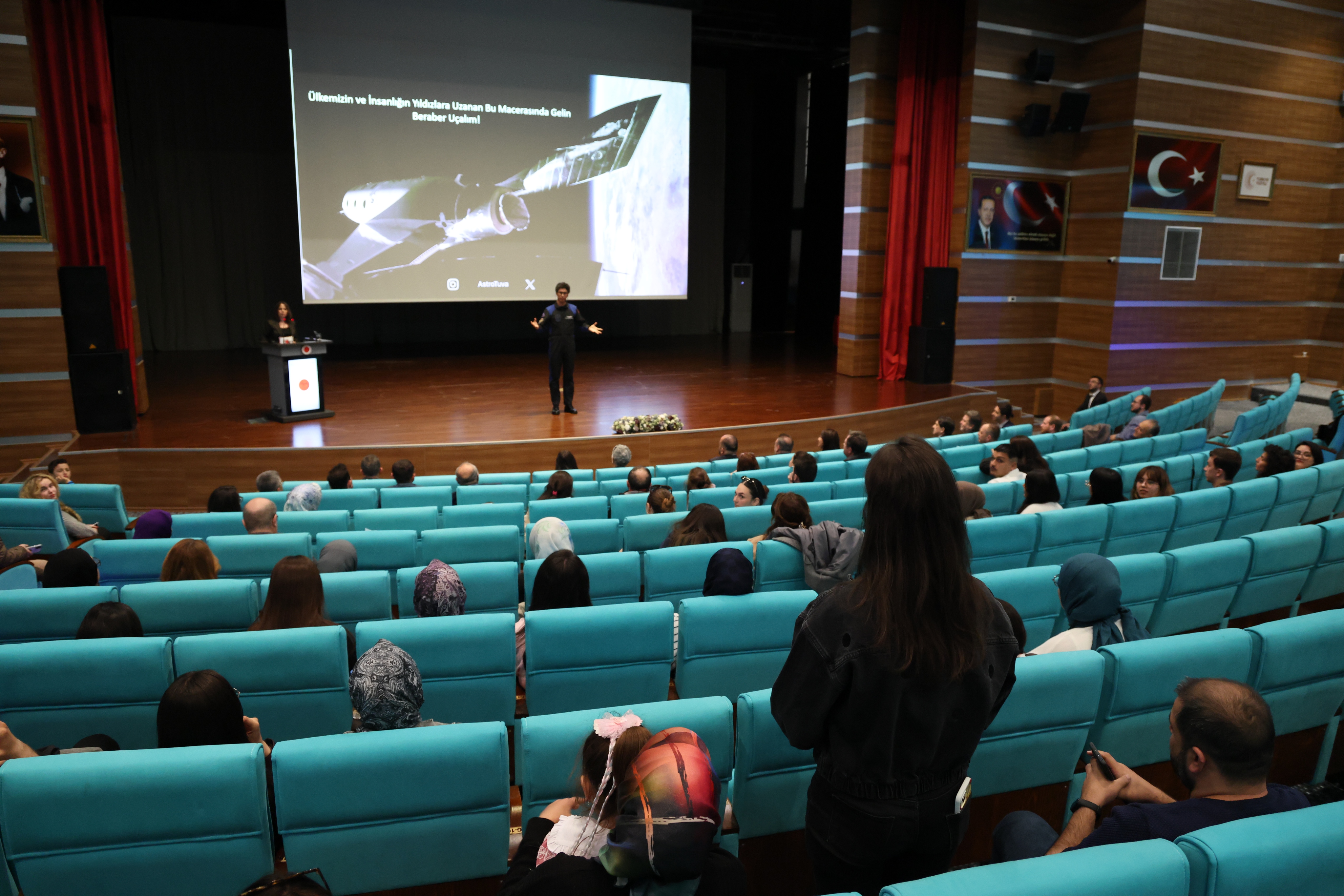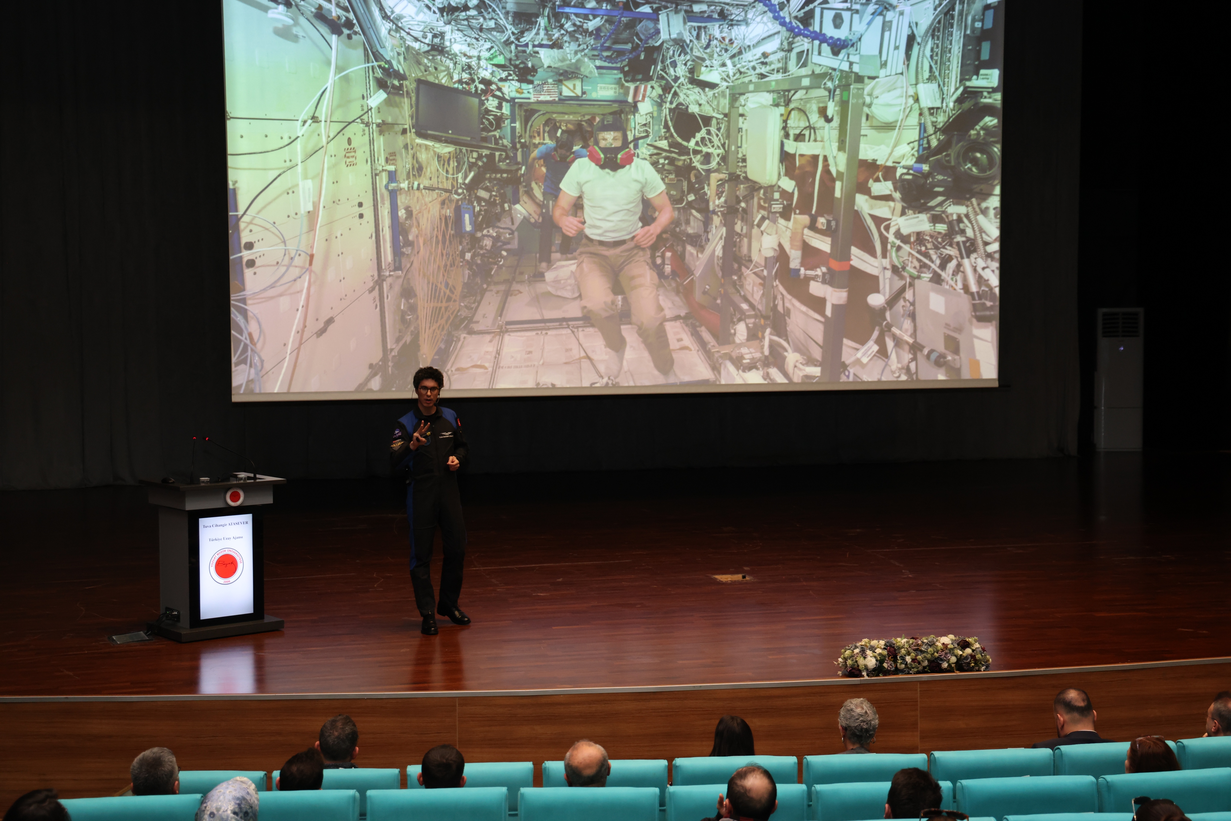 Üniversitemiz Erdoğan Akdağ Kongre ve Kültür Merkezi’nde T.C. Sanayi ve Teknoloji Bakanlığı koordinasyonunda, Milli Teknoloji Hamlesi vizyonu doğrultusunda düzenlenen etkinlikte Atasever, uzay yolculuğu deneyimlerini, bilimsel çalışmalarını ve kariyer sürecini öğrencilerle paylaştı.