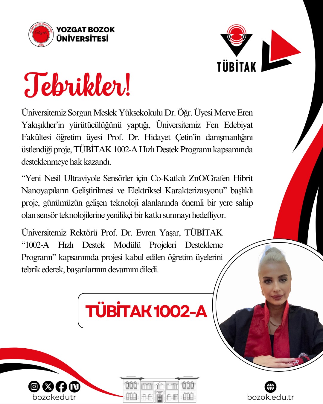 Üniversitemiz Sorgun Meslek Yüksekokulu Dr. Öğr. Üyesi Merve Eren Yakışıklıer’in yürütücülüğünü yaptığı, Üniversitemiz Fen-Edebiyat Fakültesi öğretim üyesi Prof. Dr. Hidayet Çetin’in danışmanlığını üstlendiği proje, TÜBİTAK 1002-A Hızlı Destek Programı kapsamında desteklenmeye hak kazandı.