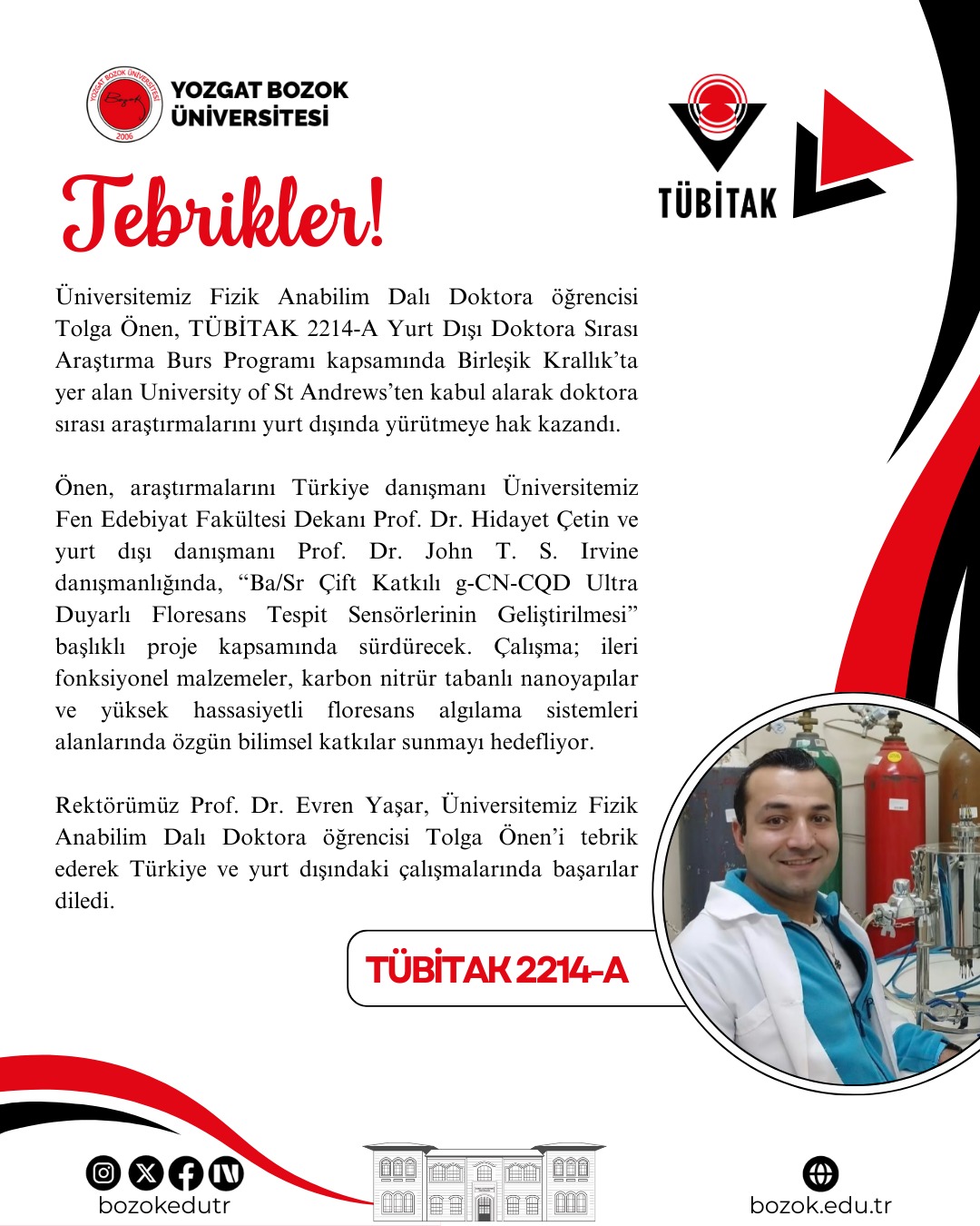 Üniversitemiz Fizik Anabilim Dalı Doktora öğrencisi Tolga Önen, TÜBİTAK 2214-A Yurt Dışı Doktora Sırası Araştırma Burs Programı kapsamında Birleşik Krallık’ta yer alan University of St Andrews’ten kabul alarak doktora sırası araştırmalarını yurt dışında yürütmeye hak kazandı.