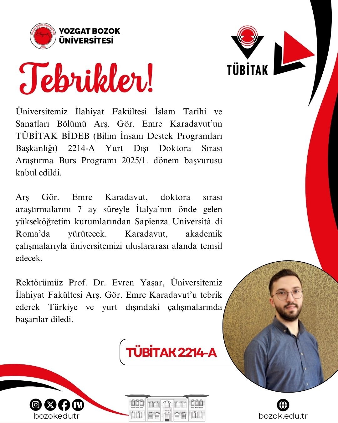 Üniversitemiz İlahiyat Fakültesi İslam Tarihi ve Sanatları Bölümü Arş. Gör. Emre Karadavut’un TÜBİTAK BİDEB (Bilim İnsanı Destek Programları Başkanlığı) 2214-A Yurt Dışı Doktora Sırası Araştırma Burs Programı 2025/1. dönem başvurusu kabul edildi.