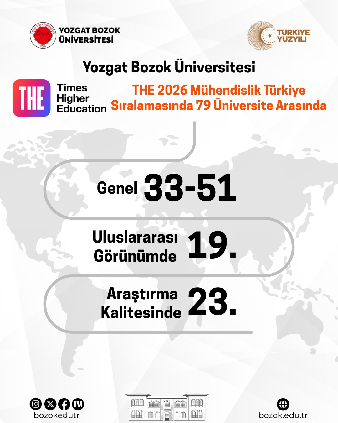 Mühendislik ve Teknoloji alanında istikrarlı gelişimini sürdüren Yozgat Bozok Üniversitesi, 98 ülkeden 1555 üniversitenin değerlendirildiği sıralamada dünya genelinde 1001–1250 bandında yer aldı.