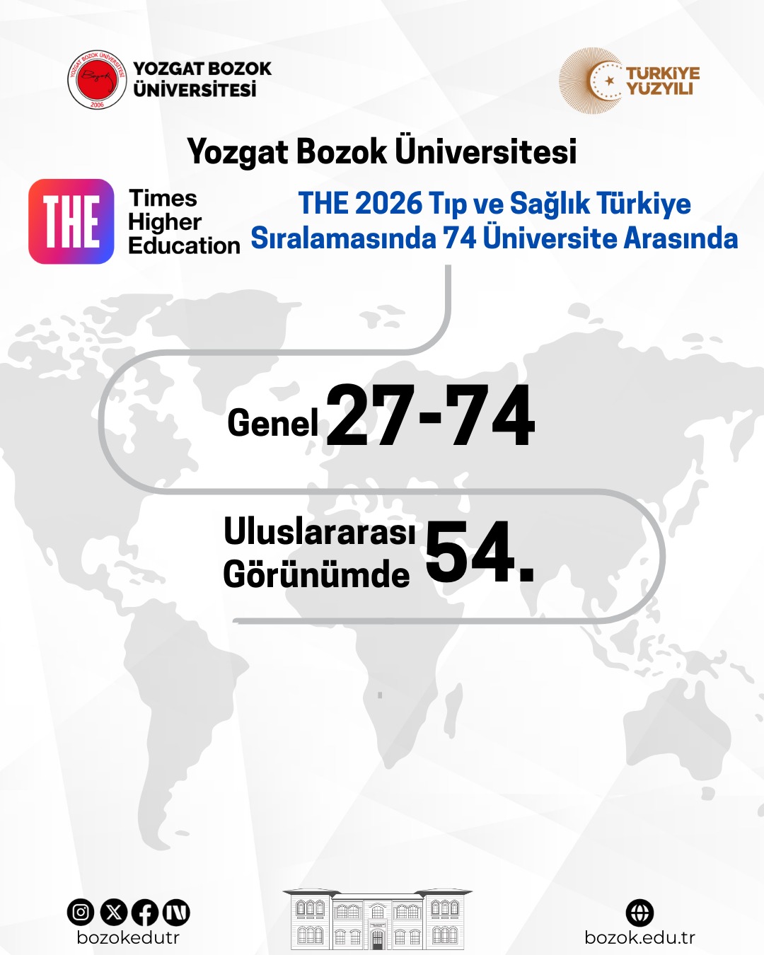 Tıp Fakültesi ve sağlık bilimleri alanındaki çalışmalarıyla öne çıkan Yozgat Bozok Üniversitesi, Tıp ve Sağlık Bilimleri (Medical and Health) alanında da THE 2026 sıralamasında yer alma başarısı gösterdi. Dünya genelinde 102 ülkeden 1230 üniversitenin değerlendirildiği bu alanda Üniversitemiz, 1001+ bandında listelendi.