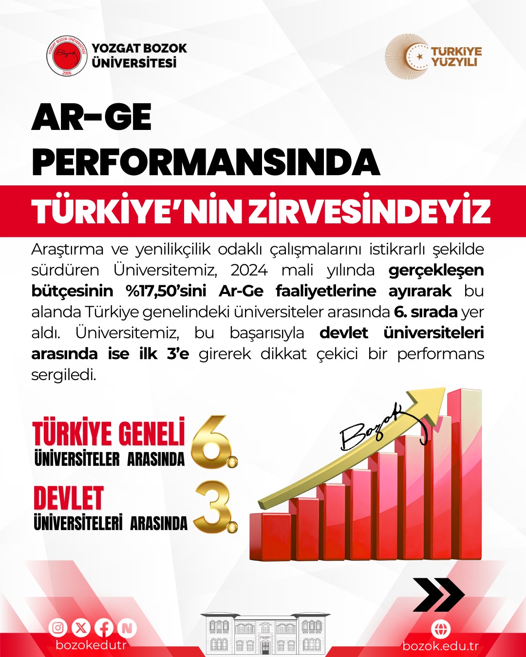 Araştırma ve yenilikçilik odaklı çalışmalarını istikrarlı şekilde sürdüren Üniversitemiz, 2024 mali yılında gerçekleşen bütçesinin %17,50’sini Ar-Ge faaliyetlerine ayırarak bu alanda Türkiye genelindeki üniversiteler arasında 6. sırada yer aldı. Üniversitemiz, bu başarısıyla devlet üniversiteleri arasında ise ilk 3’e girerek dikkat çekici bir performans sergiledi.