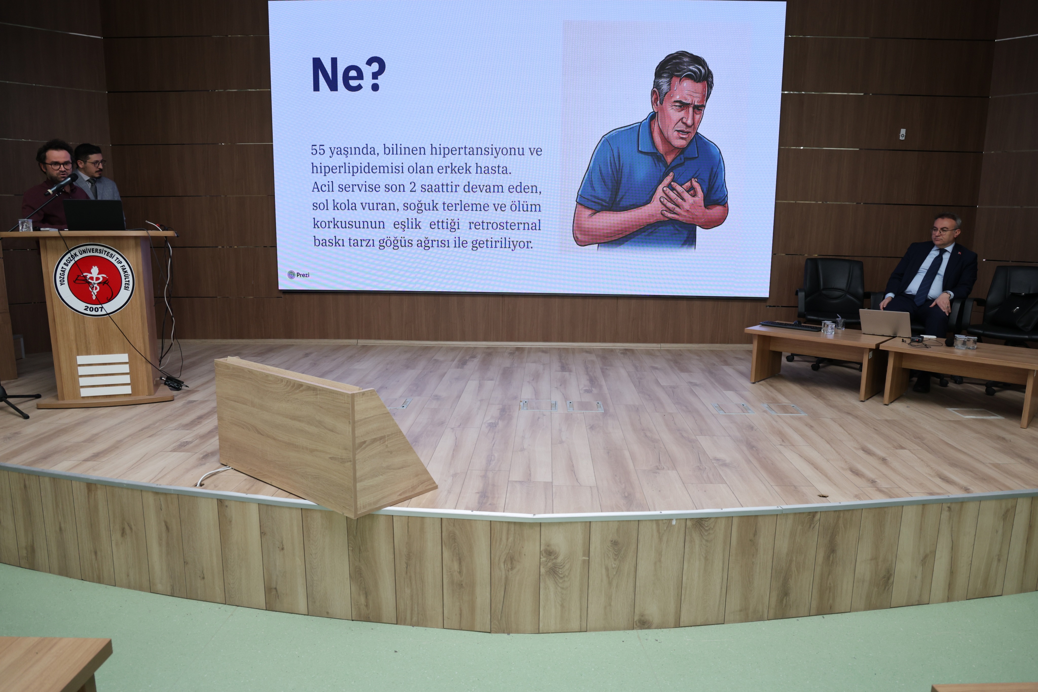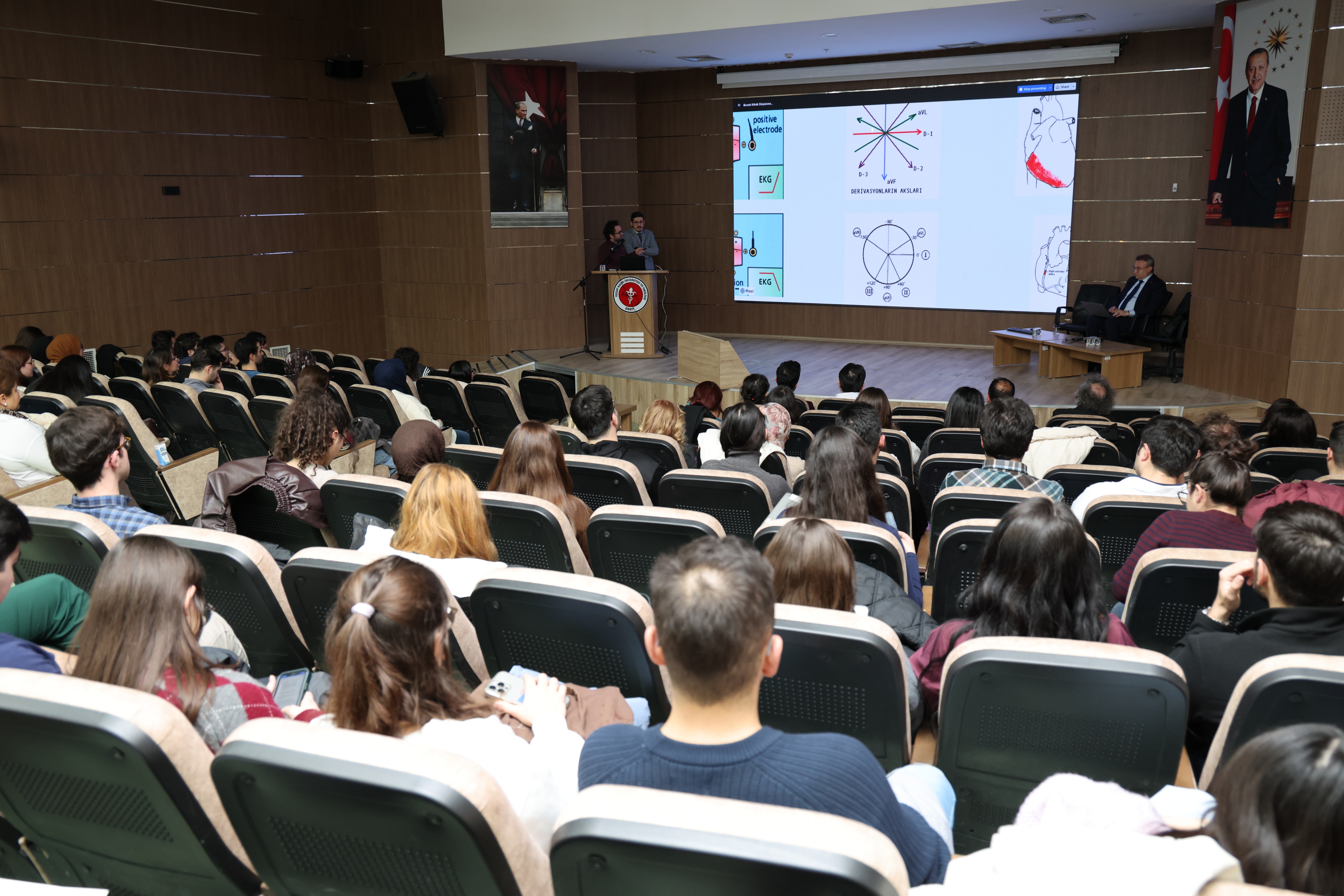 Rektörümüz Prof. Dr. Evren Yaşar'ın moderatörlüğünü üstlendiği etkinlikte, Tıp Fakültesi Öğretim Üyeleri Doç. Dr. Orhan Karayiğit ve Dr. Öğr. Üyesi Salih Adil Berktaş tarafından yapılan sunumlarla "Akut Miyokart Enfarktüsü" konusu ele alındı.